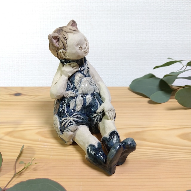 size 8cm×13cm×11.5cm(H) ※各サイズは最大値となっております こちらはレリーフ技法を用いて、陶土での成形中に平面上に形態を盛り上げて起伏を与えたり、平面を彫り込んだりして、立体的な模様をデザインしたシリーズです。 尻尾のある猫みみ髪型の男の子で、縁起物でもある「金魚」をデザインした衣装を着せてみました。 作品について・・・ ひとりずつ手作りしている、てびねりの陶人形です。 素材は陶土を使用しています。 瞳や衣装の一部分にポイントで薄く透明釉をかけているので、その部分は少し光沢があります。 その他の部分は釉薬を使用していないので、表面は少しザラザラしています。 ・・ご購入の際の注意点・・ ・作品はすべて素焼き(800℃)、本焼き(1250℃)と灯油窯で焼成しています。 ・地域によって配送料金が異なります。 ・ご購入前に作品の「サイズ」や「素材」を十分にご確認頂きますようお願い致します。 ・画面上と実物では色が異なって見える場合があります。ご不明な点がありましたら、お問い合わせください。 ・この作品は、他のサイト、イベントや展示会でも販売することもありますので、ご注文いただいた時点で在庫切れとなってしまっていることもあります。 販売済み作品はできるだけ速やかに表示切替するように心がけますが、その時はどうぞご了承ください。