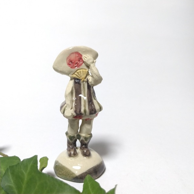 size 3cm×3cm×8.5cm(H) 土台の底面サイズは直径約3cm ※横と縦(奥行)の長さは最大値となっています ひとりずつ手作りしている手びねりの陶人形ですので、すべて一点ものとなります。 素材は陶土を使用しています。 身近にあるモノやコトなどを、ちび人形に擬人化してみたシリーズです。 普段はそれぞれに存在しているモノたちですが、同じようなサイズ感で並べると、みんな友達になってしまうような、そんな世界観を作りたくて制作してみました。 土台と衣装の一部分にポイントで薄く透明釉をかけているので、その部分は少し光沢があります。 その他の部分は釉薬を使用していないので、表面は少しザラザラしています。 ・・ご購入の際の注意点・・ ・作品はすべて素焼き(800℃)、本焼き(1250℃)と灯油窯で焼成しています。 ・地域によって配送料金が異なります。 ・ご購入前に作品の「サイズ」や「素材」を十分にご確認頂きますようお願い致します。 ・画面上と実物では色が異なって見える場合があります。ご不明な点がありましたら、お問い合わせください。 ・この作品は、他のサイト、イベントや展示会でも販売することもありますので、ご注文いただいた時点で在庫切れとなってしまっていることもあります。 販売済み作品はできるだけ速やかに表示切替するように心がけますが、その時はどうぞご了承ください。
