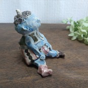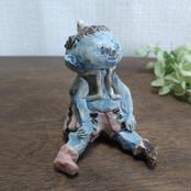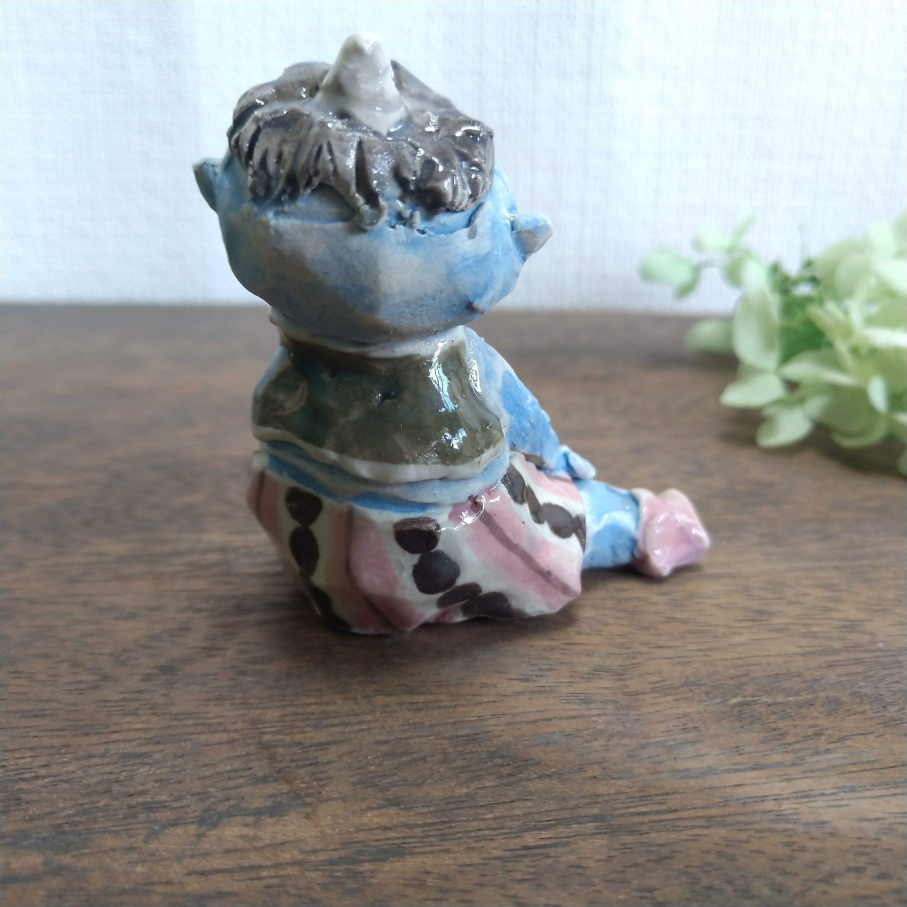 瞳や衣装、角などの一部分には薄く透明釉を施しているので、その部分は少し光沢があります。