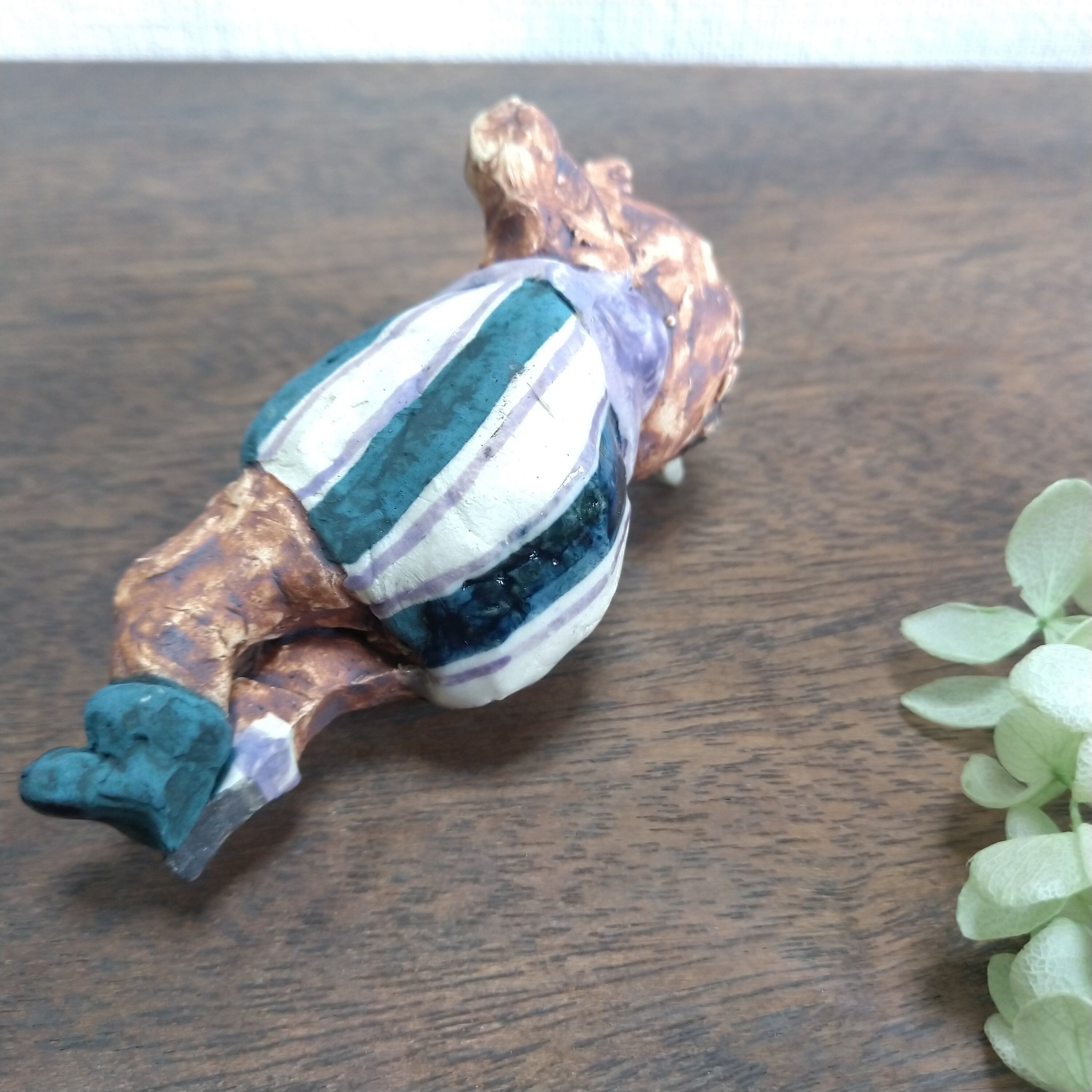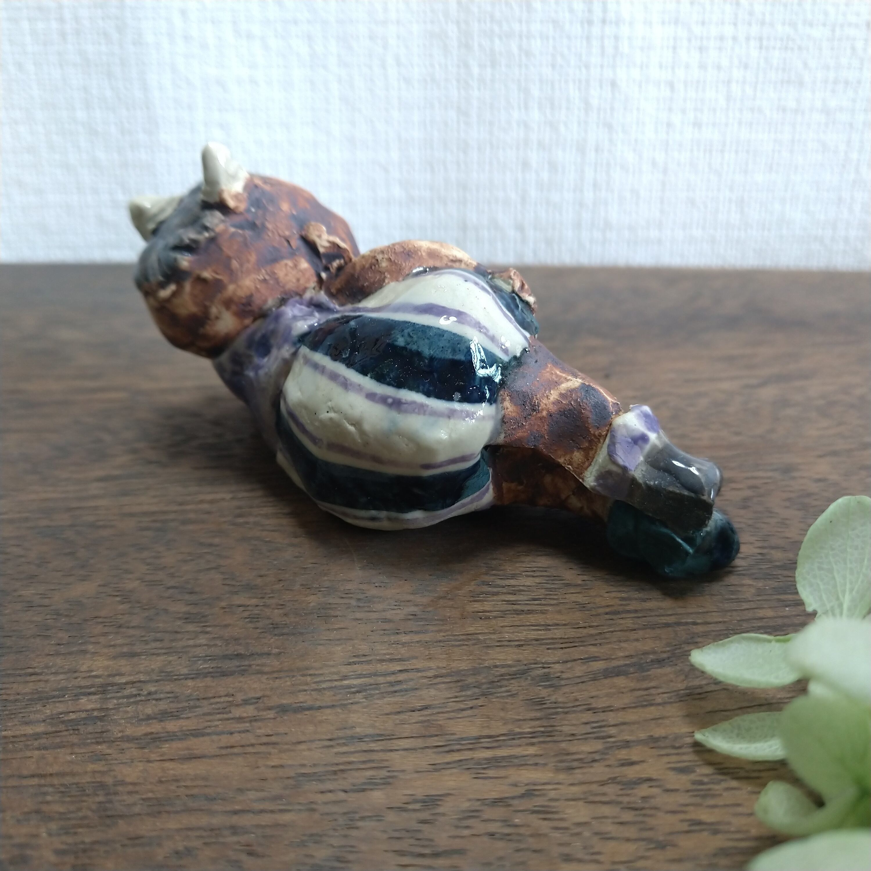 瞳や衣装、角などの一部分には薄く透明釉を施しているので、その部分は少し光沢があります。