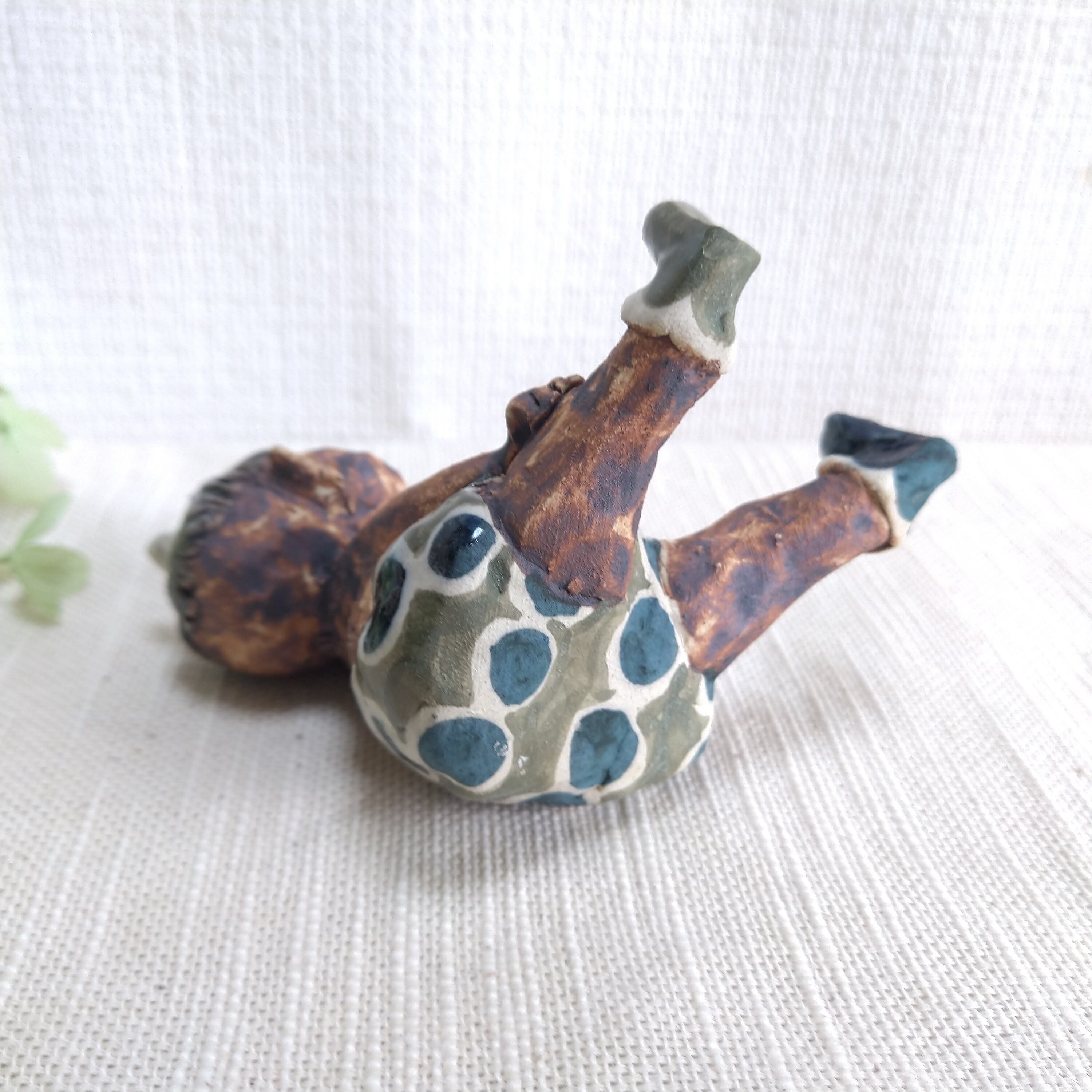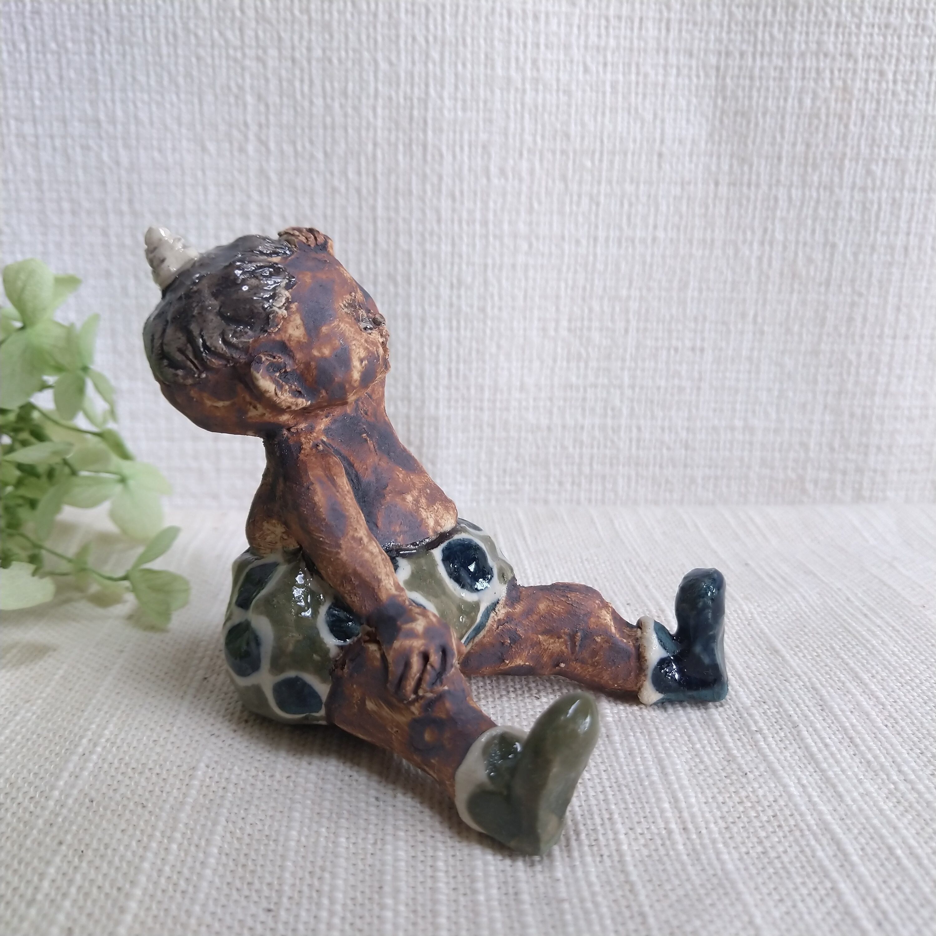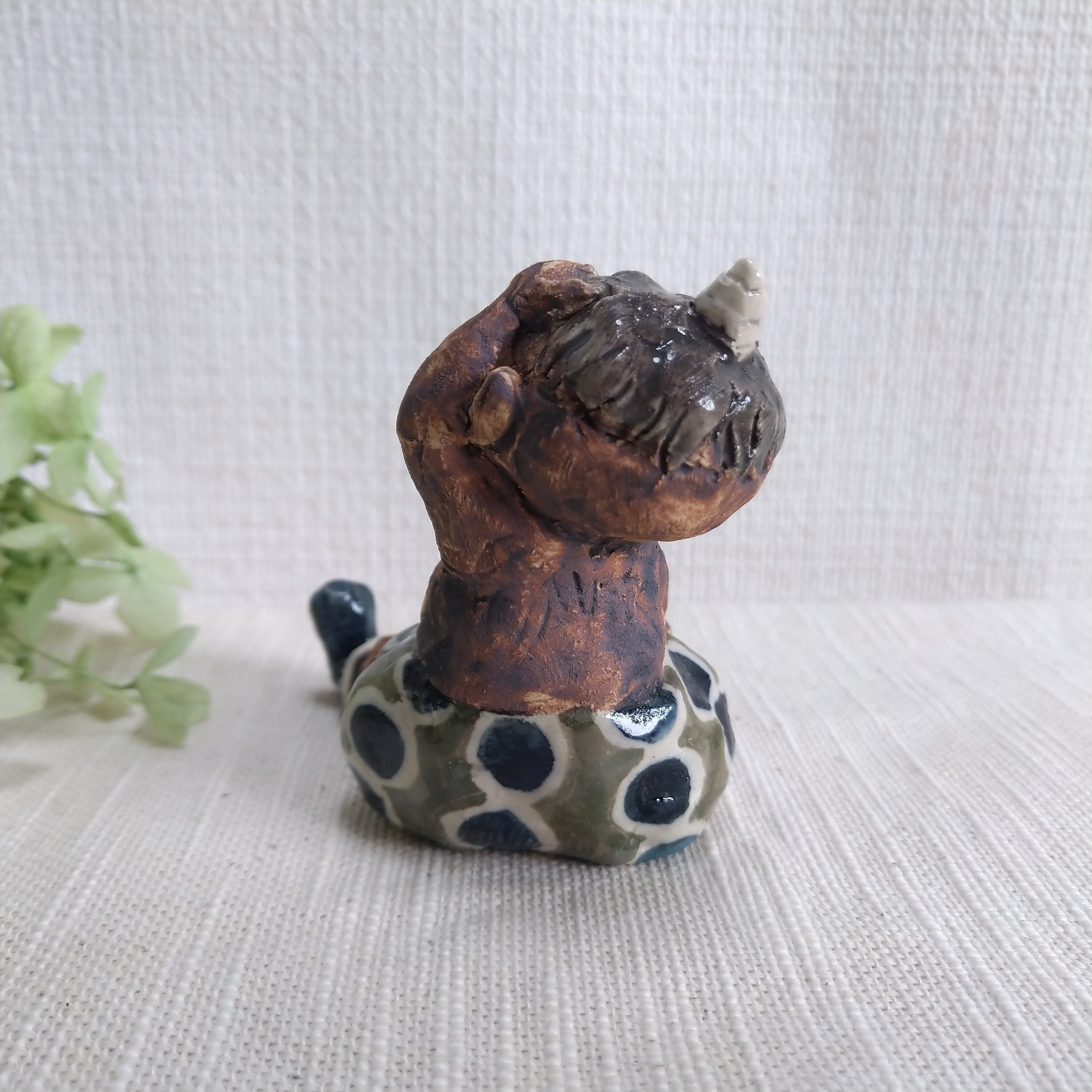 瞳や衣装、角などの一部分には薄く透明釉を施しているので、その部分は少し光沢があります。