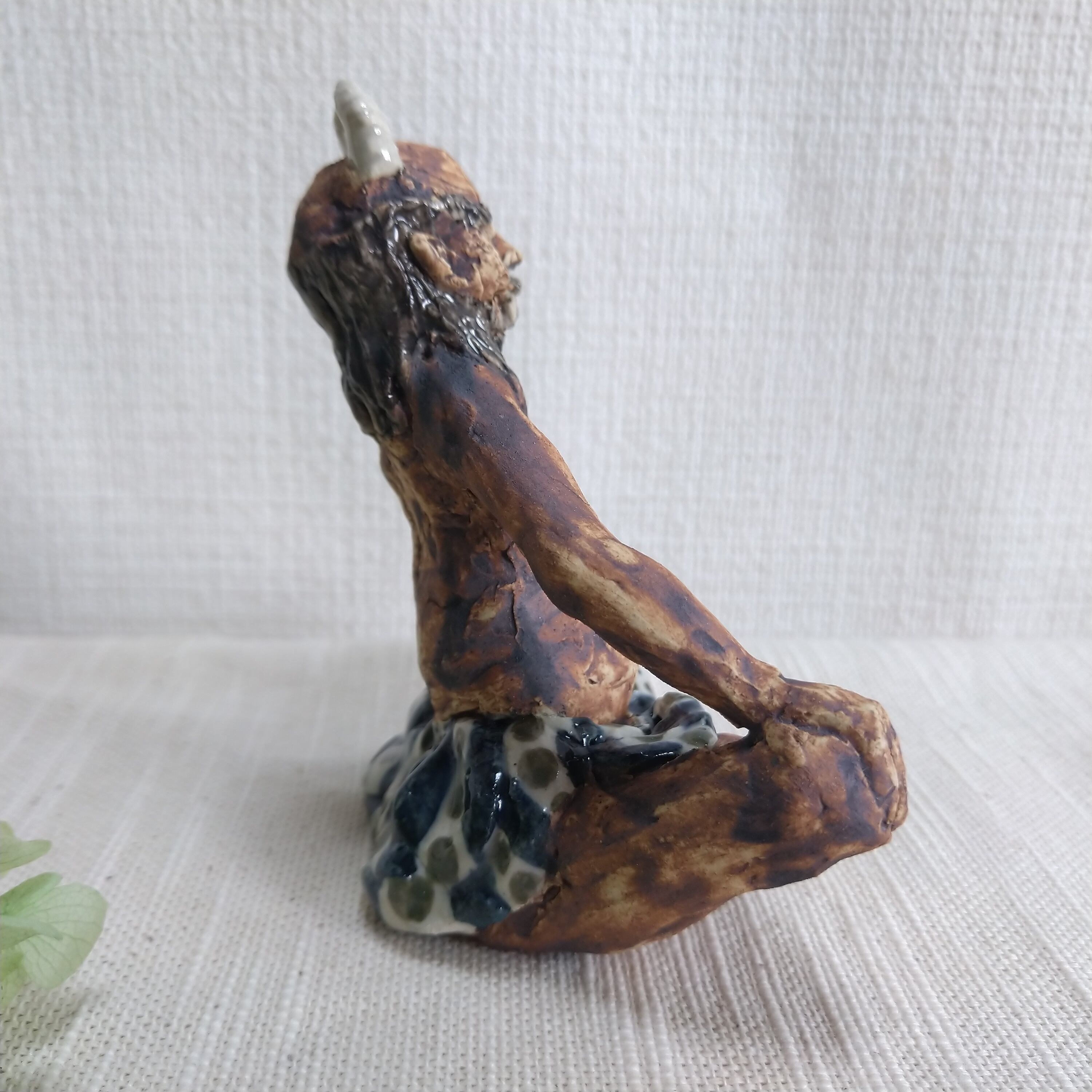 瞳や衣装、角などの一部分には薄く透明釉を施しているので、その部分は少し光沢があります。