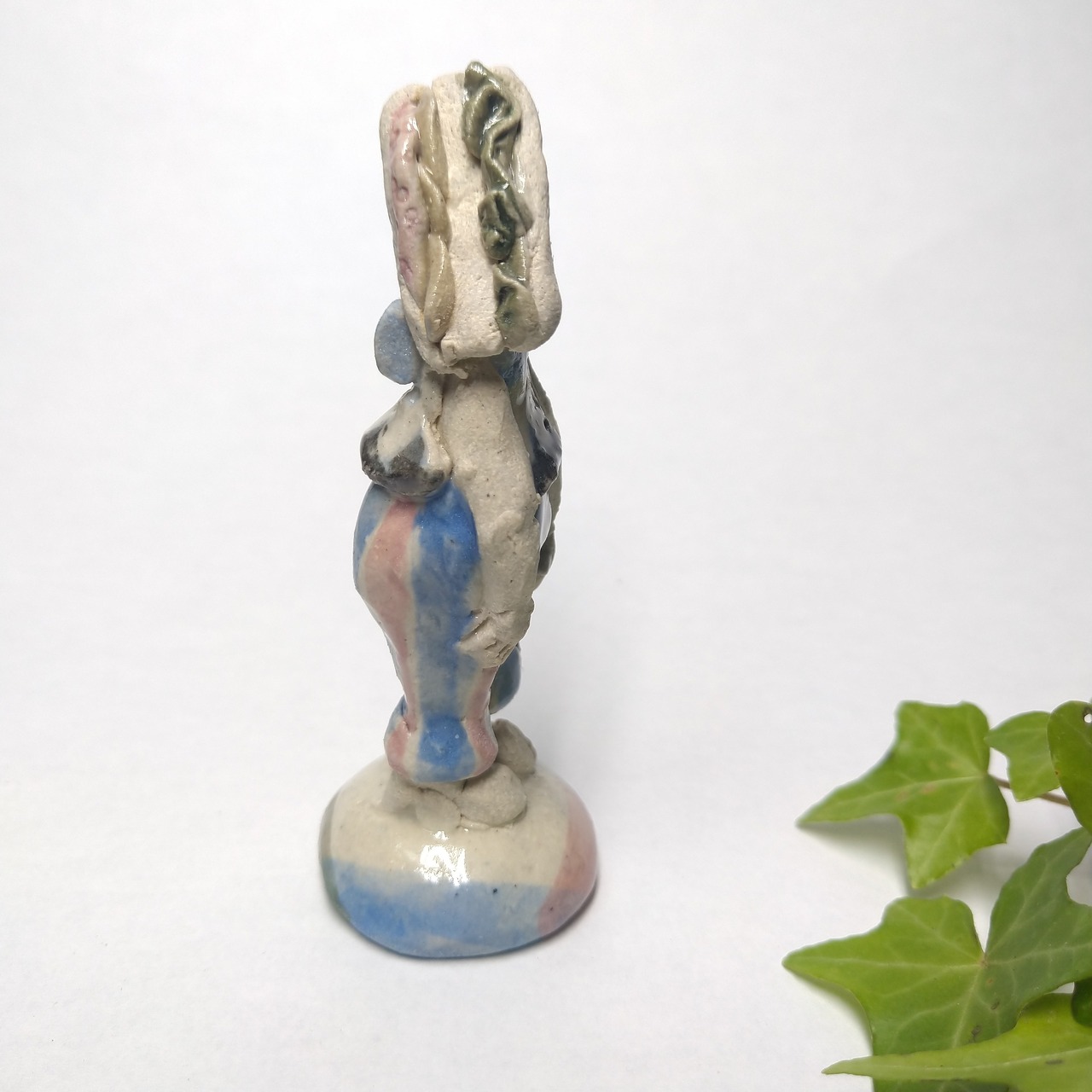 土台と衣装の一部分にポイントで薄く透明釉をかけているので、その部分は少し光沢があります。