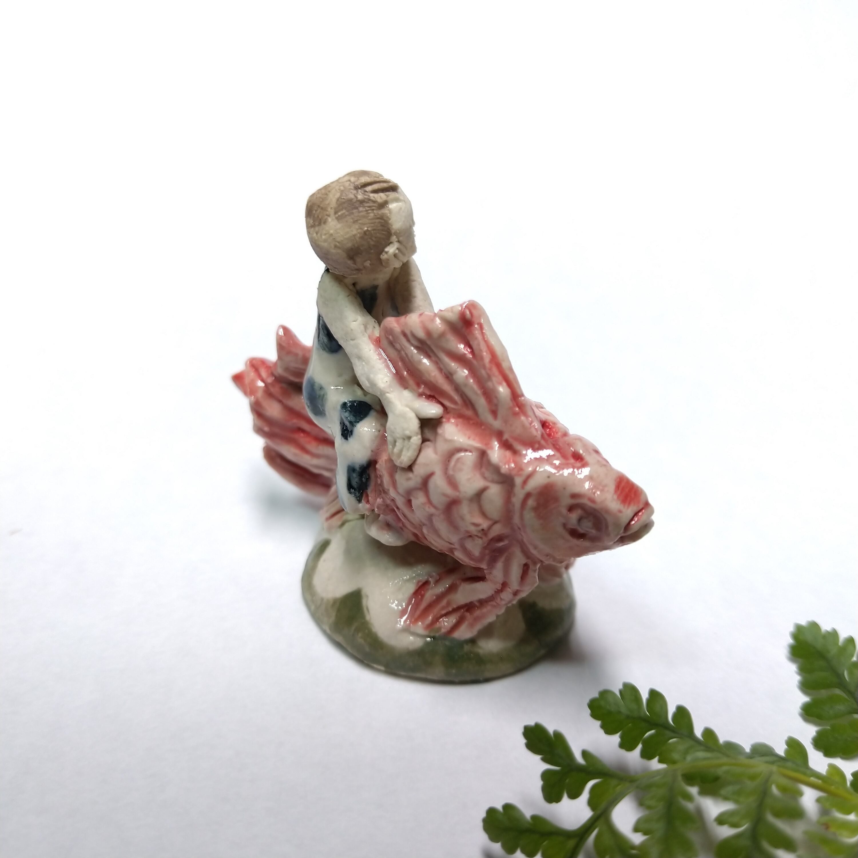 金魚や衣装、土台の一部分に薄く透明釉を施しているので、その部分は少し光沢があります。