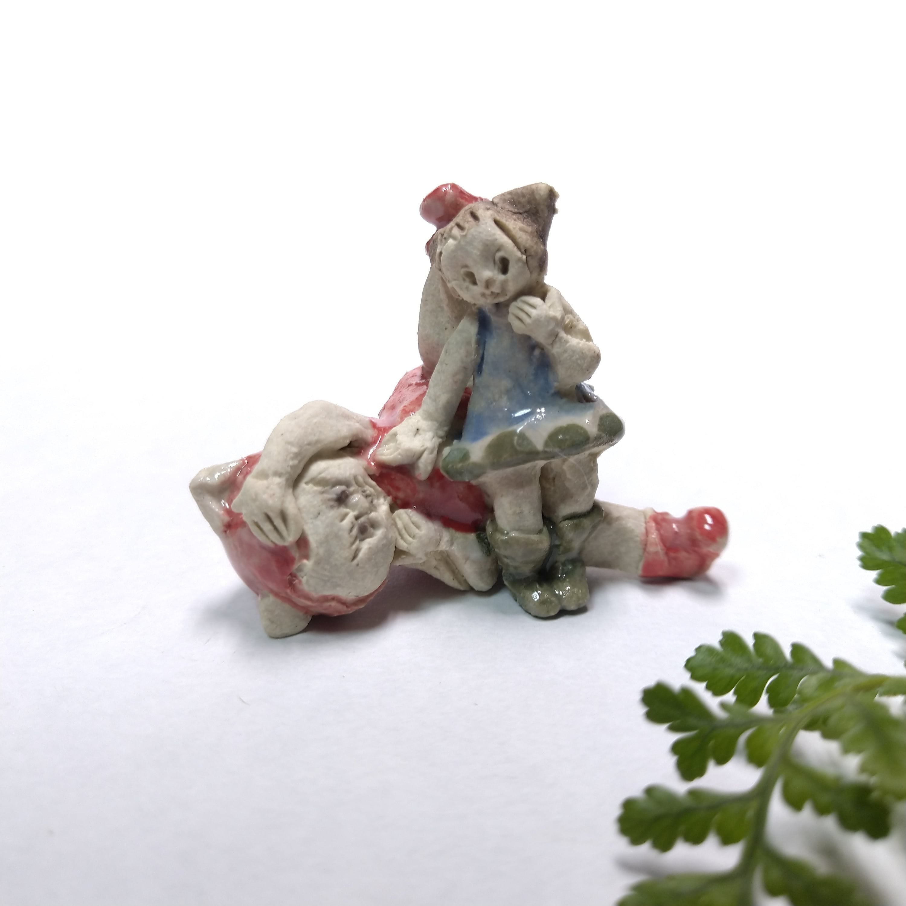 ごろんと寝転んだ縁起物のだるまに、ちびっこが寄り添っています。