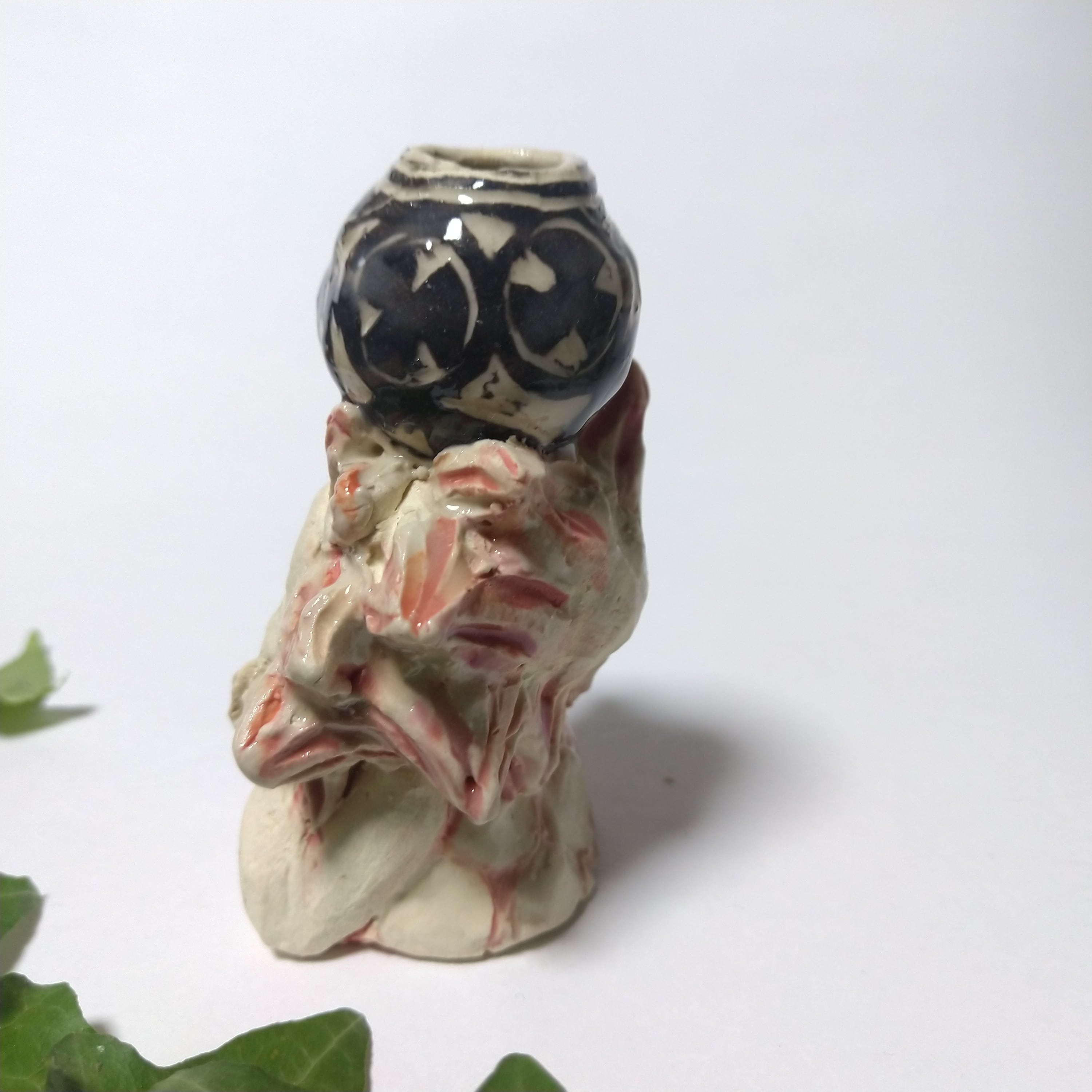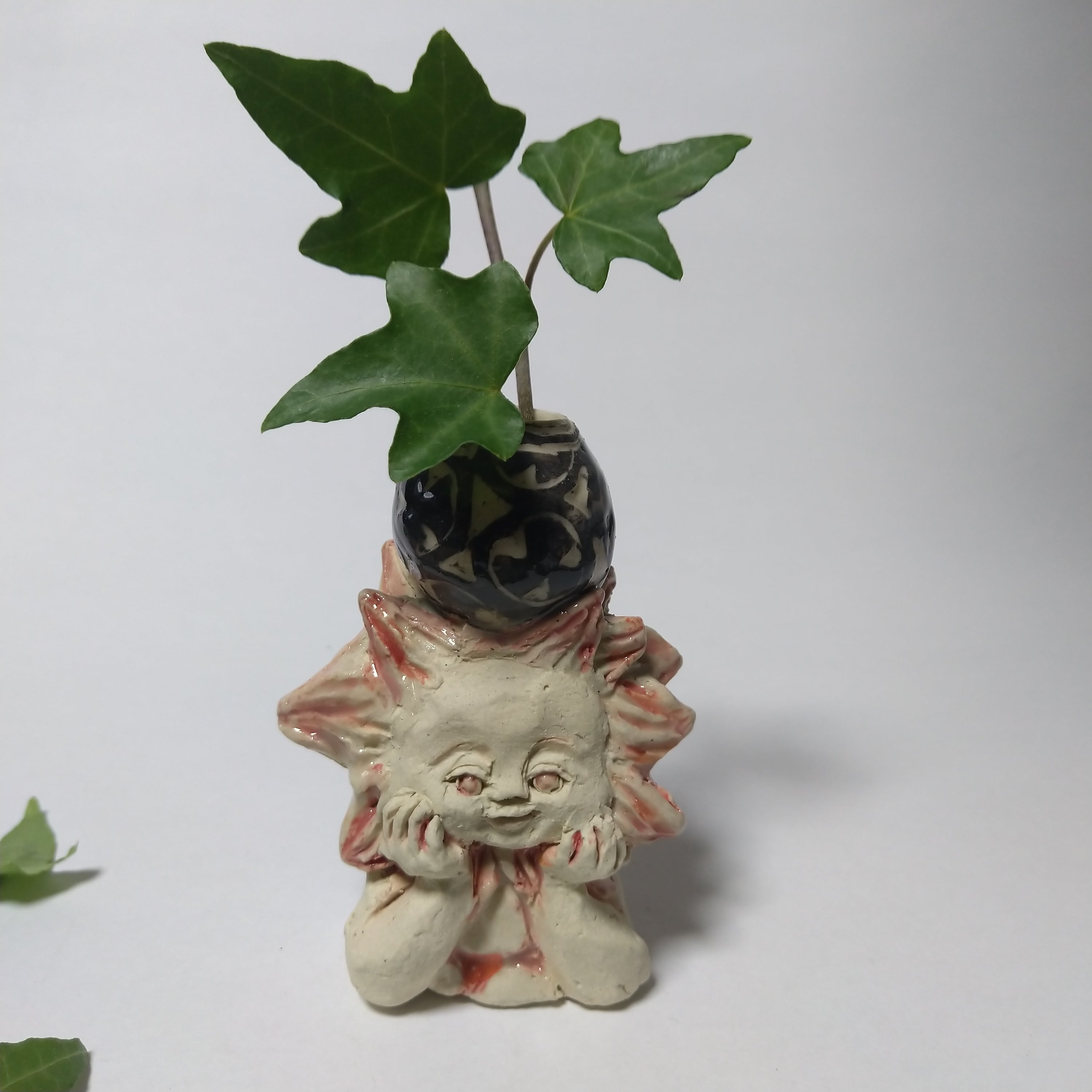 頭上に小さな花器をのせて頬杖をついている、お天気をモチーフにした陶人形を制作してみました。