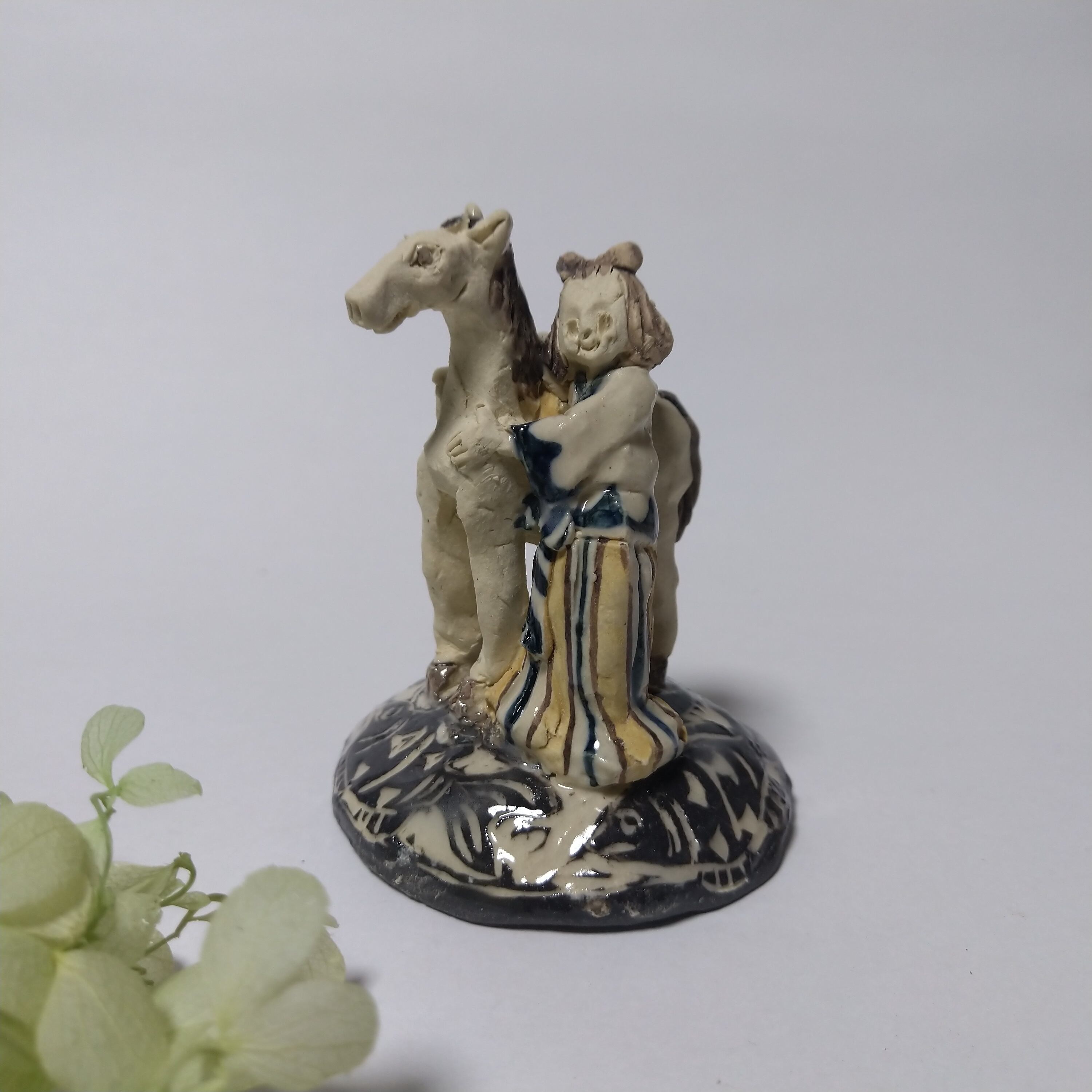 私の地元近く熊本県玉名郡和水町に、出土品の一部が国宝にも指定されている江田船山古墳という遺跡があることから、古墳時代の衣装を身に着けた人と、当時も人々との暮らしの中で重要な役割を担っていたであろう「馬」を組み合わせた干支人形を制作してみました。