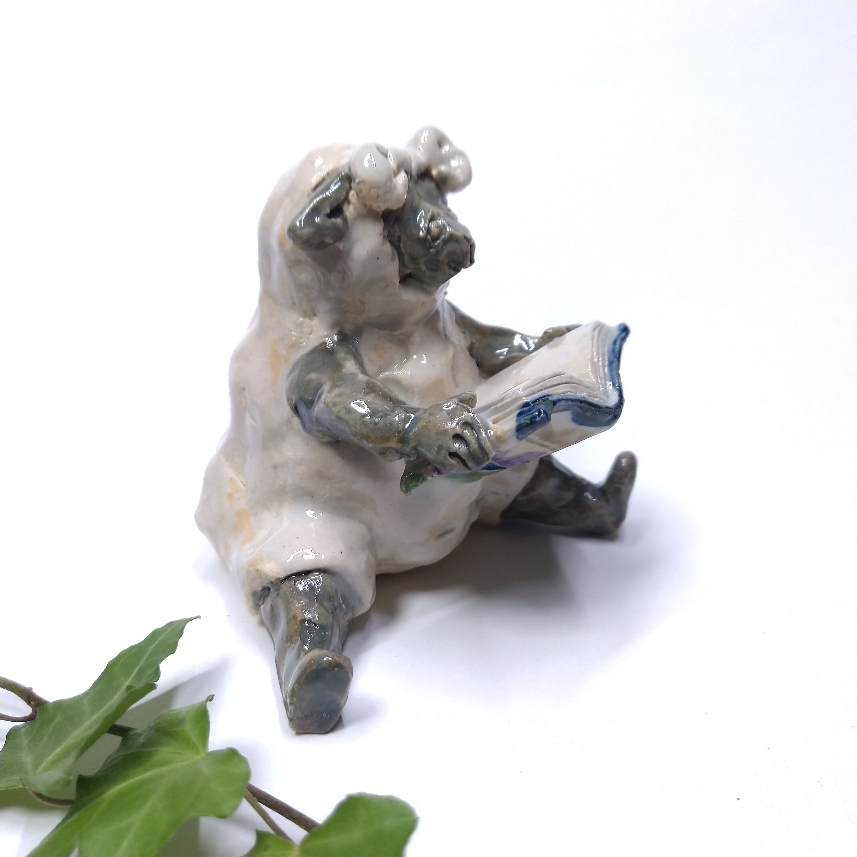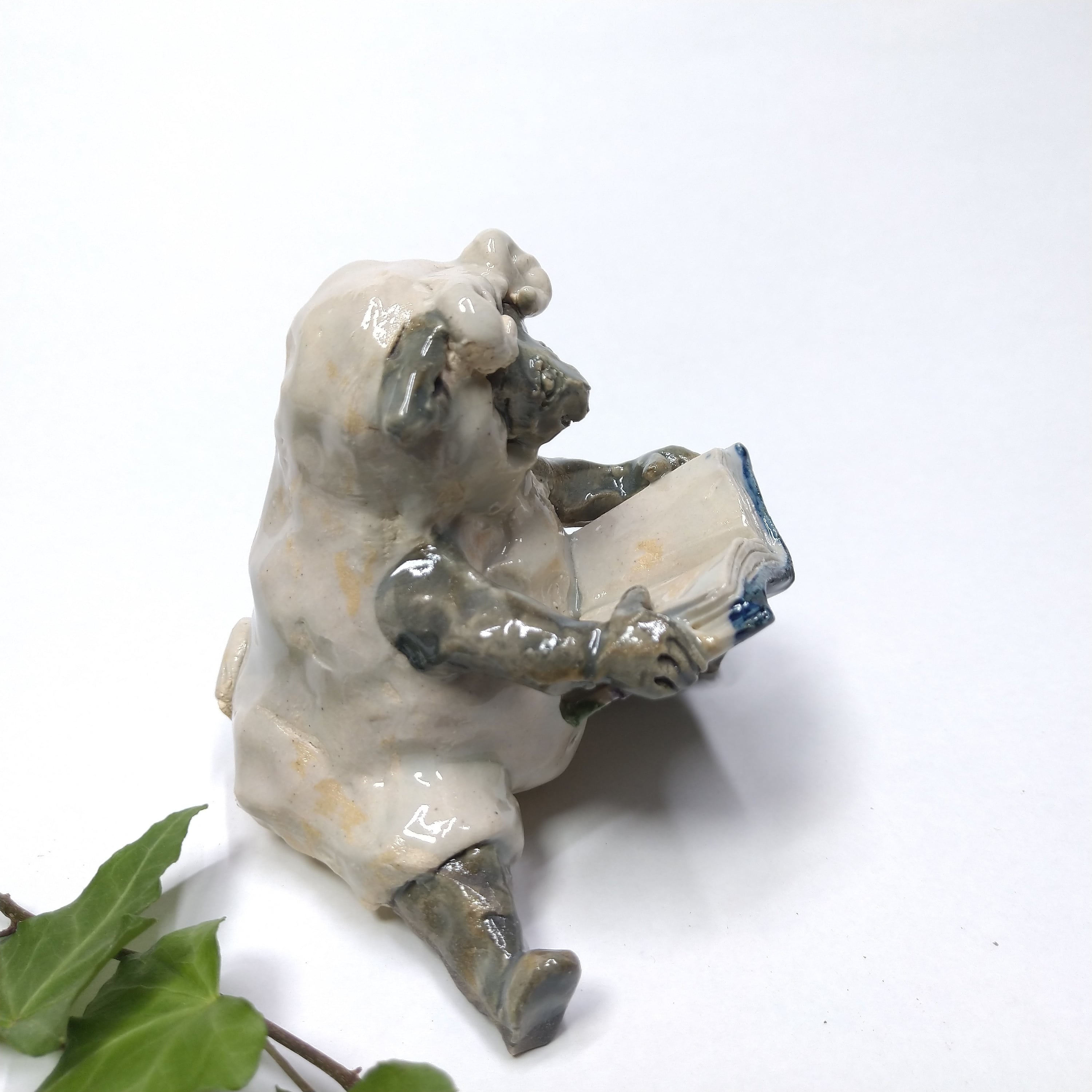 本や衣装、身体の一部に薄く透明釉を施しているので、その部分は少し光沢があります。