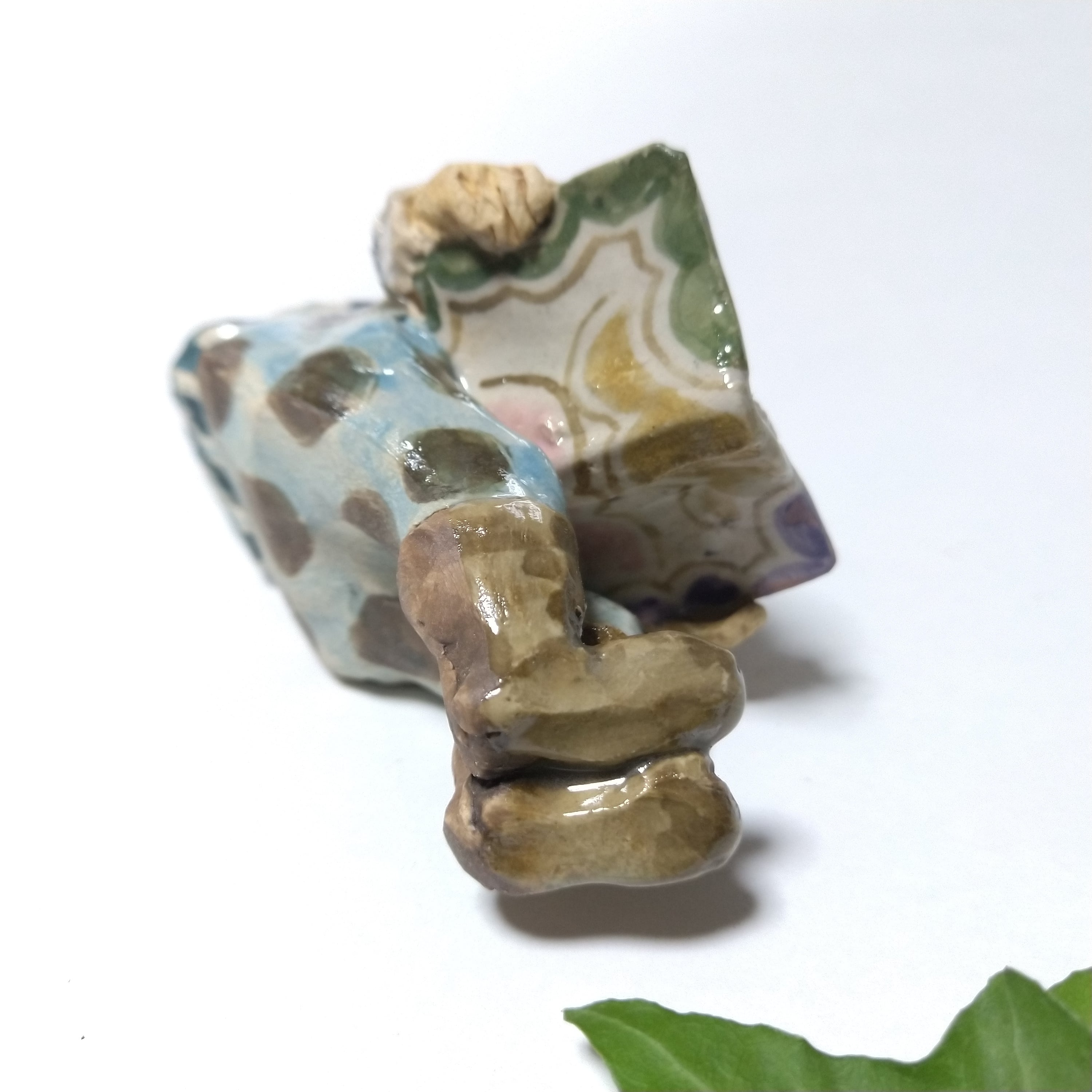 本や衣装、身体の一部に薄く透明釉を施しているので、その部分は少し光沢があります。