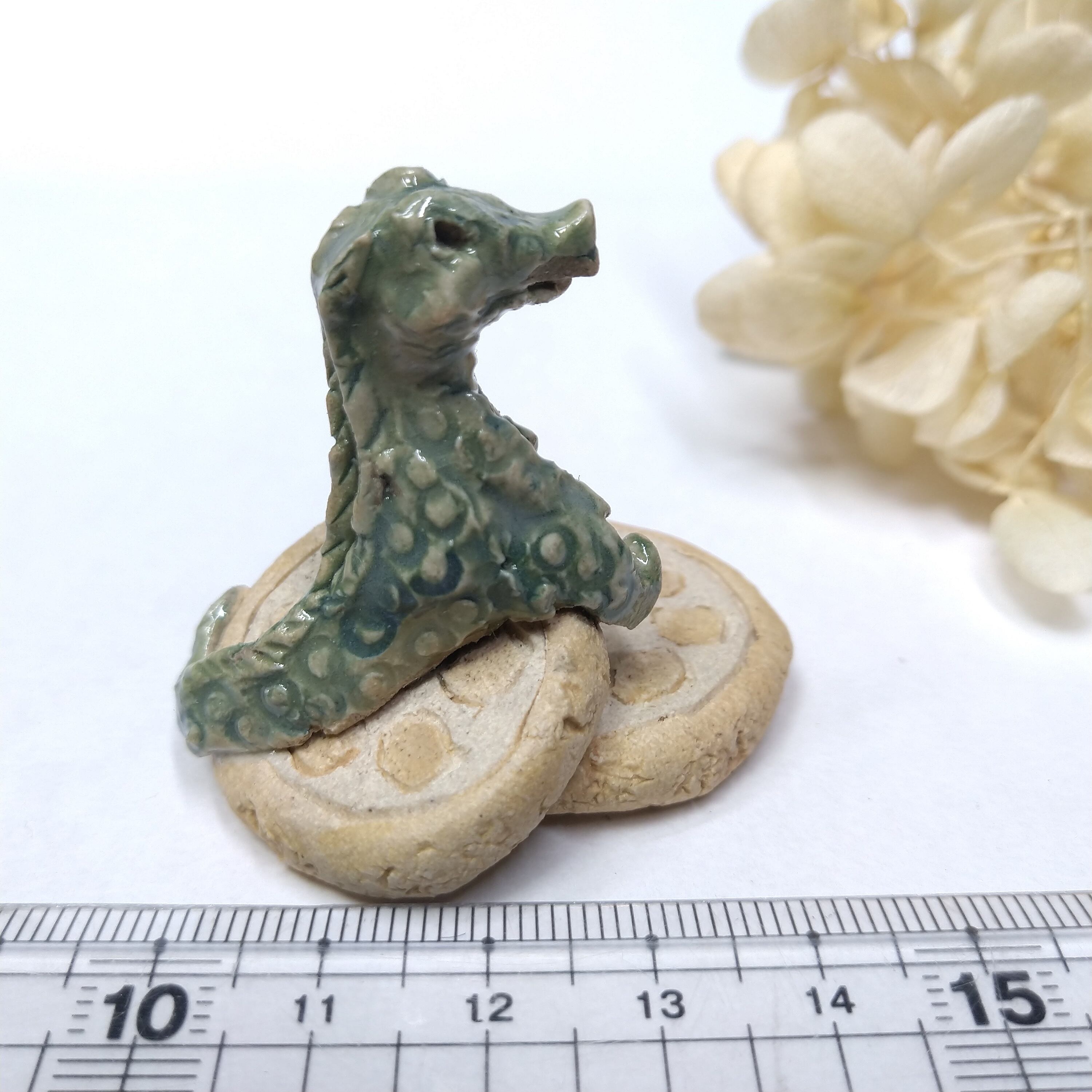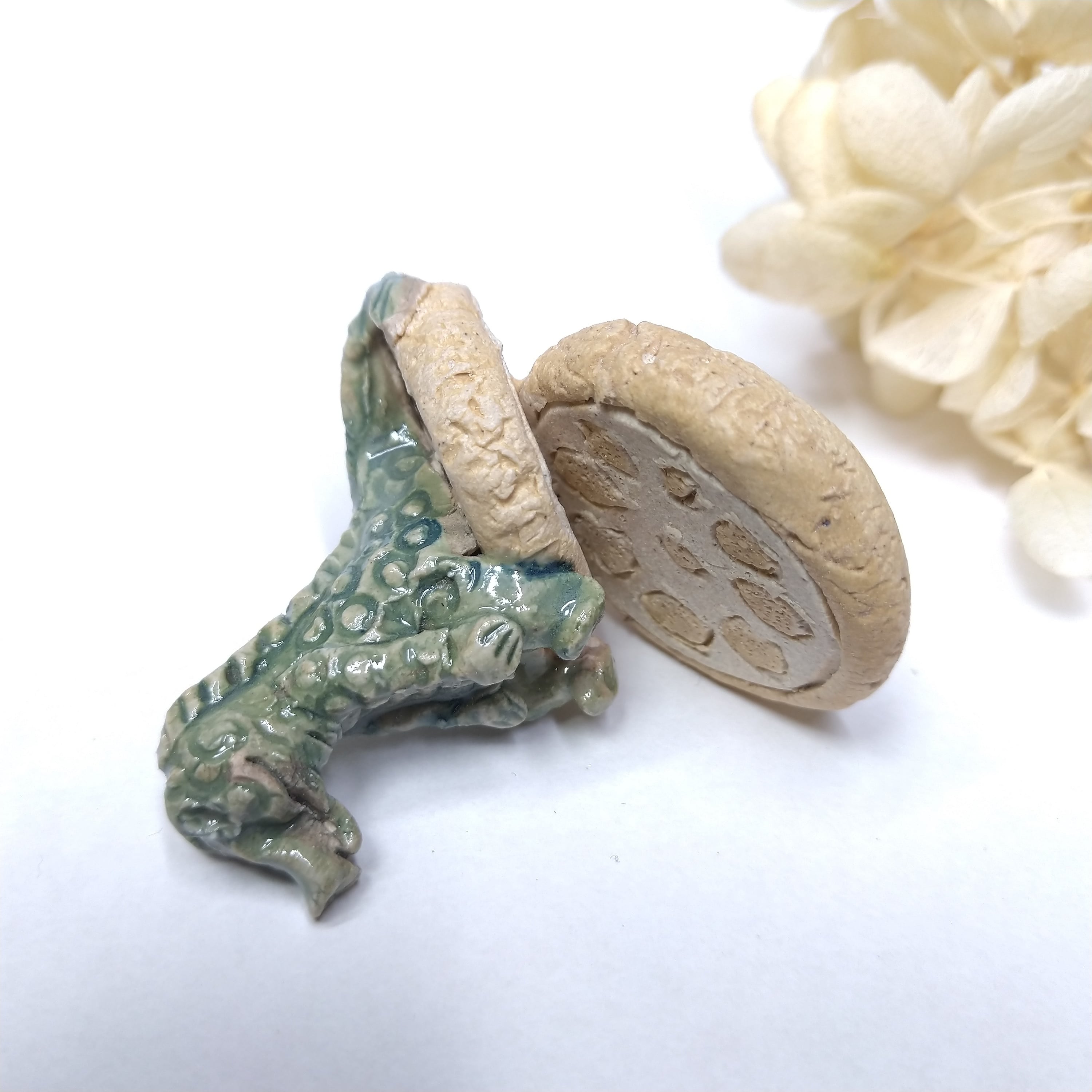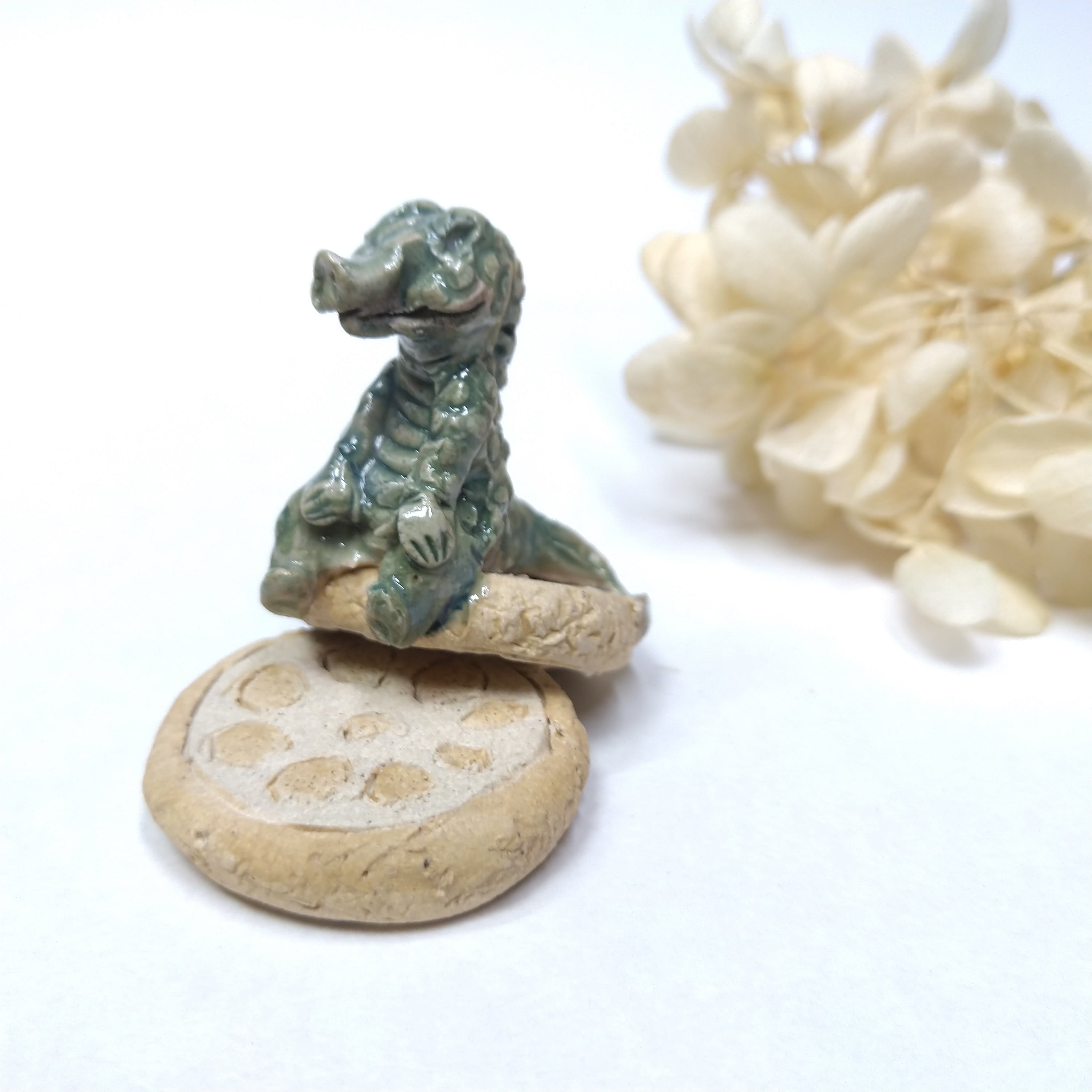ワニの身体部分に薄く透明釉を施しているので、その部分は少し光沢があります。