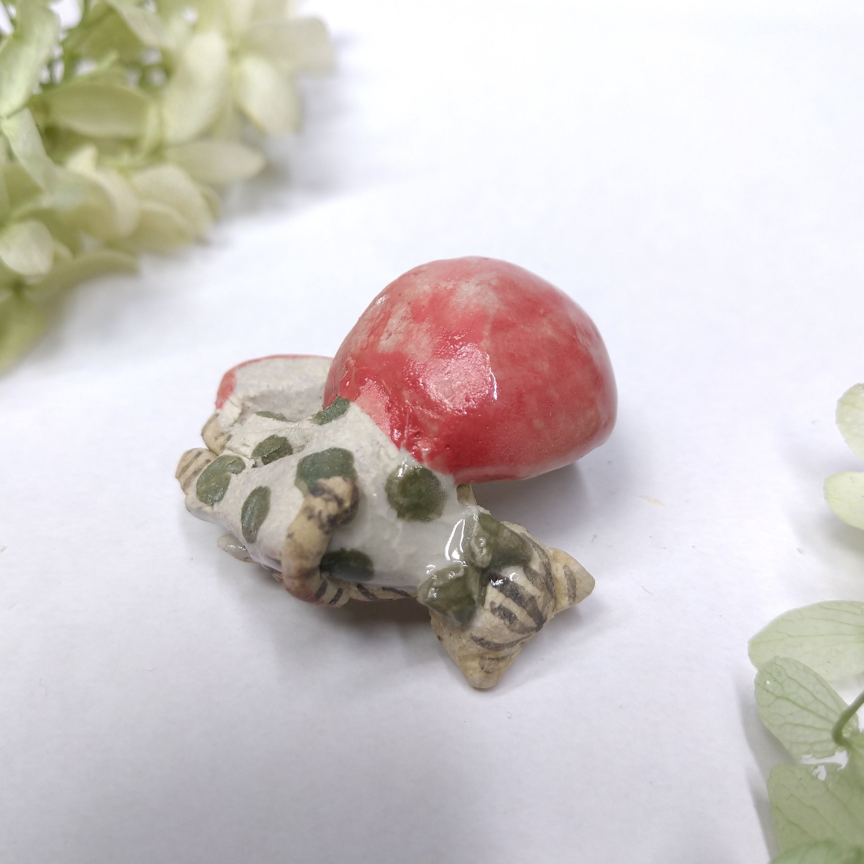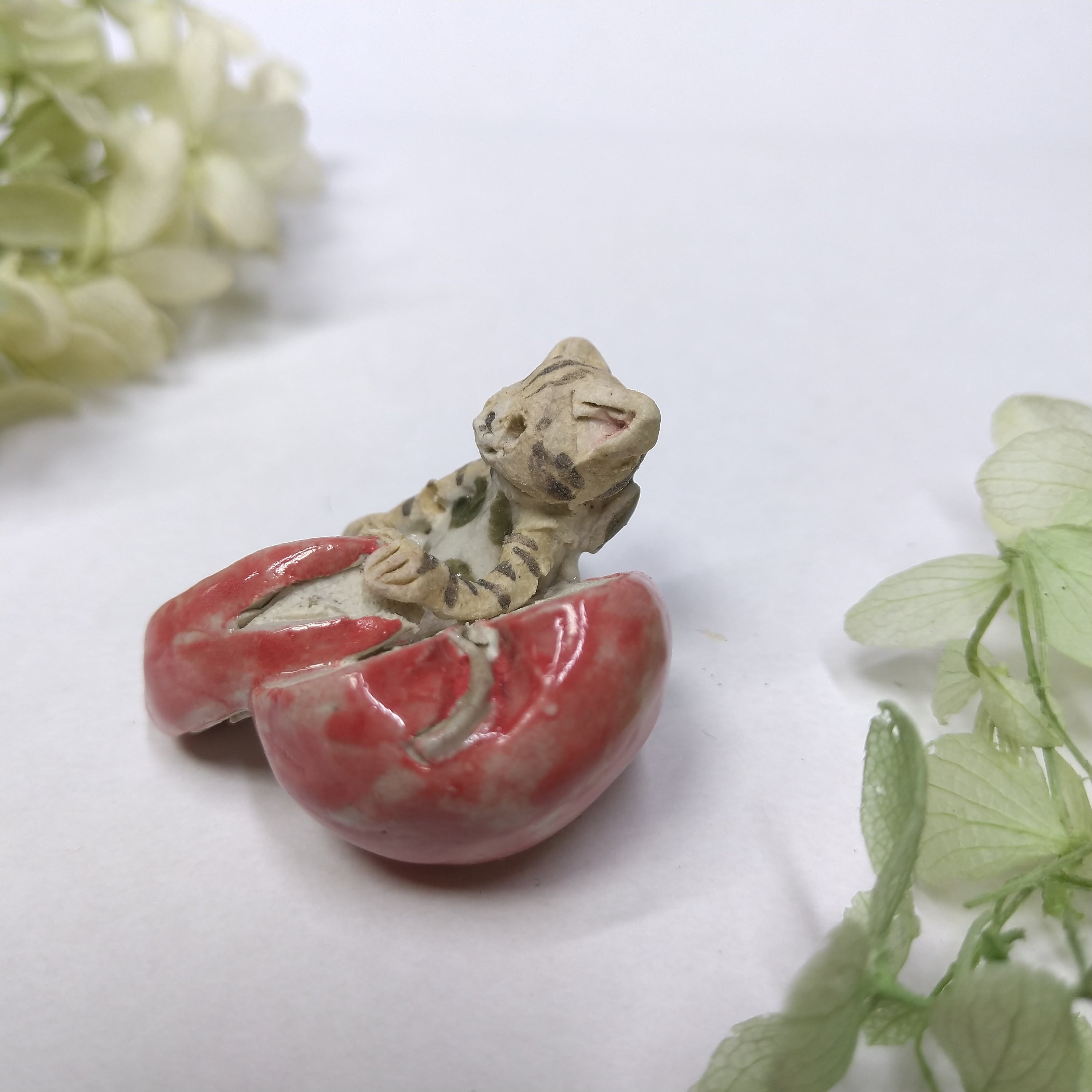 りんごの皮、衣装の一部分に薄く透明釉を施しているので、その部分は少し光沢があります。