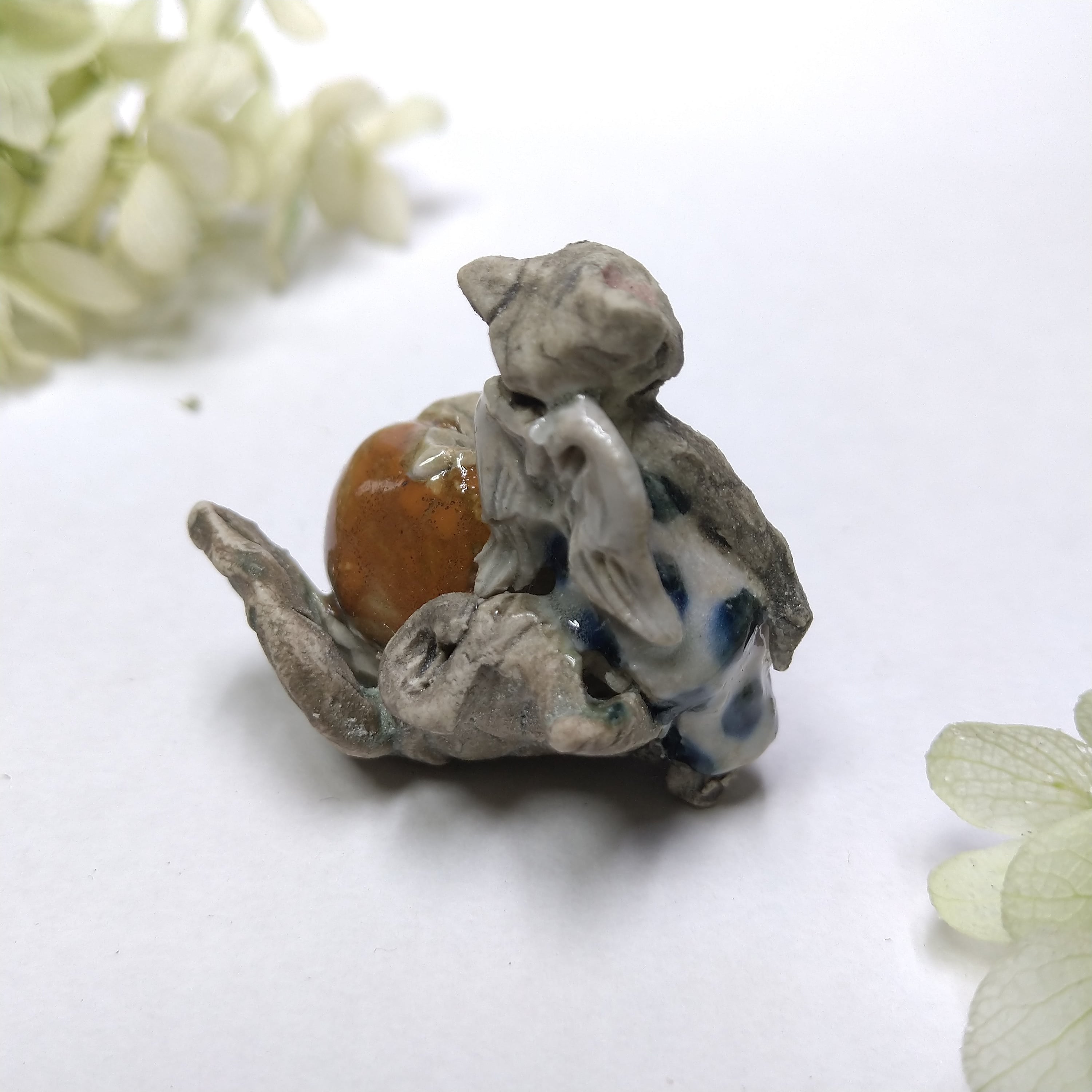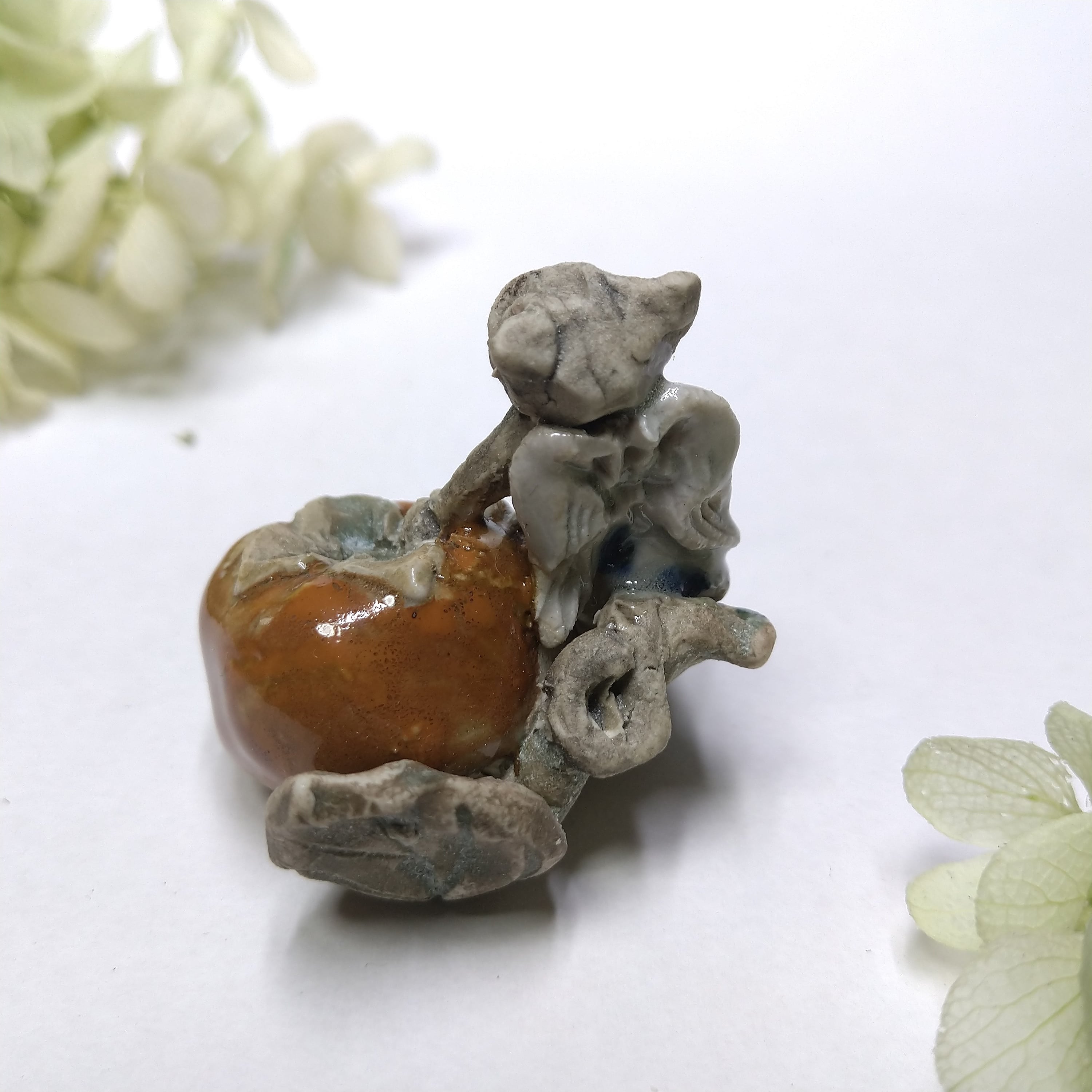 柿や羽根、衣装の一部分に薄く透明釉を施しているので、その部分は少し光沢があります。