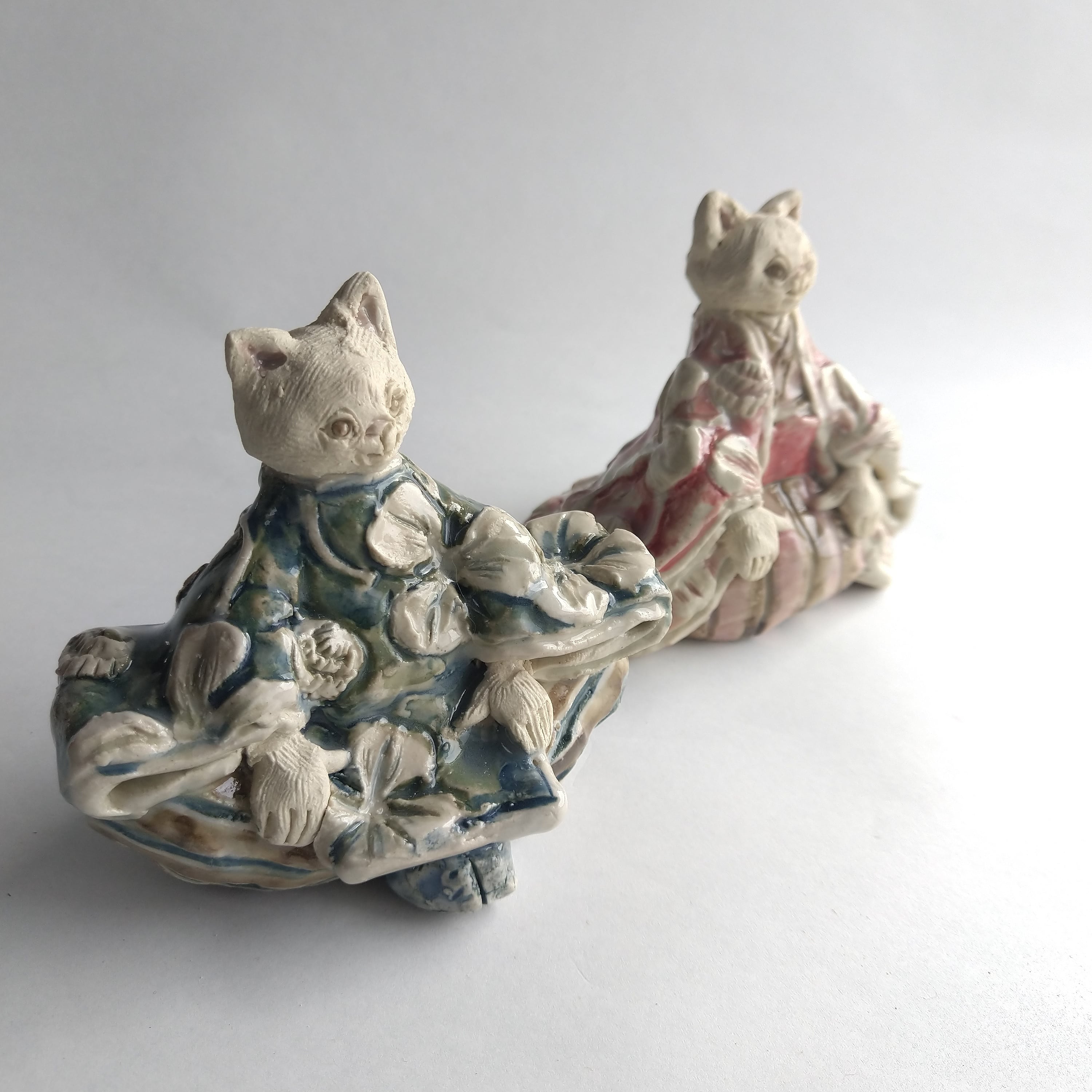 衣服の部分にはレリーフ技法を用いて、陶土での成形中に平面上に形態を盛り上げて起伏を与えたり、彫り込んだりして、立体的な模様をデザインしています。