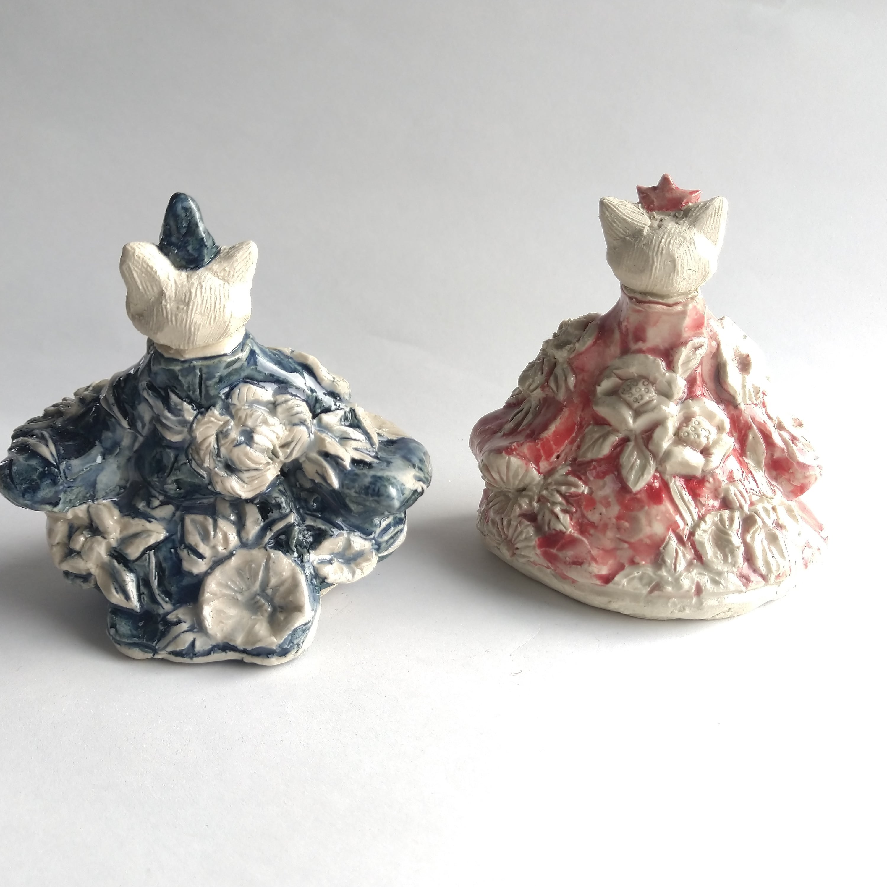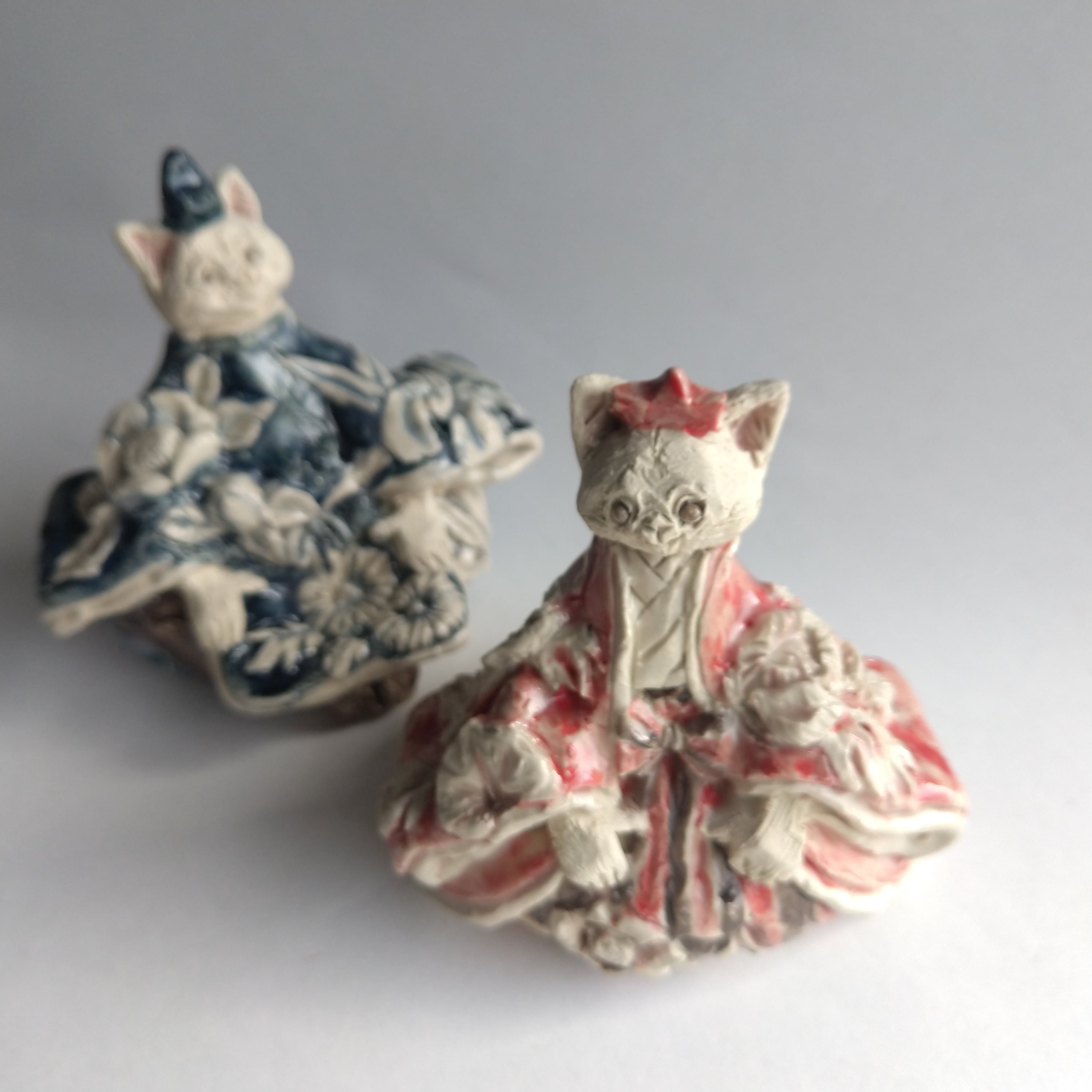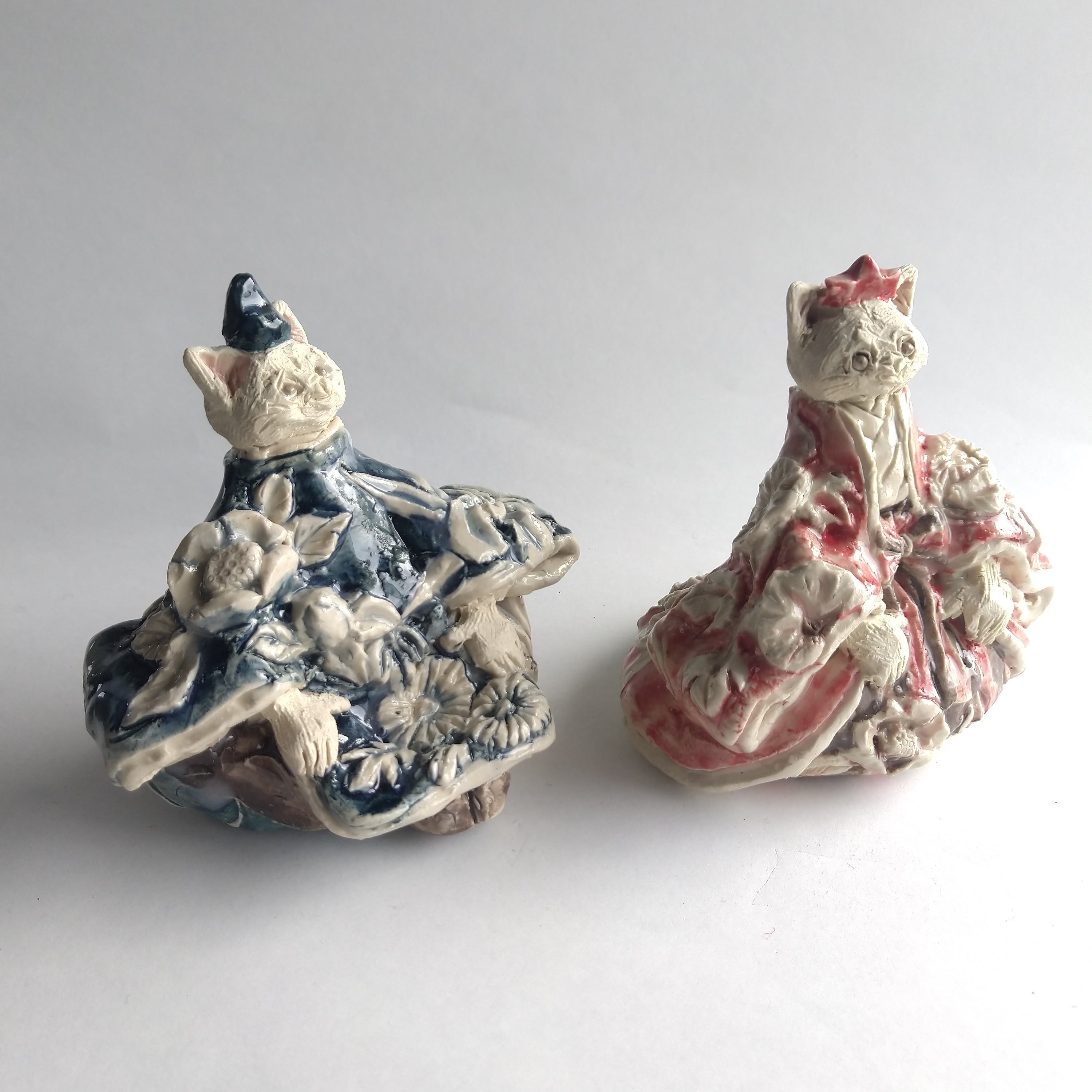 衣服の部分にはレリーフ技法を用いて、陶土での成形中に平面上に形態を盛り上げて起伏を与えたり、彫り込んだりして、立体的な模様をデザインしています。
