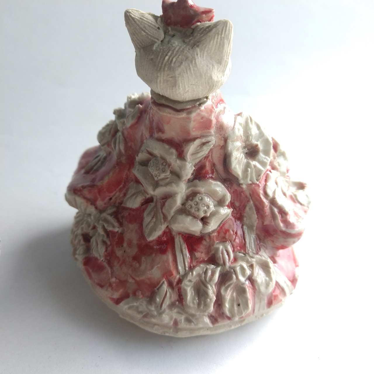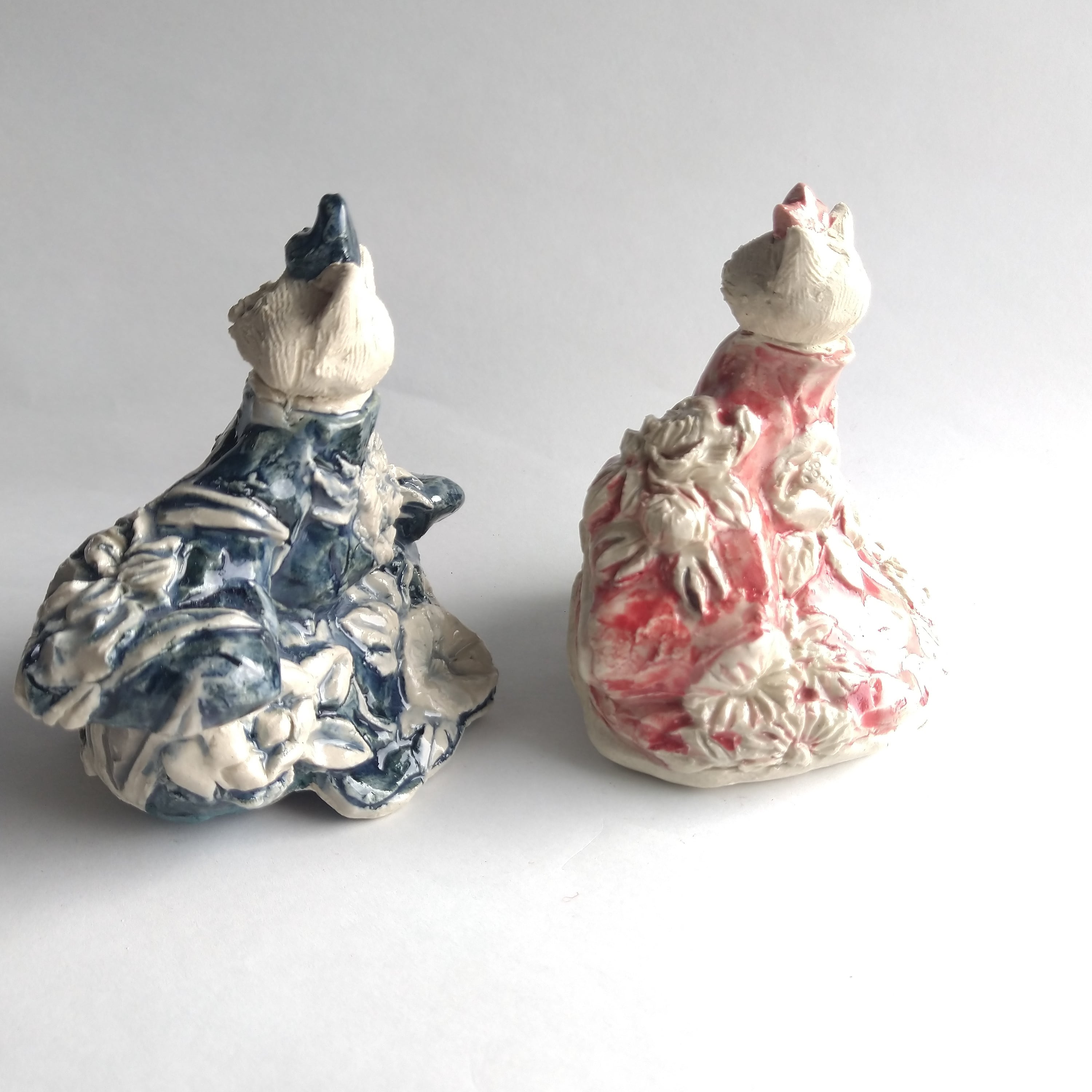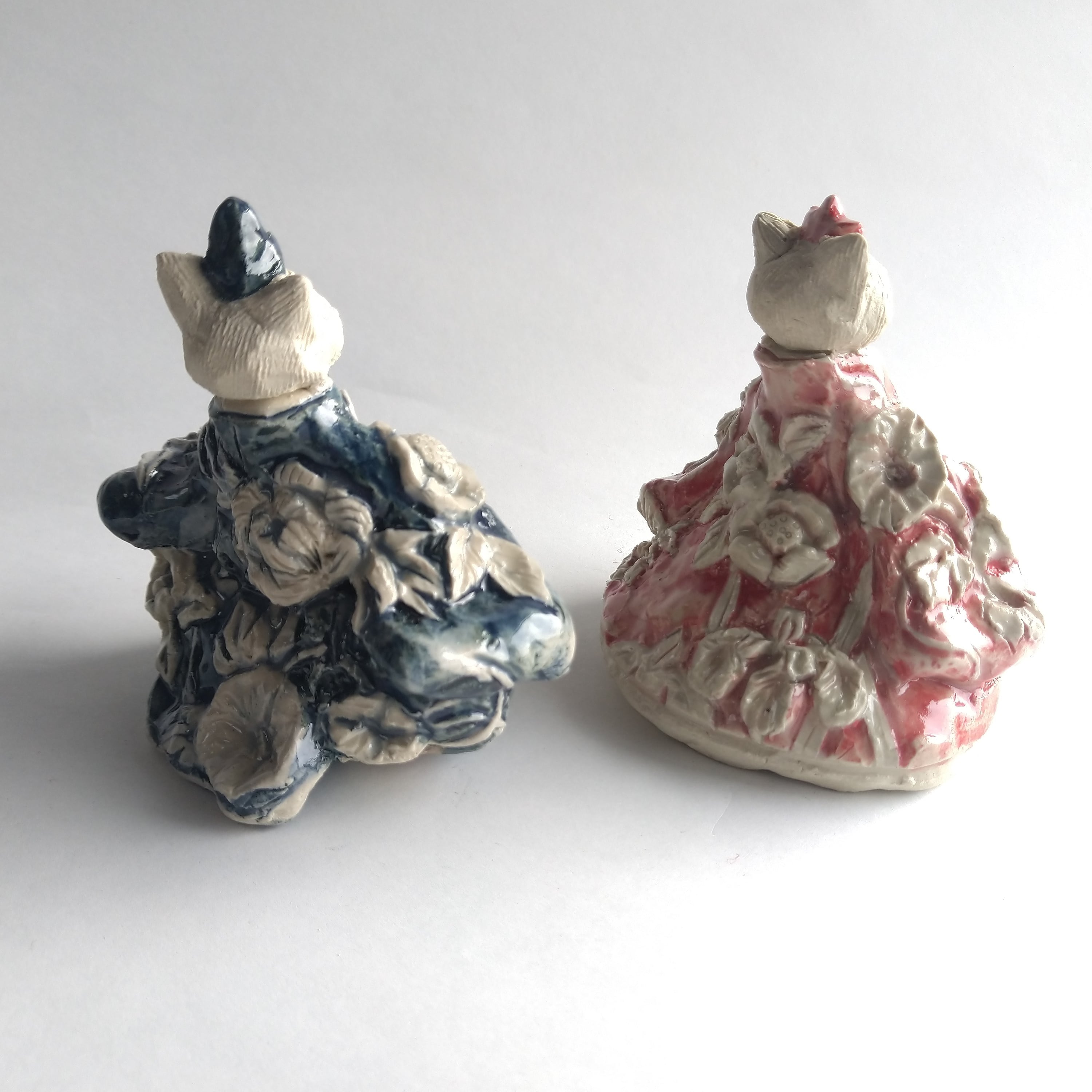 衣服の部分にはレリーフ技法を用いて、陶土での成形中に平面上に形態を盛り上げて起伏を与えたり、彫り込んだりして、立体的な模様をデザインしています。
