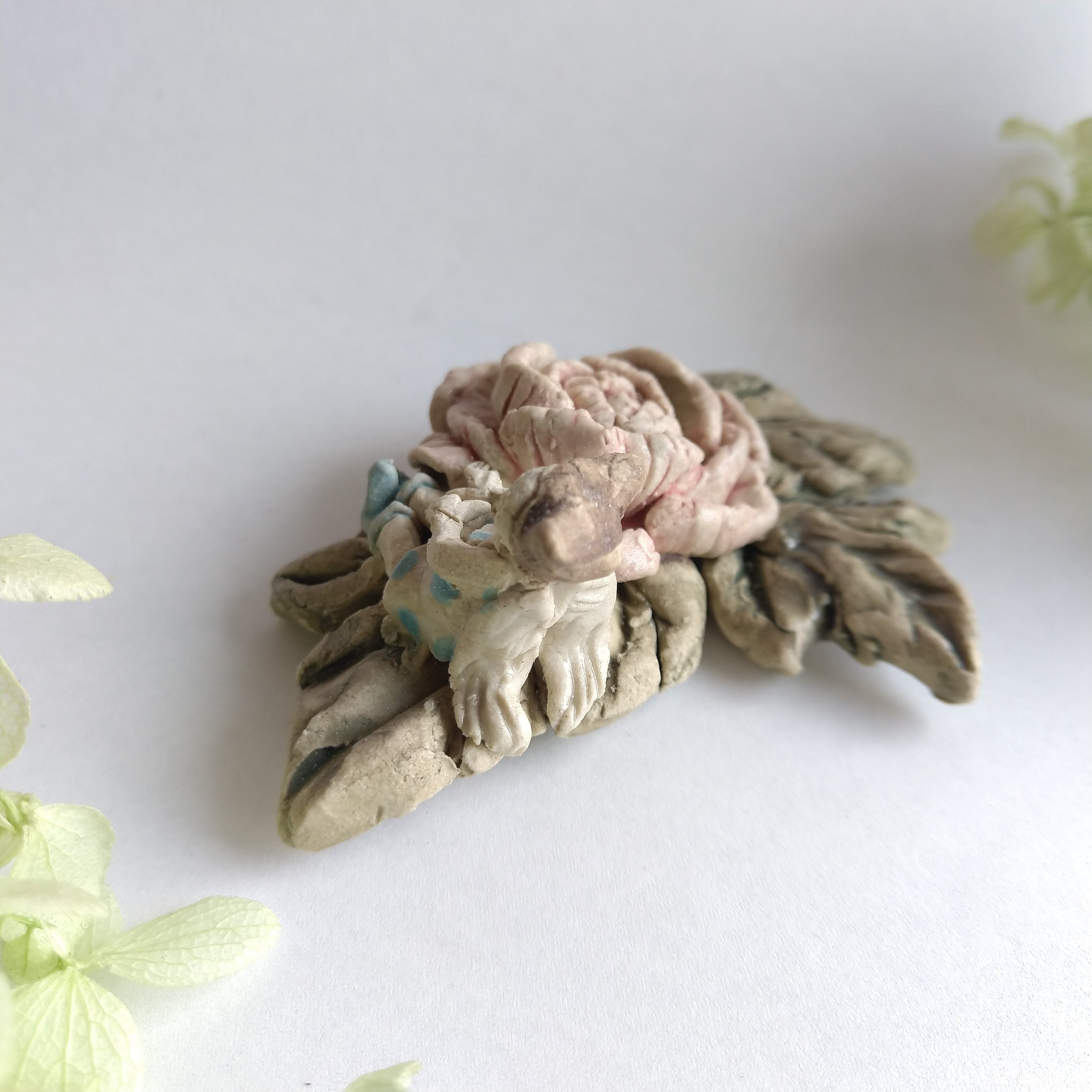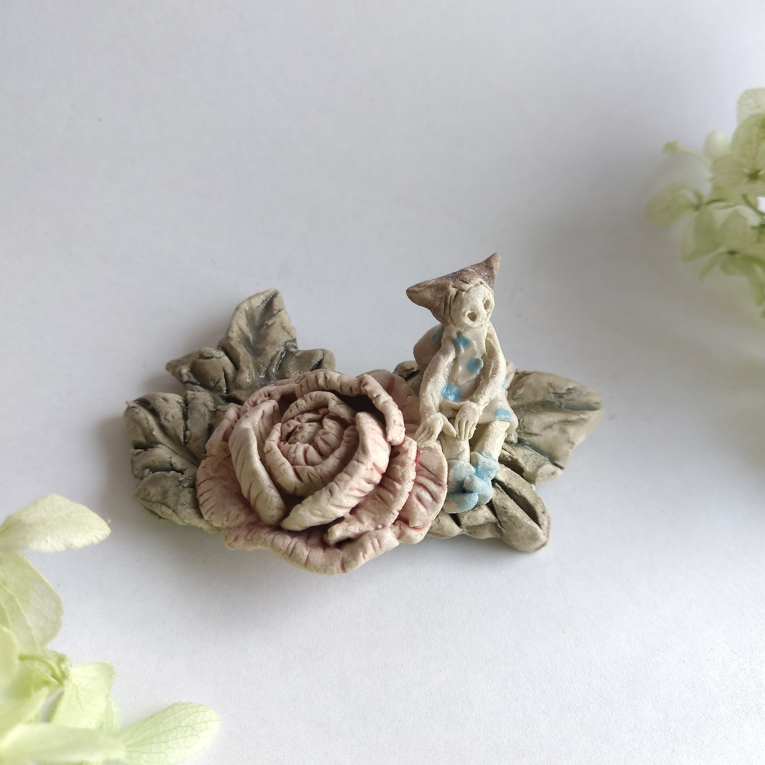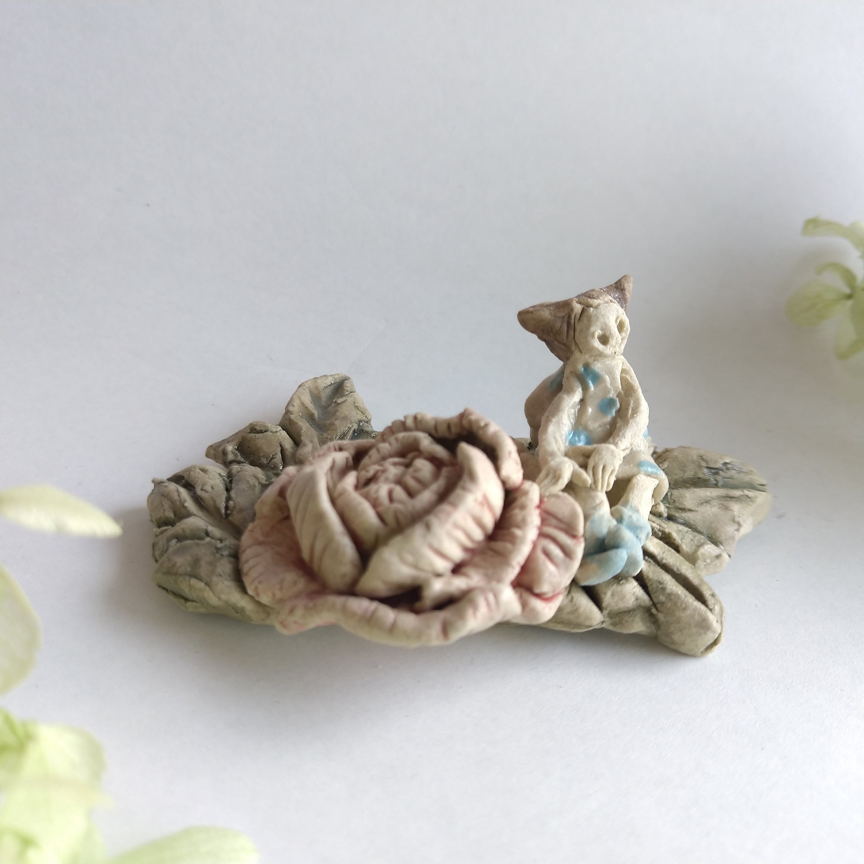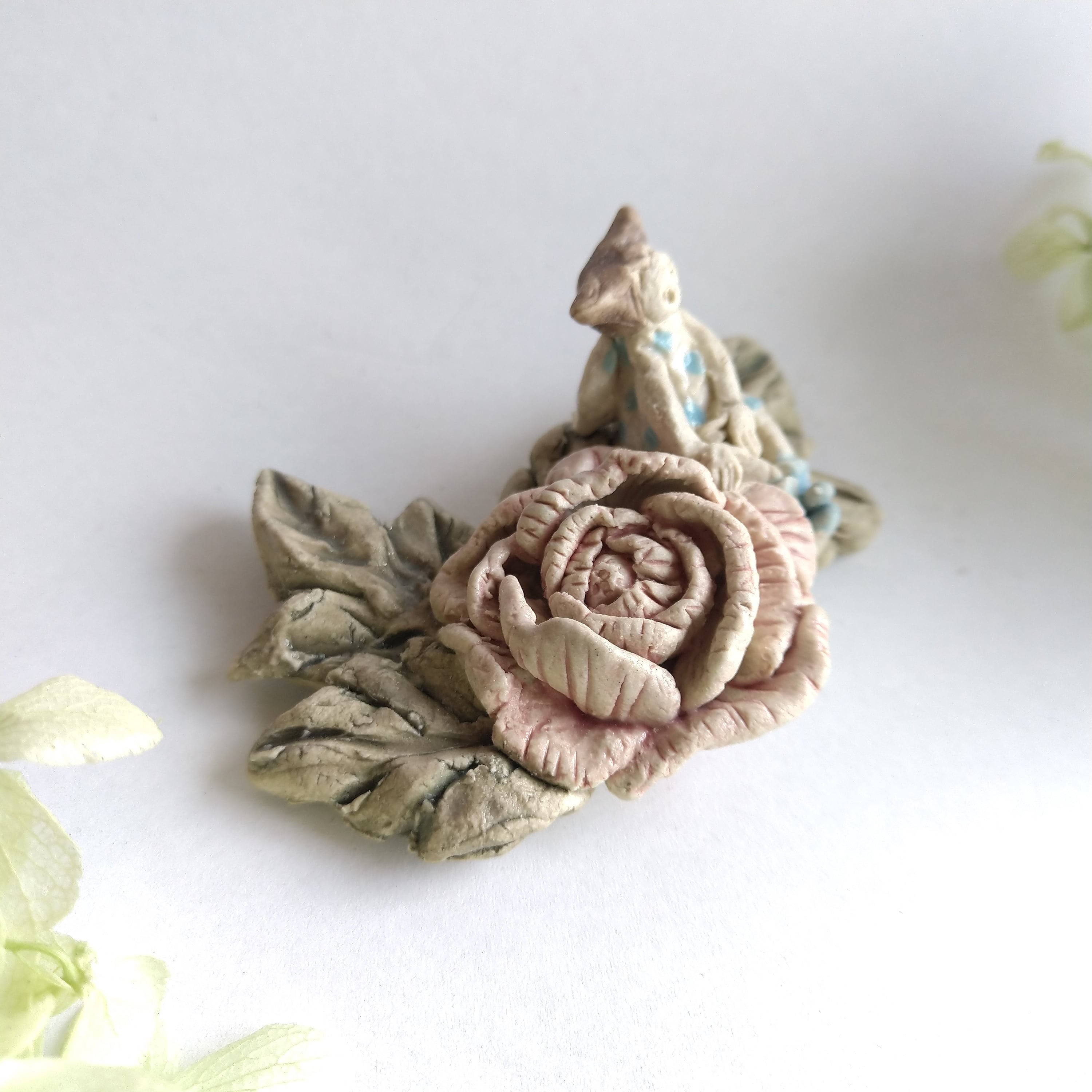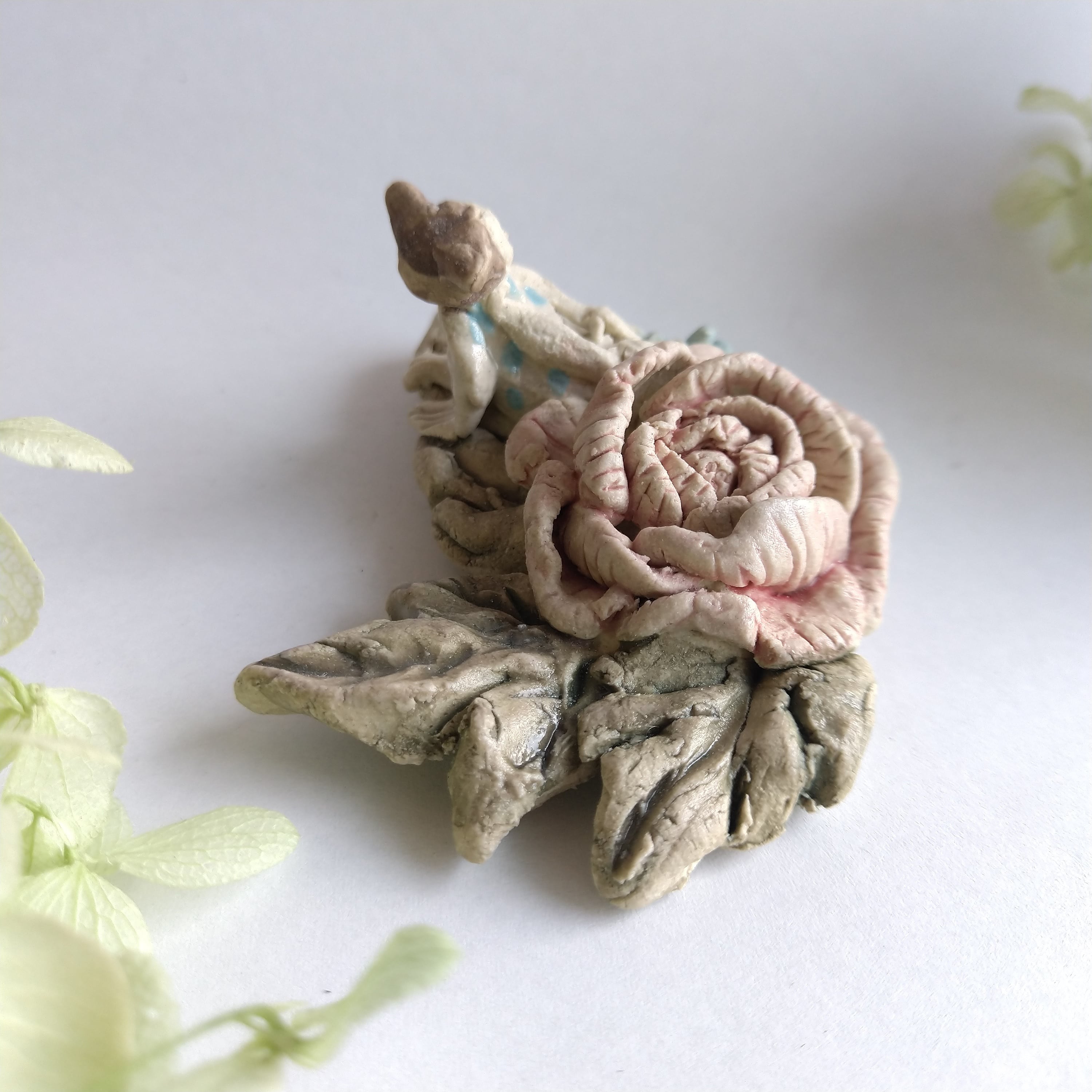 好きな花や、その花言葉をイメージしたりしながら、自分の身体が小さくなったら、こんな風に花の妖精のように寄り添ってみたいなぁと思いながら制作してみました。