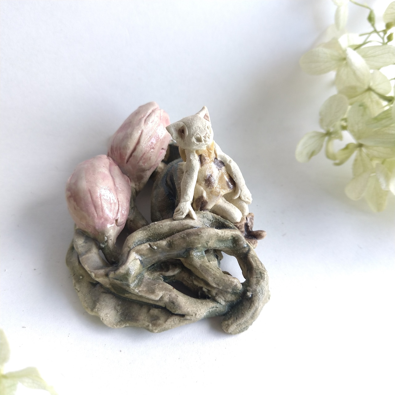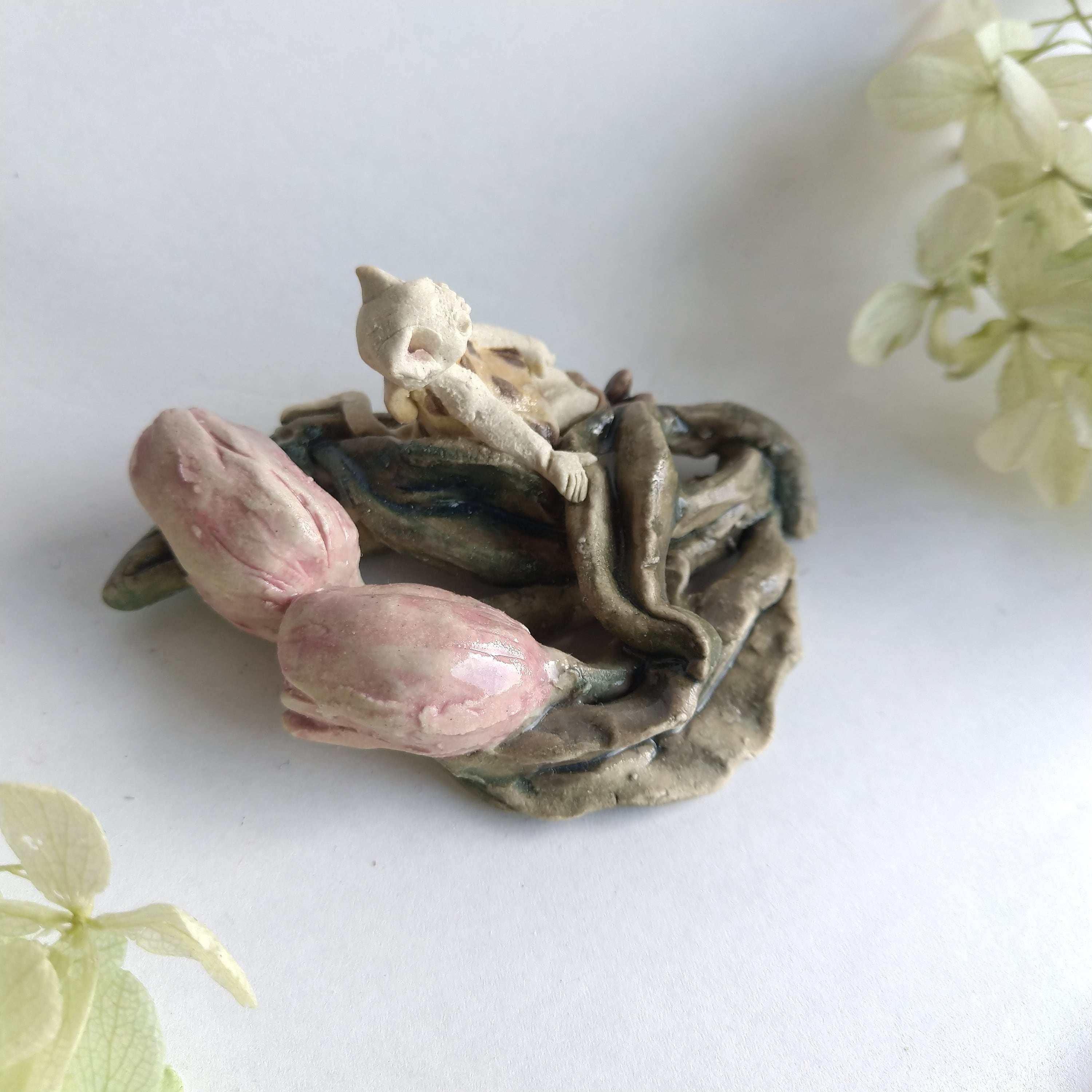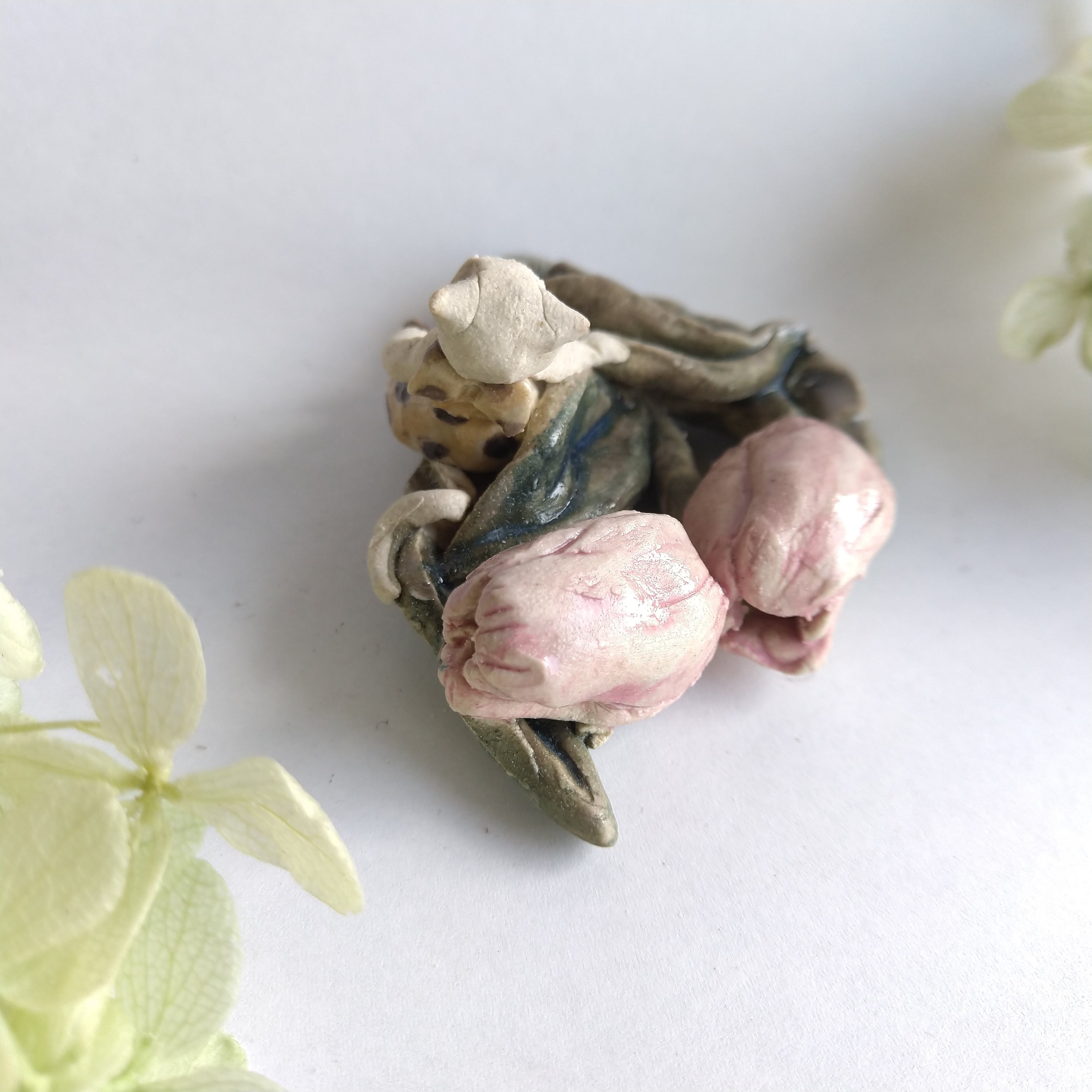 好きな花や、その花言葉をイメージしたりしながら、自分の身体が小さくなったら、こんな風に花の妖精のように寄り添ってみたいなぁと思いながら制作してみました。