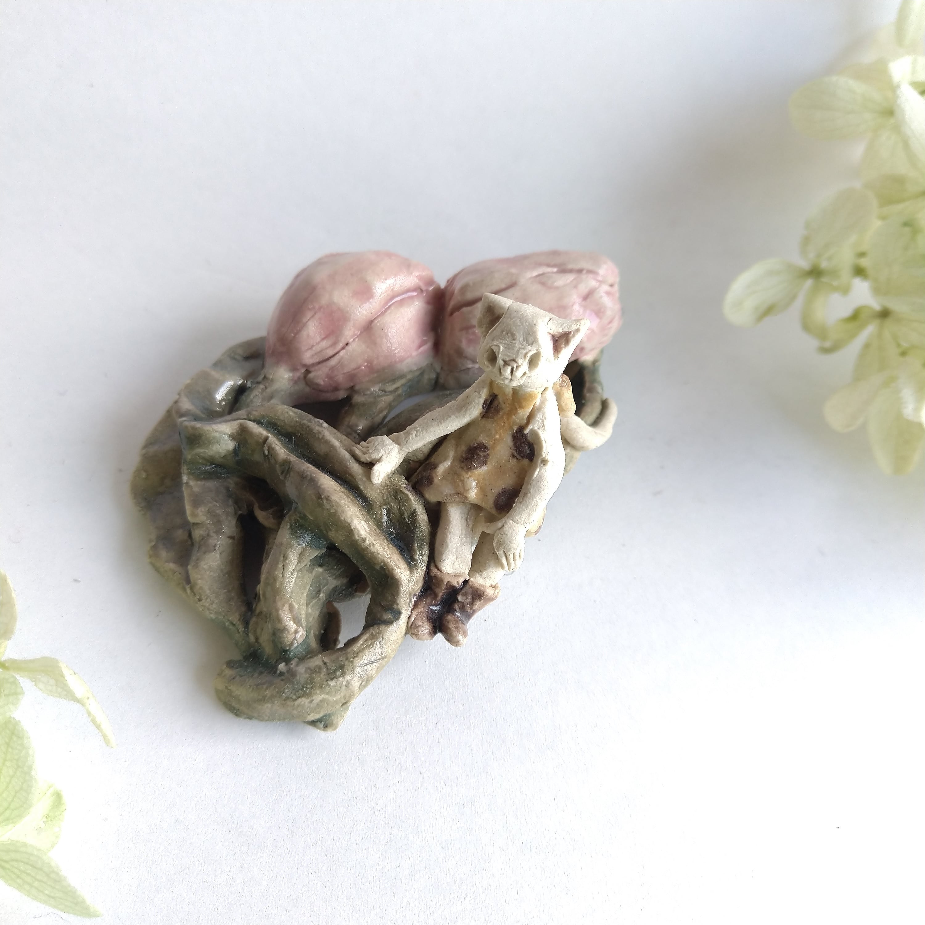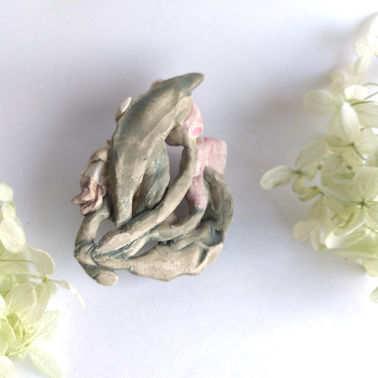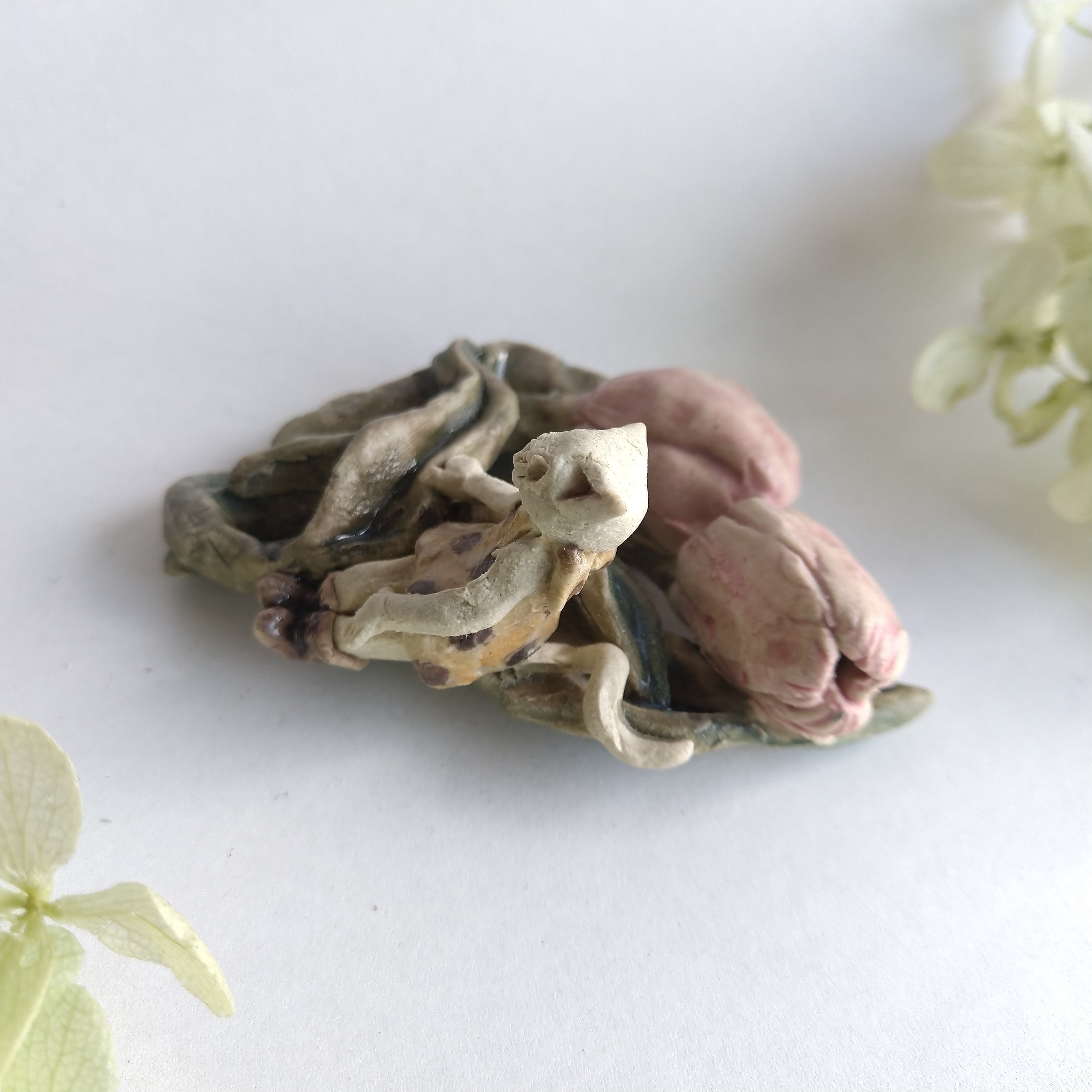好きな花や、その花言葉をイメージしたりしながら、自分の身体が小さくなったら、こんな風に花の妖精のように寄り添ってみたいなぁと思いながら制作してみました。