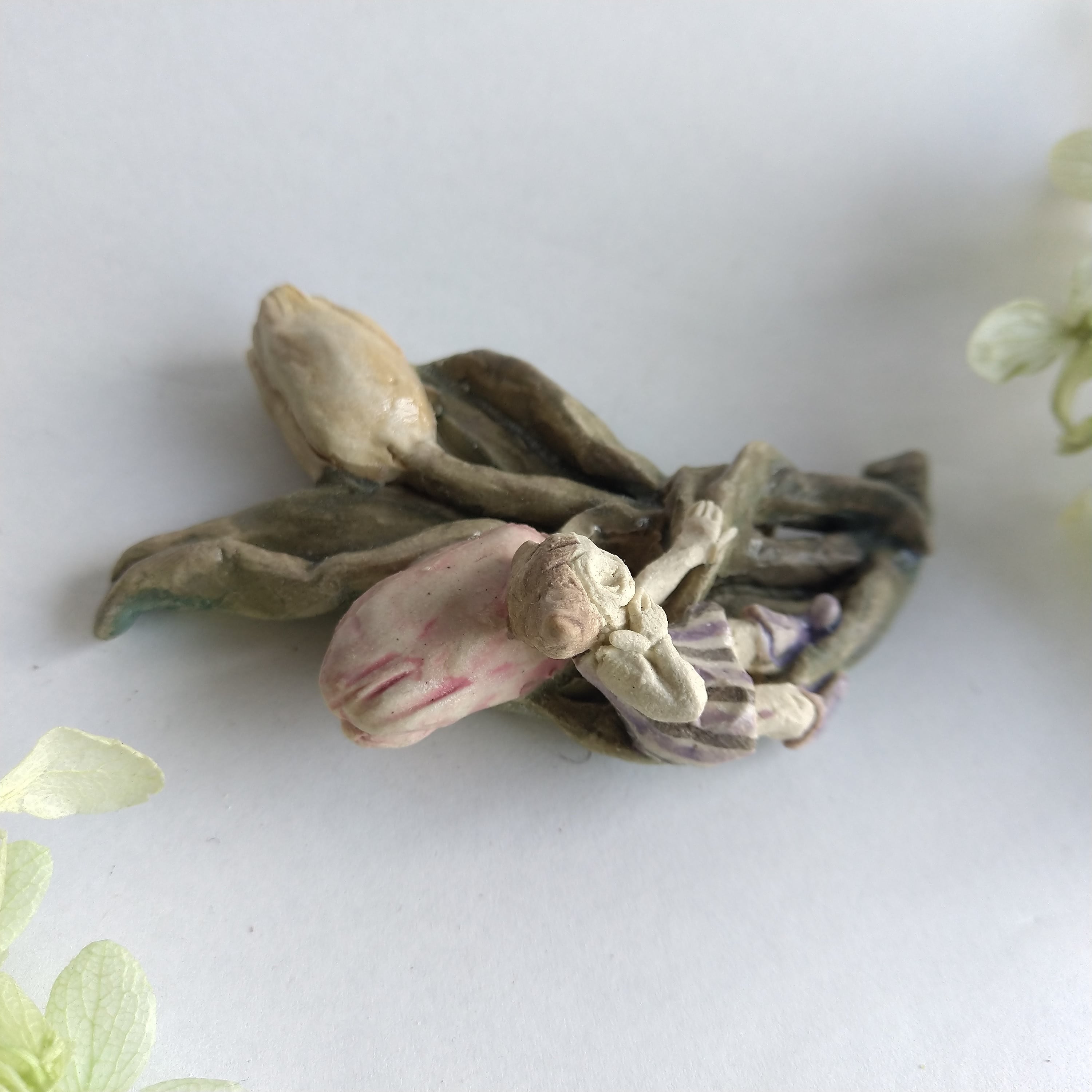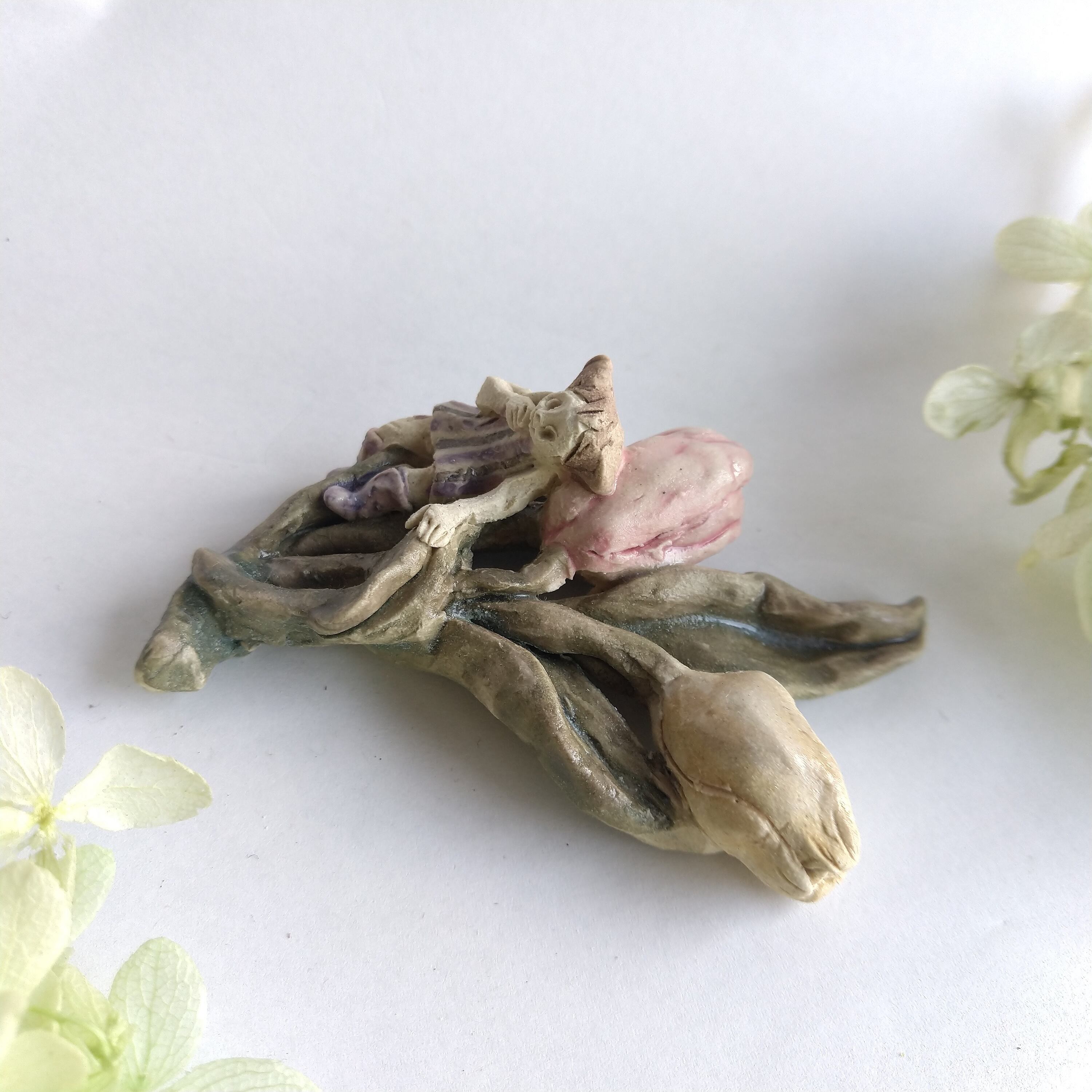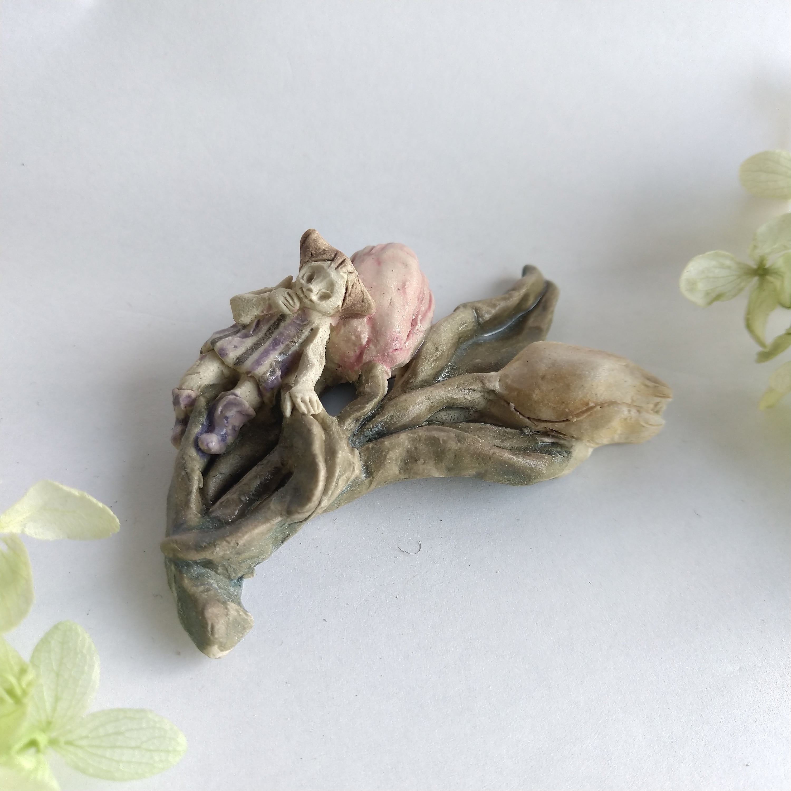 好きな花や、その花言葉をイメージしたりしながら、自分の身体が小さくなったら、こんな風に花の妖精のように寄り添ってみたいなぁと思いながら制作してみました。