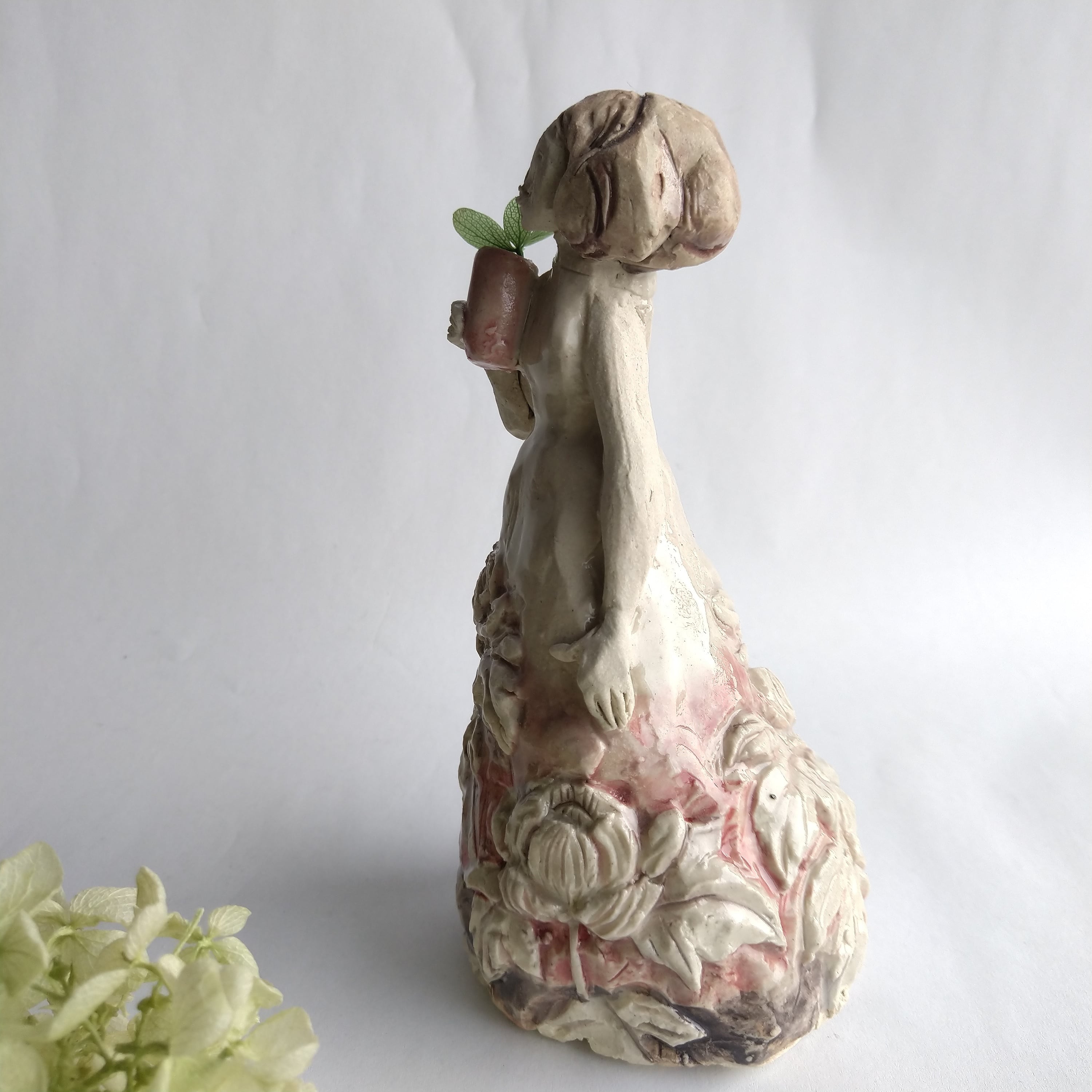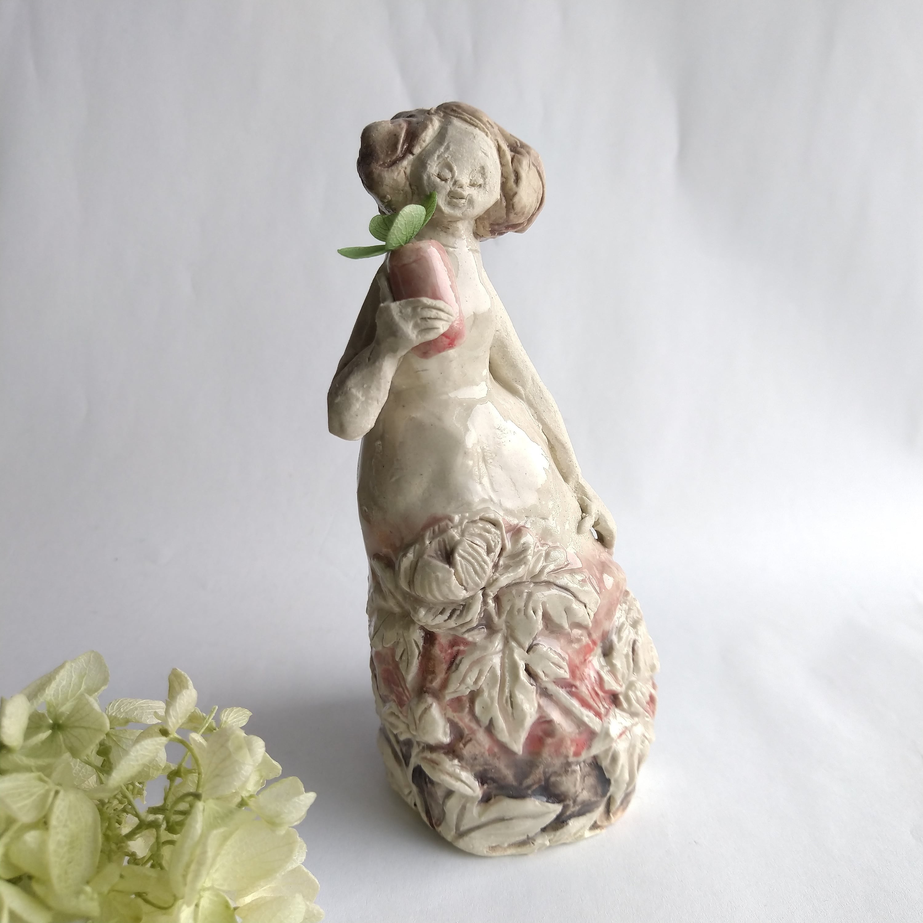 眼を閉じて何かを祈っていたり、想っていたり。。と、そんなイメージを花をデザインした衣装をまとった女性の姿で表現してみました。