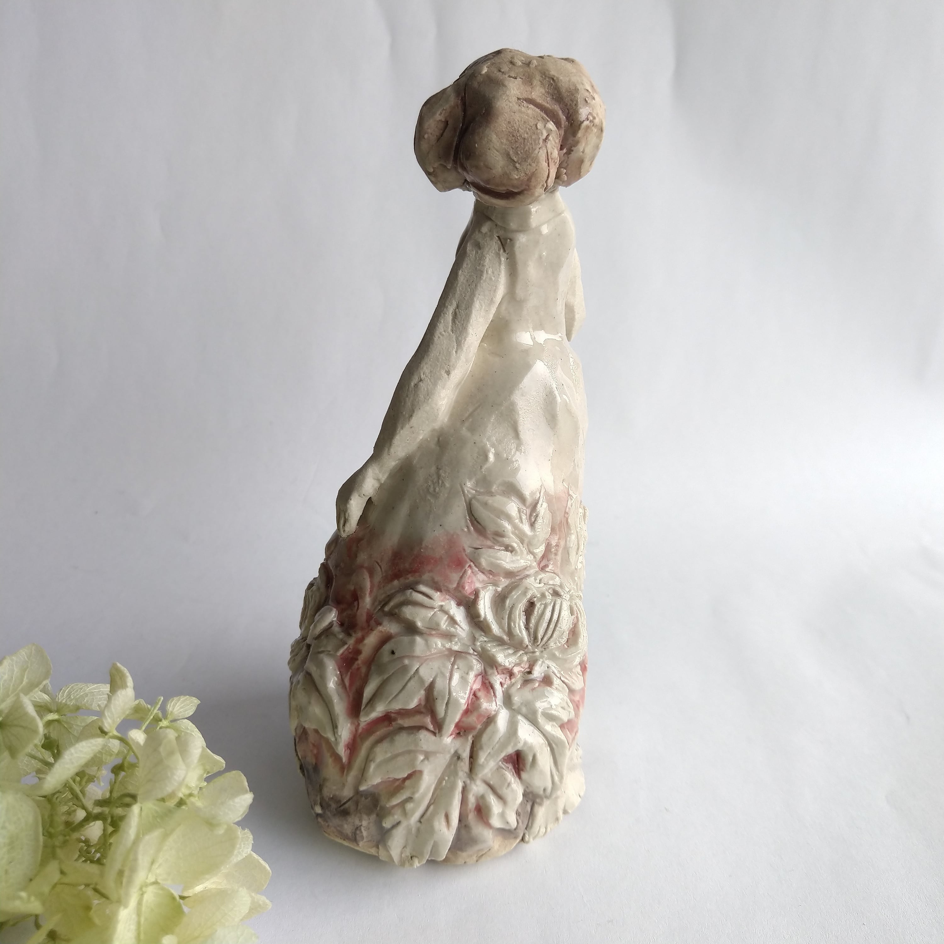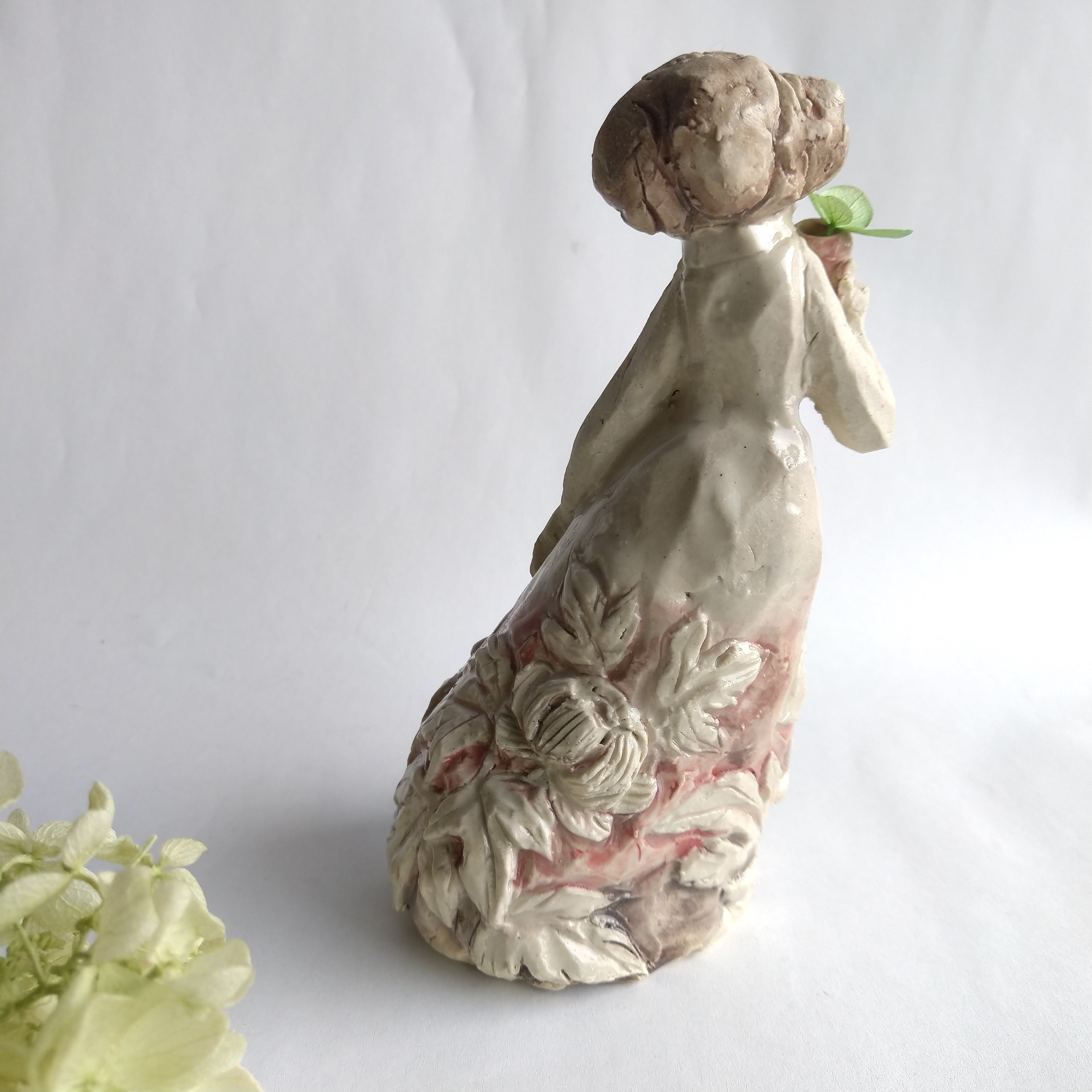 衣装の一部分に薄く透明釉を施しているので、その部分は少し光沢があります。