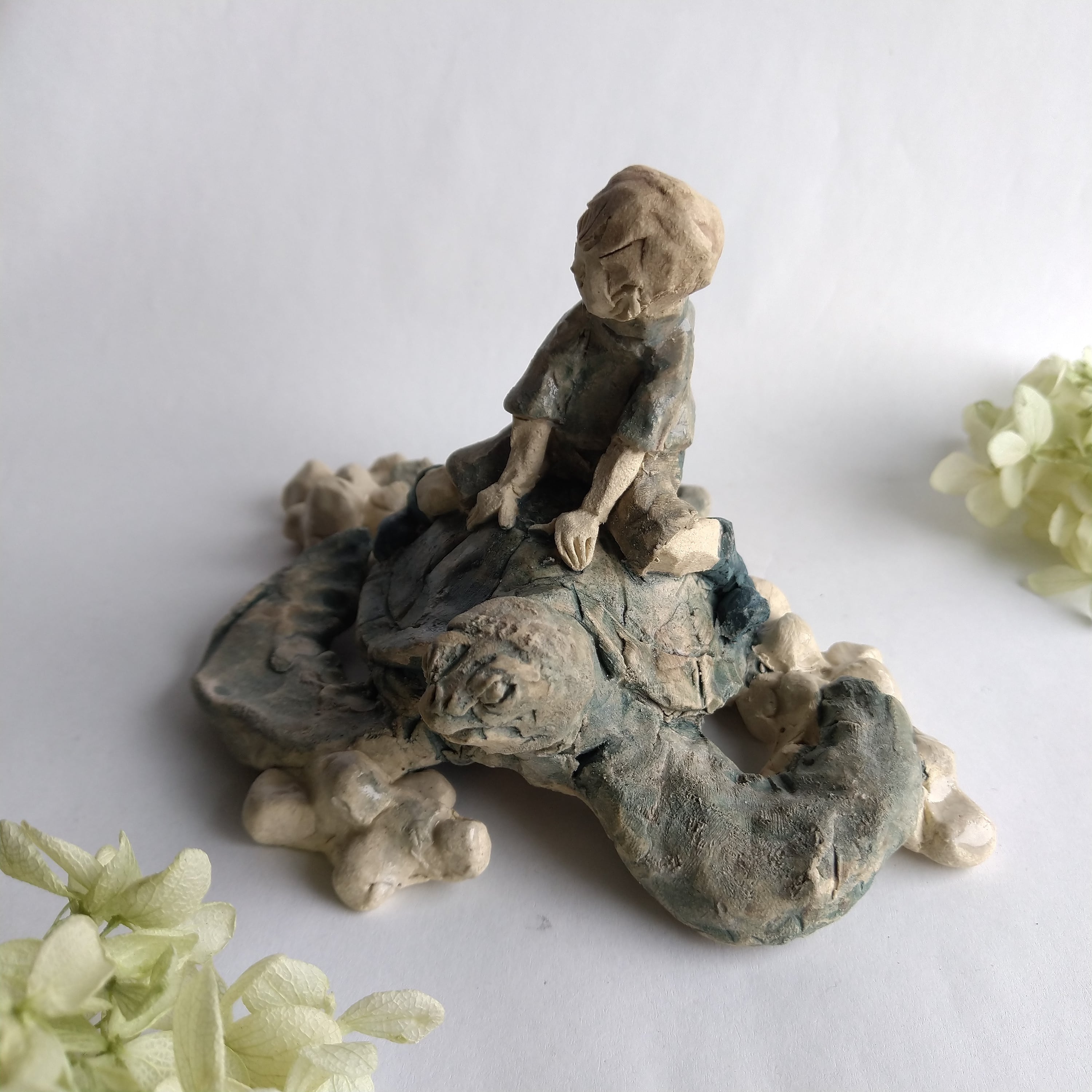 ひとりずつ手作りしている手びねりの陶人形で、素材は陶土を使用しています。