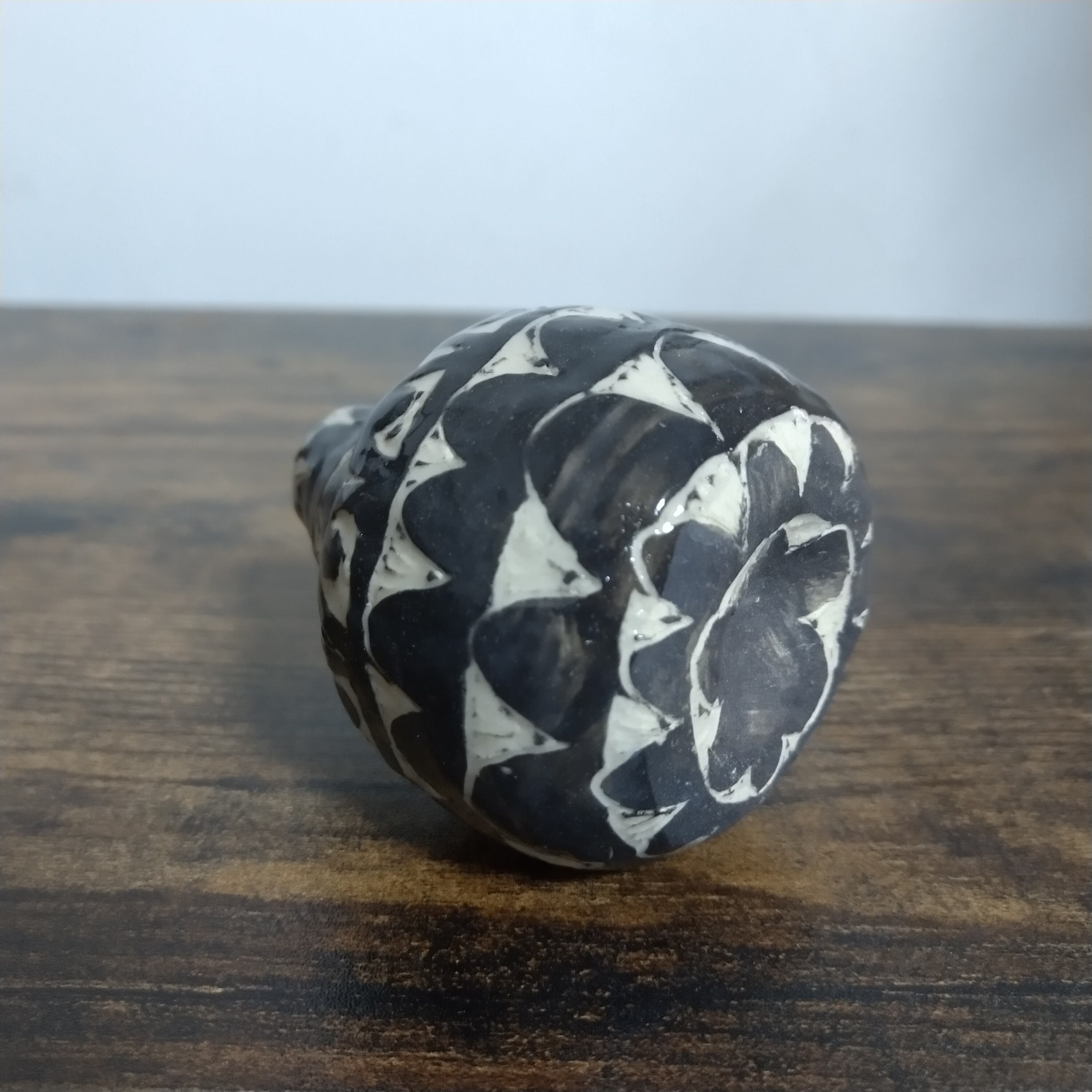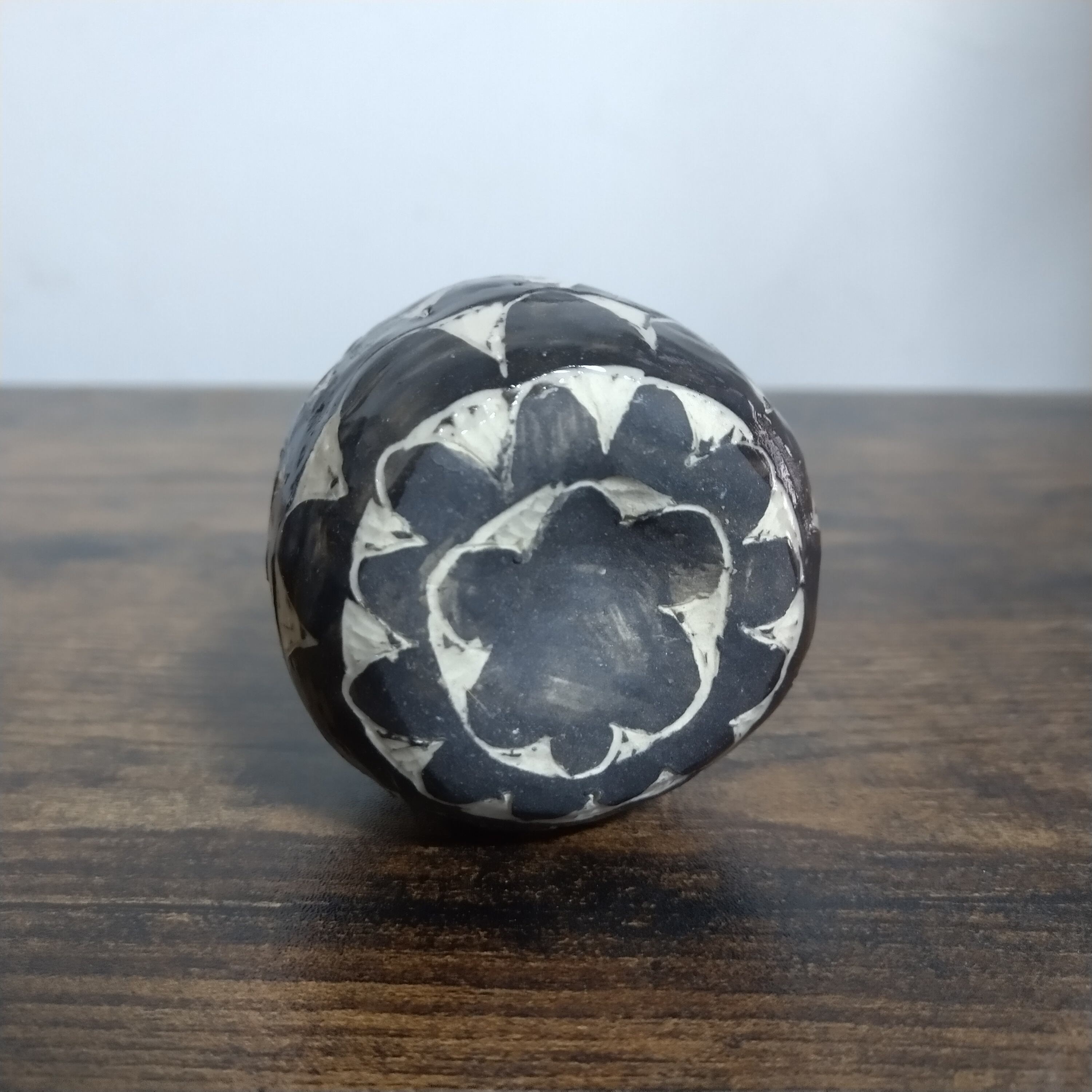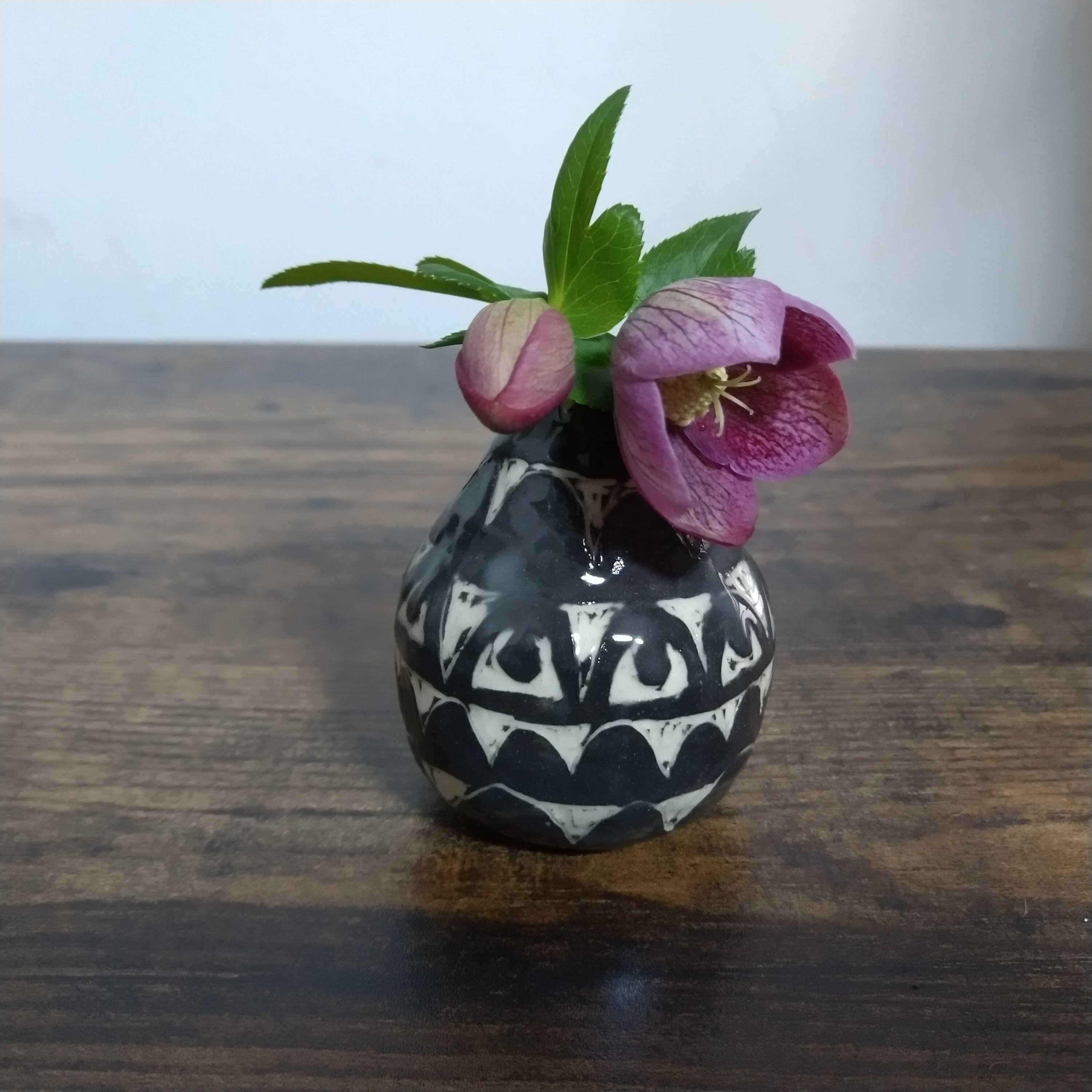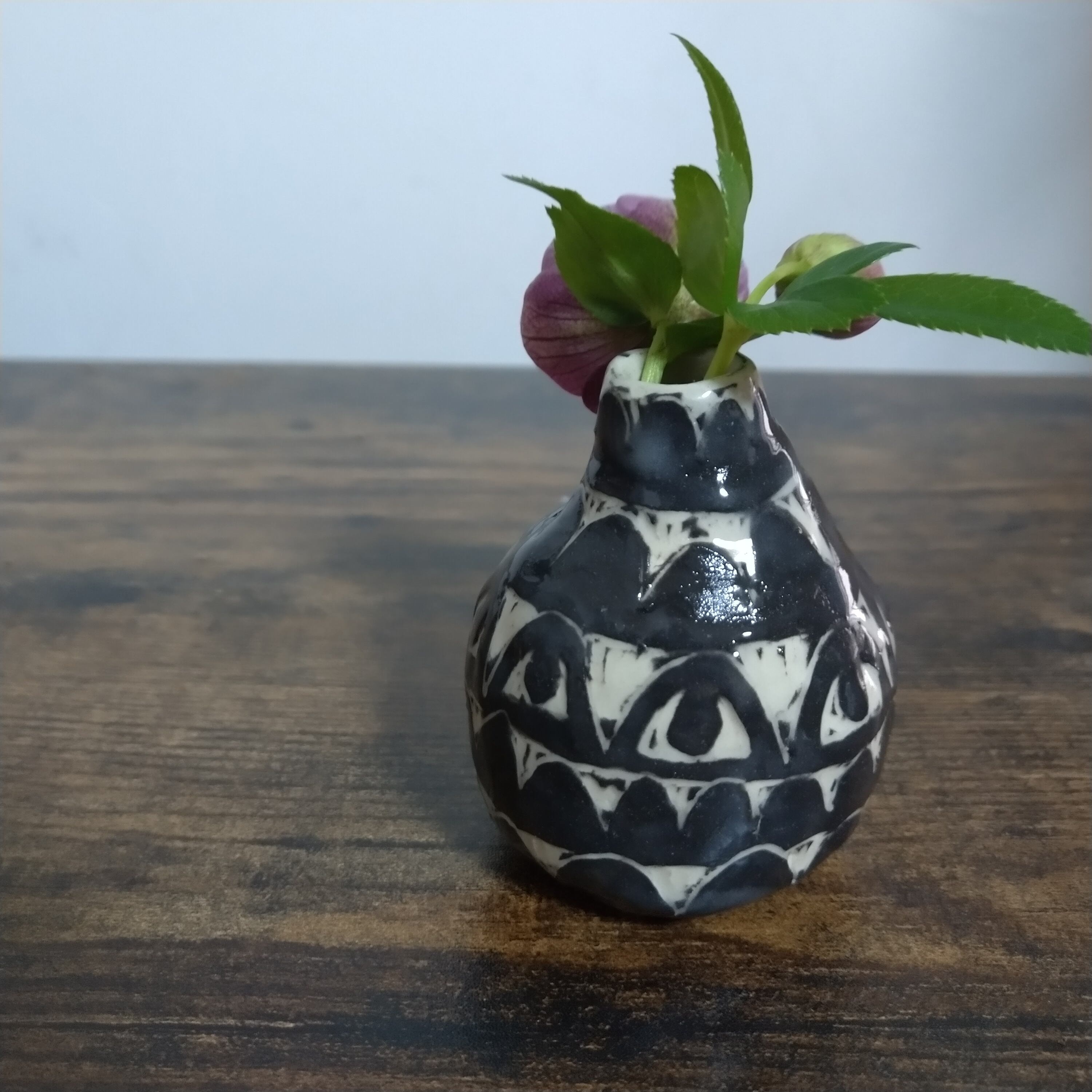 「掻き落とし(sgraffito)」という技法で制作した小さな一輪挿しです。