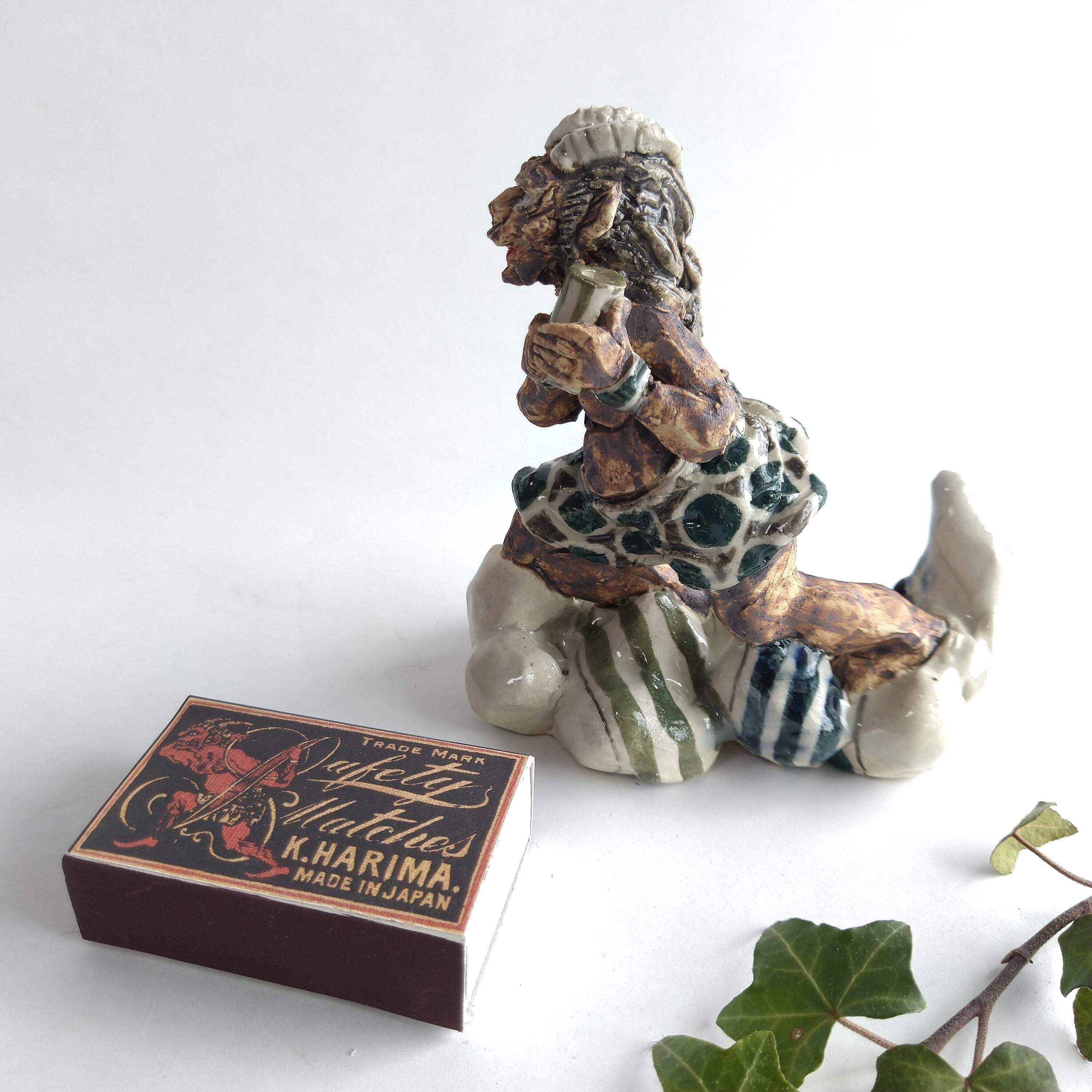 土台や衣装、角や筒の一部分には薄く透明釉を施しているので、その部分は少し光沢があります。