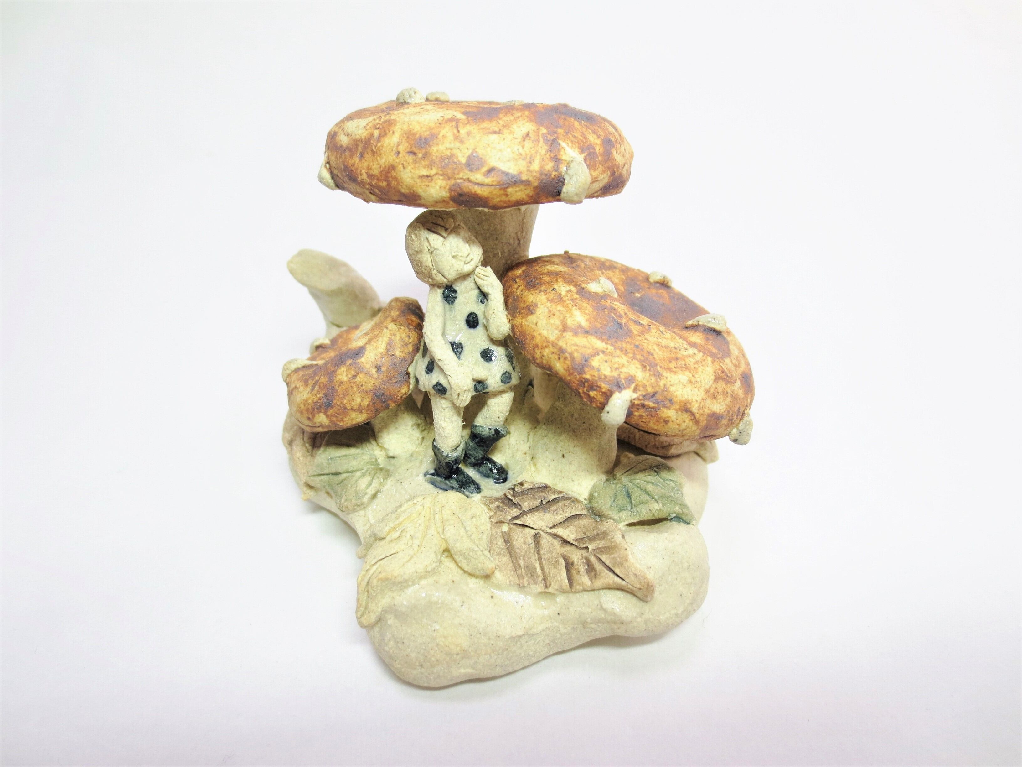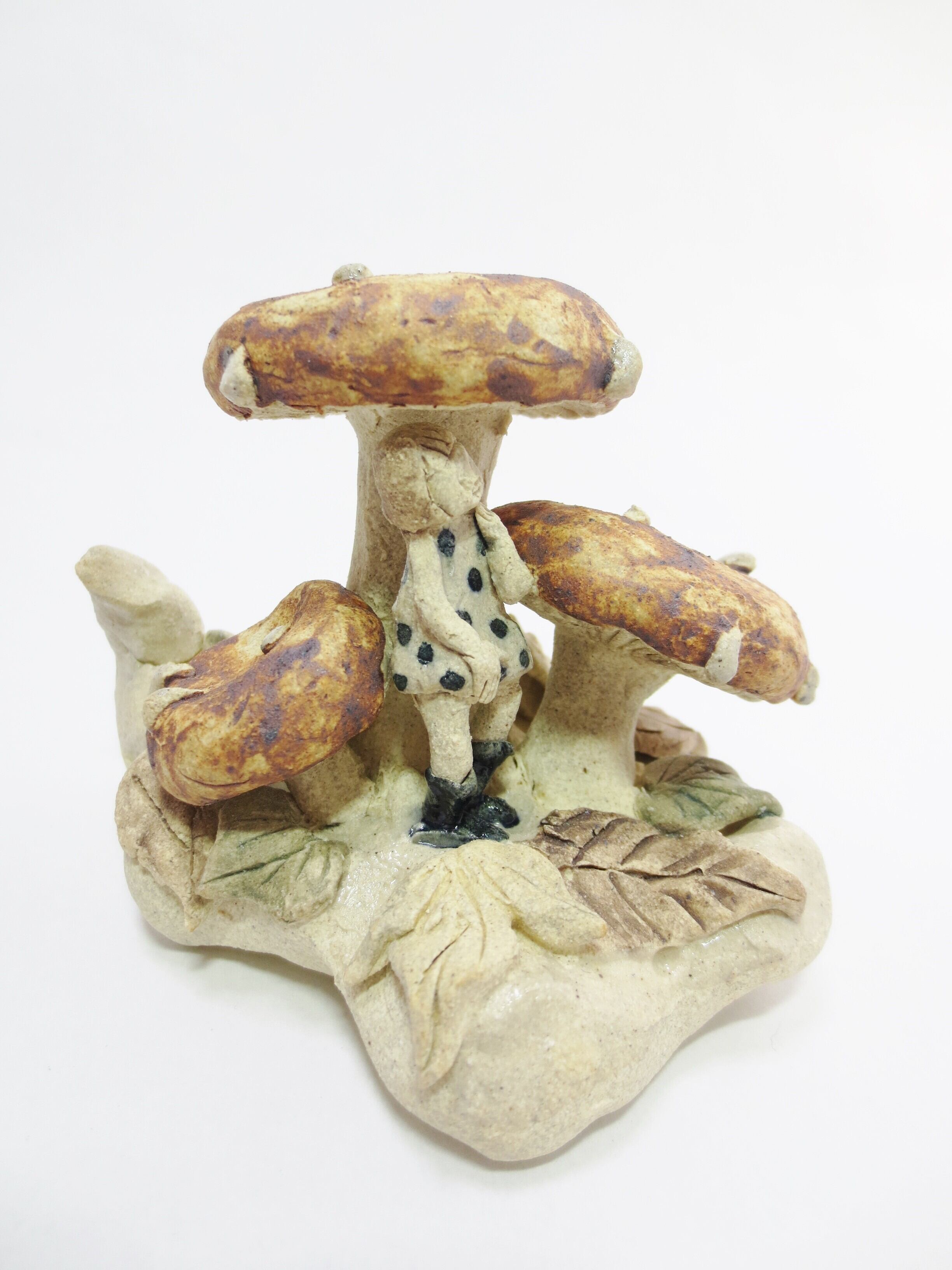 キノコのかさで雨宿りしている、ちびっこで表現してみました。