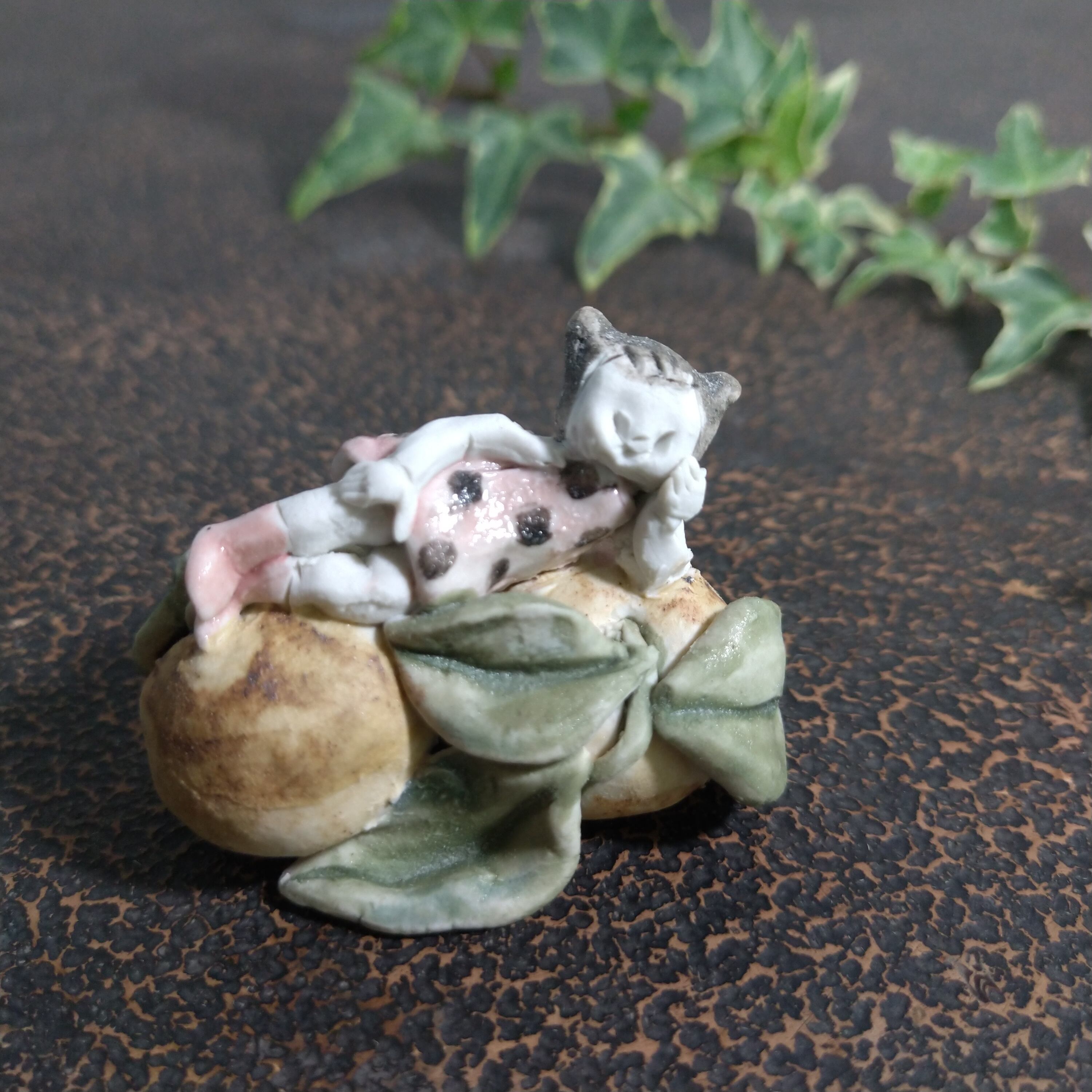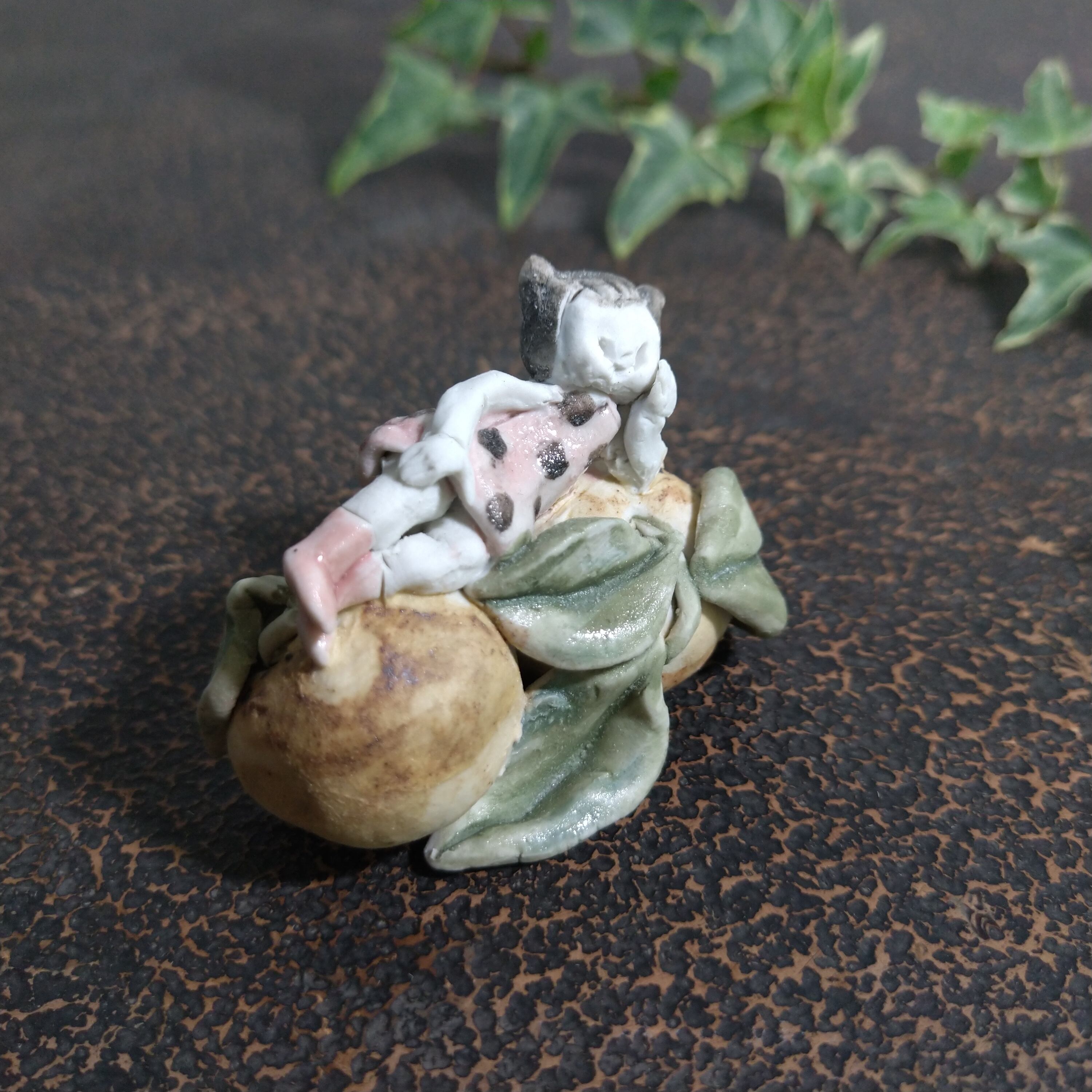 小さな蜜柑の上にネコ耳のちびっこがごろんとしています。