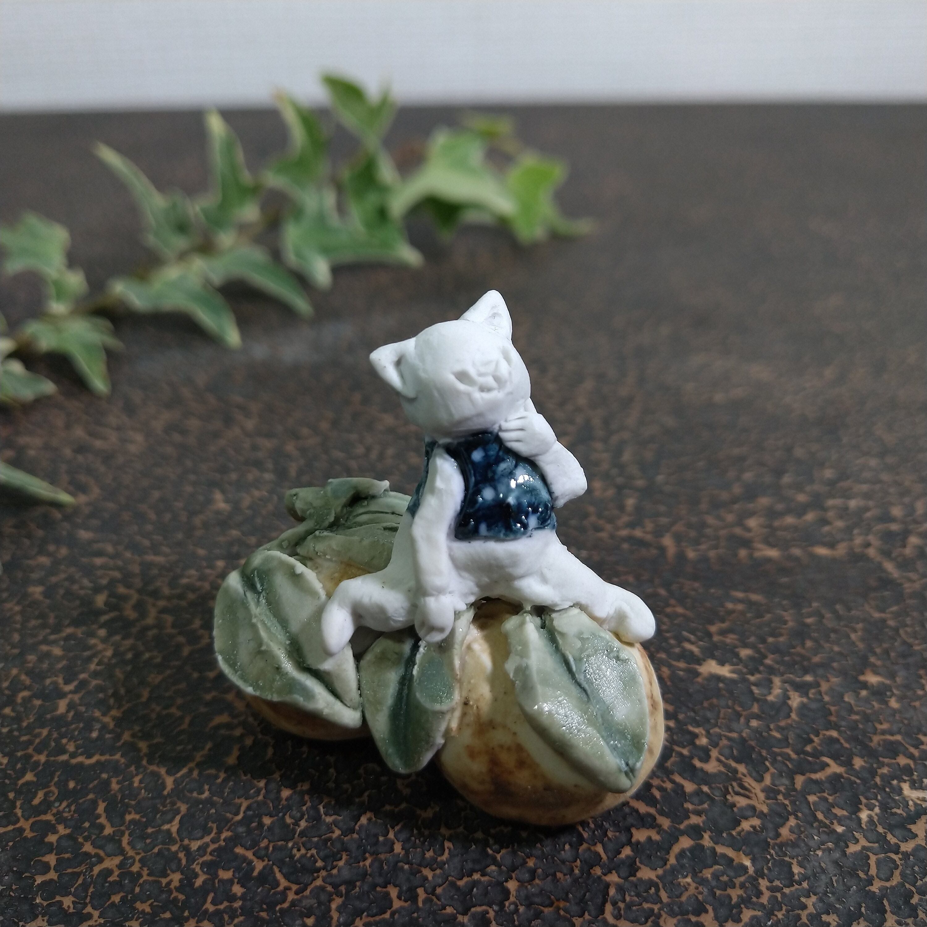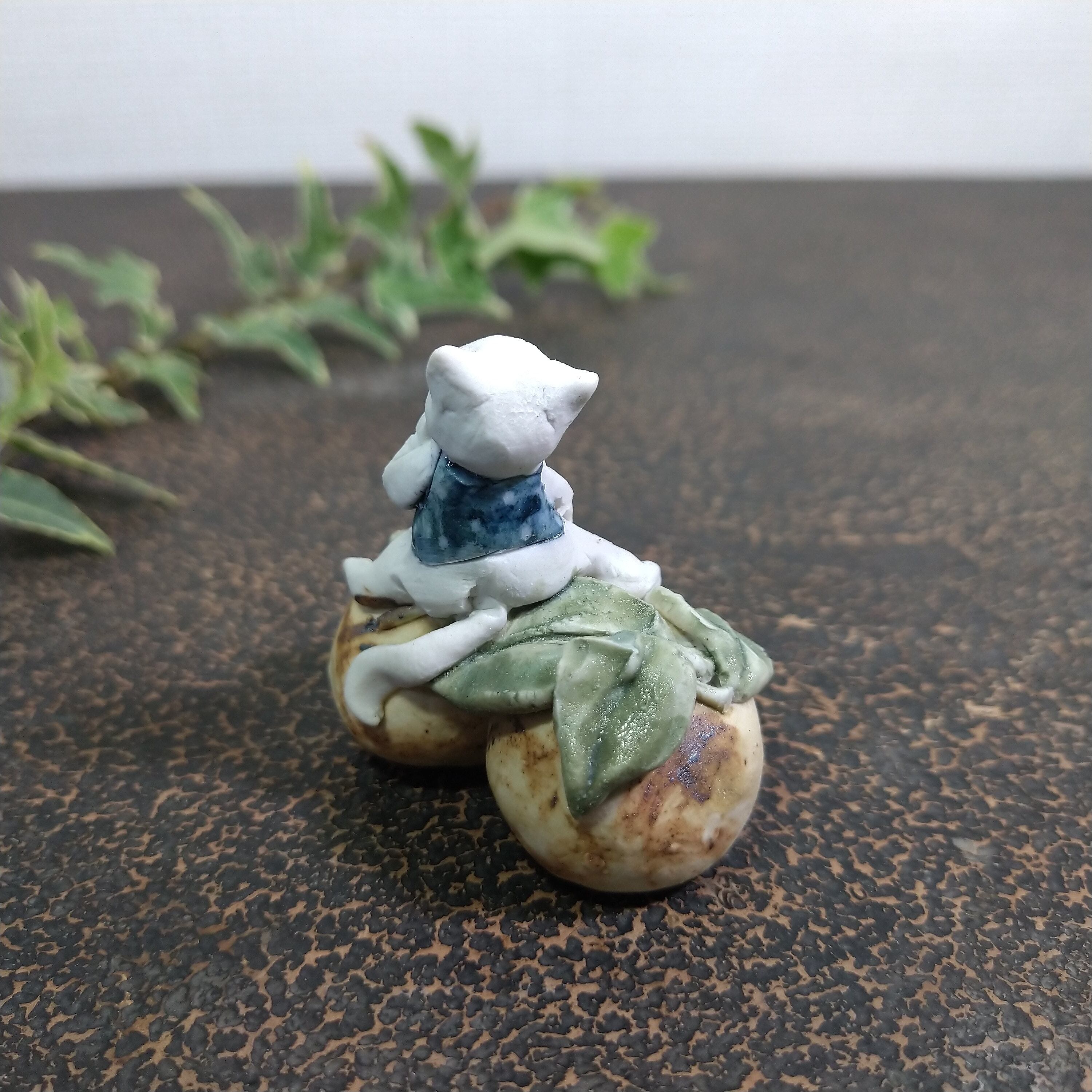 服の一部と葉部分に薄く透明釉を施しているので、その部分は少し光沢があります。