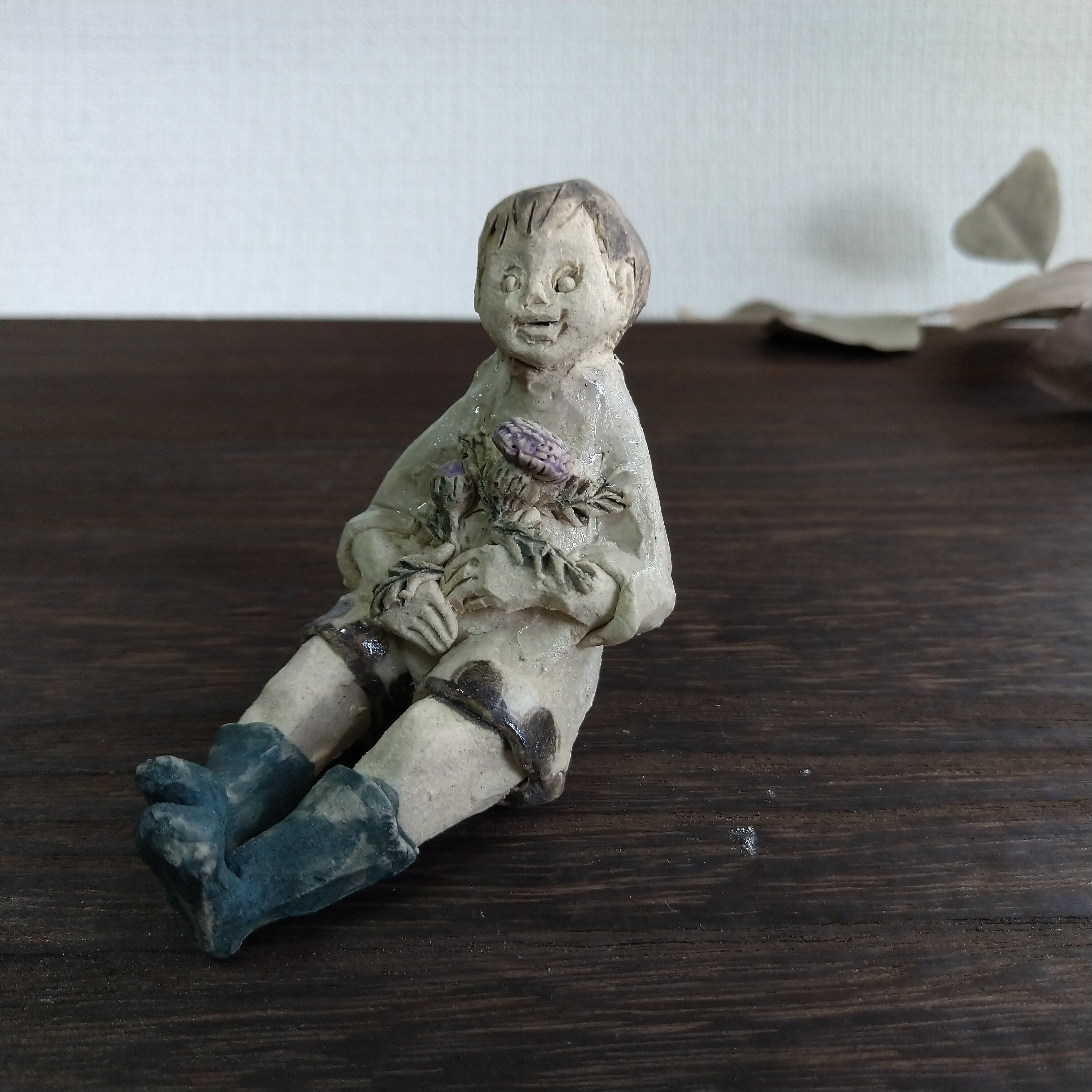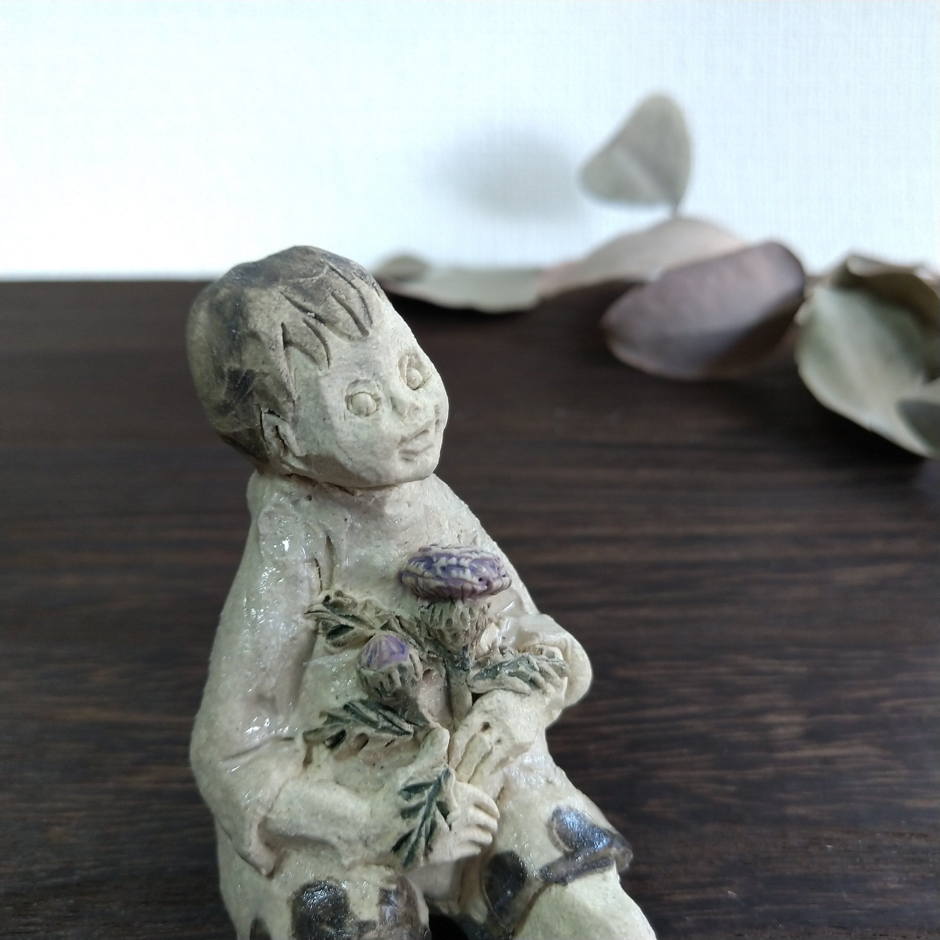 季節の花を手に持った「はなのこ」のシリーズで、アザミを持った男の子です。