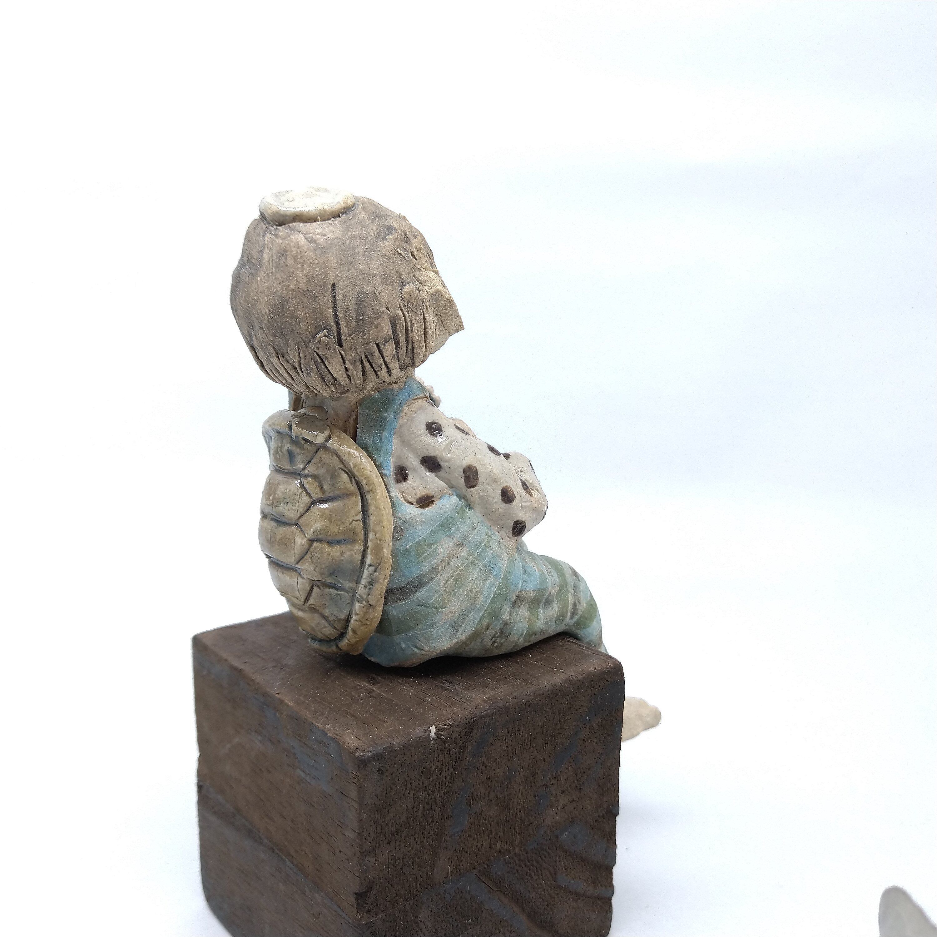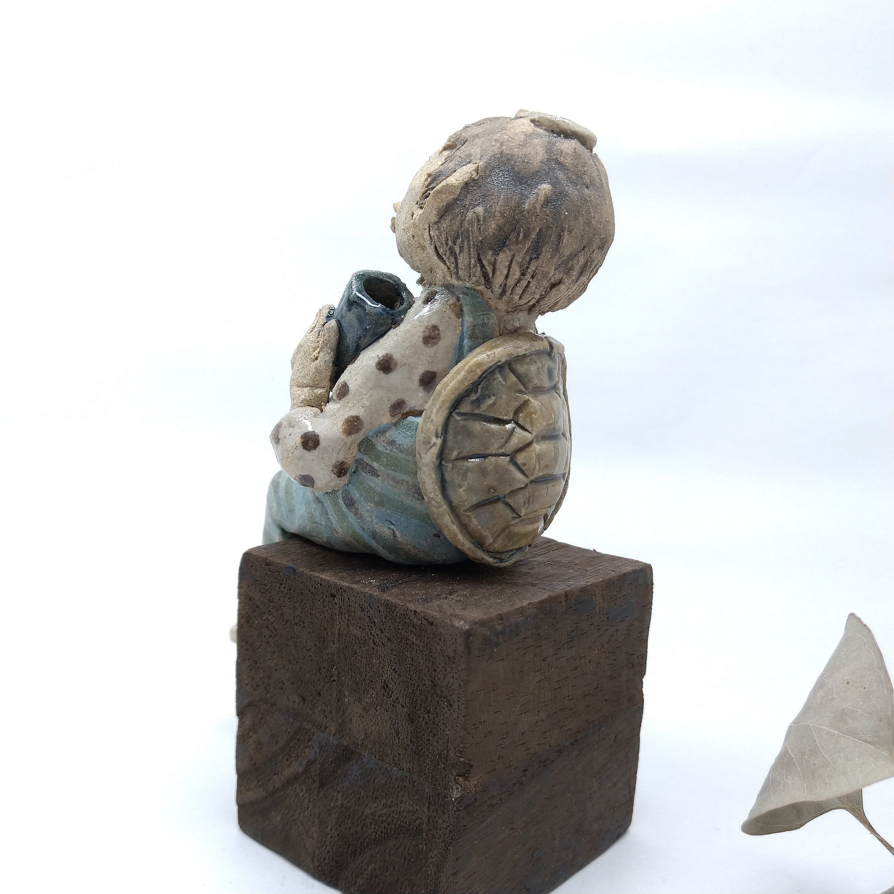 衣装や甲羅・皿の一部分には薄く透明釉を施しているので、その部分は少し光沢があります。