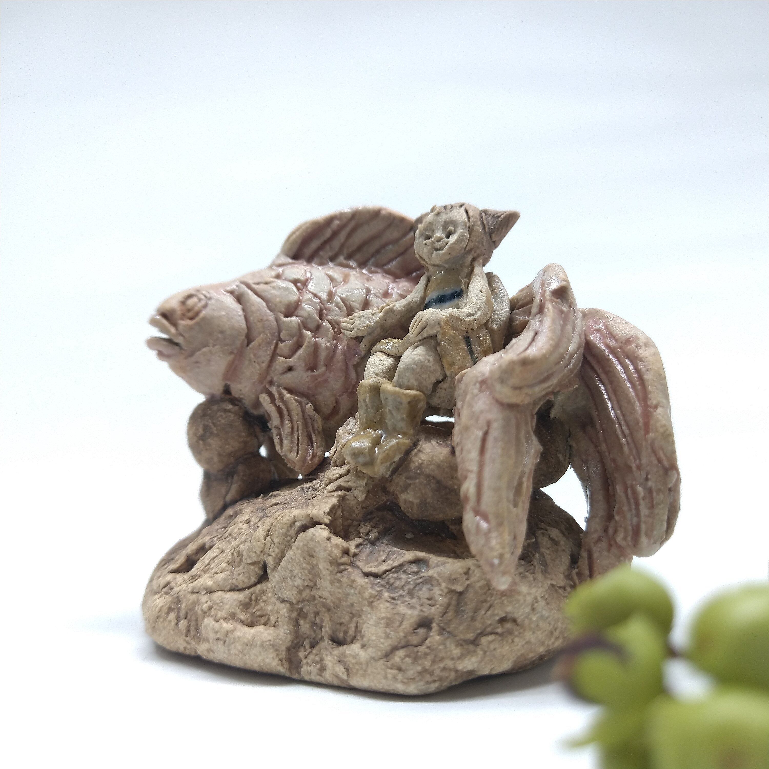 金魚や衣服・羽根の一部分には薄く透明釉を施しているので、その部分は少し光沢があります。
