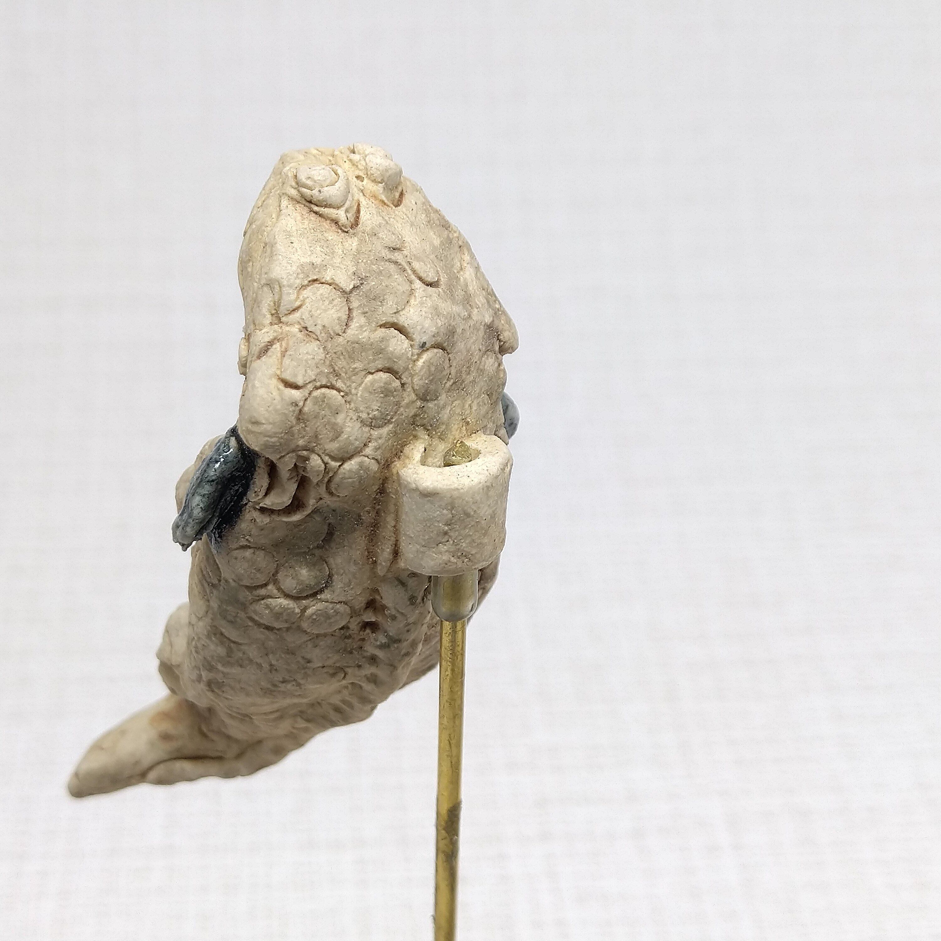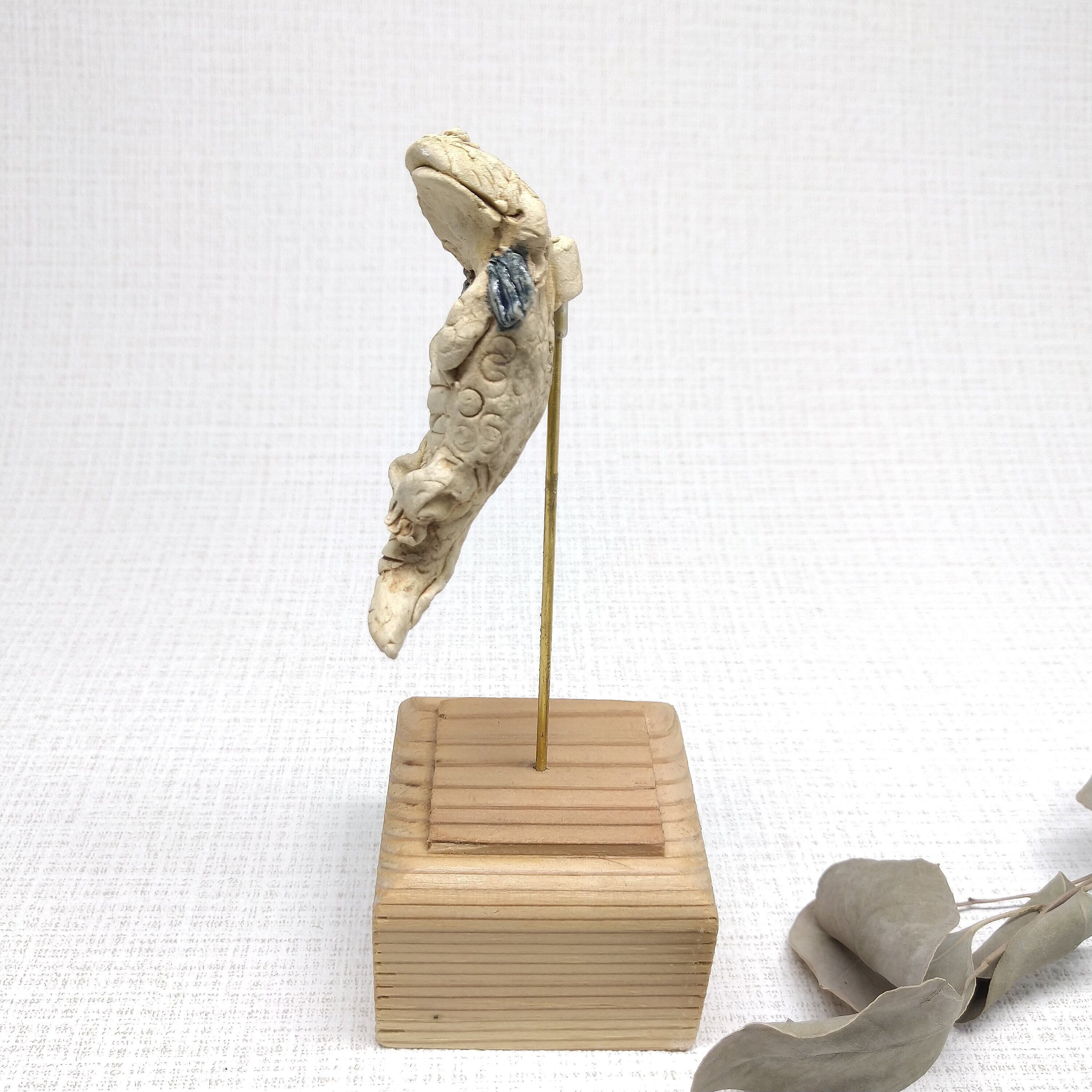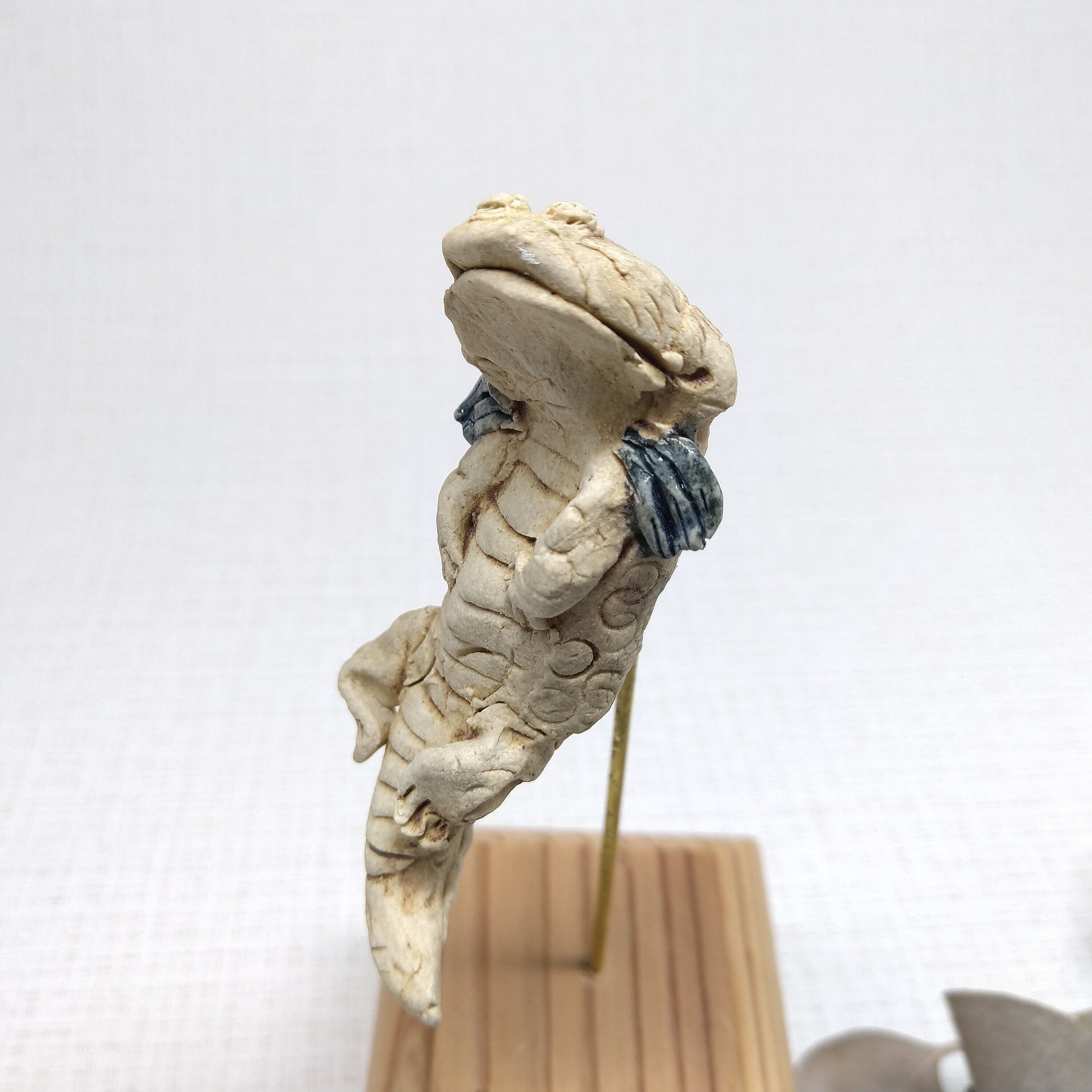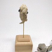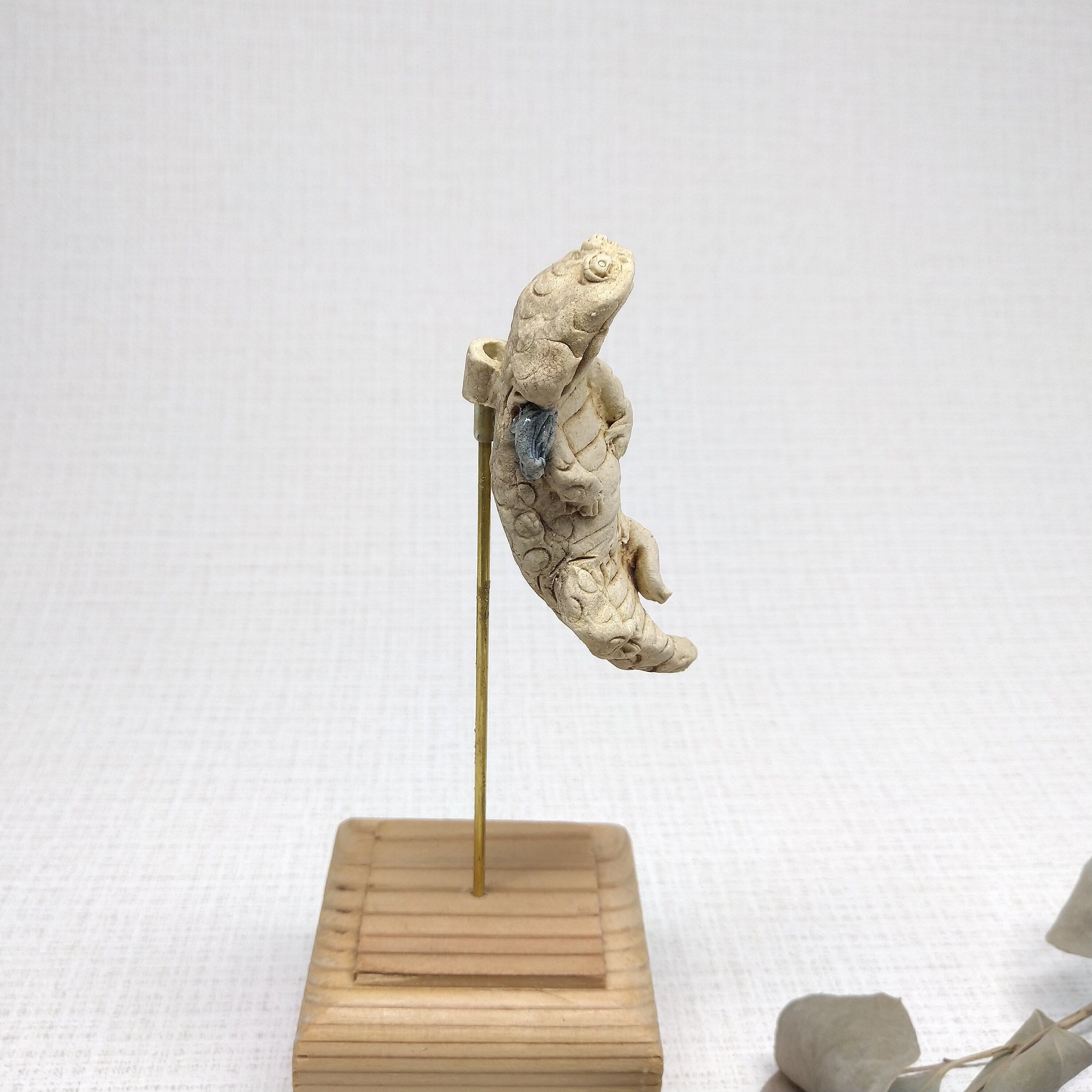 焼成で直立させるために、いつも土台と一体型のポーズに限定されていましたが、背中に筒状の引掛け部分を付けることで、いつもより自由なポーズや、浮遊感を出すことができるようになりました。