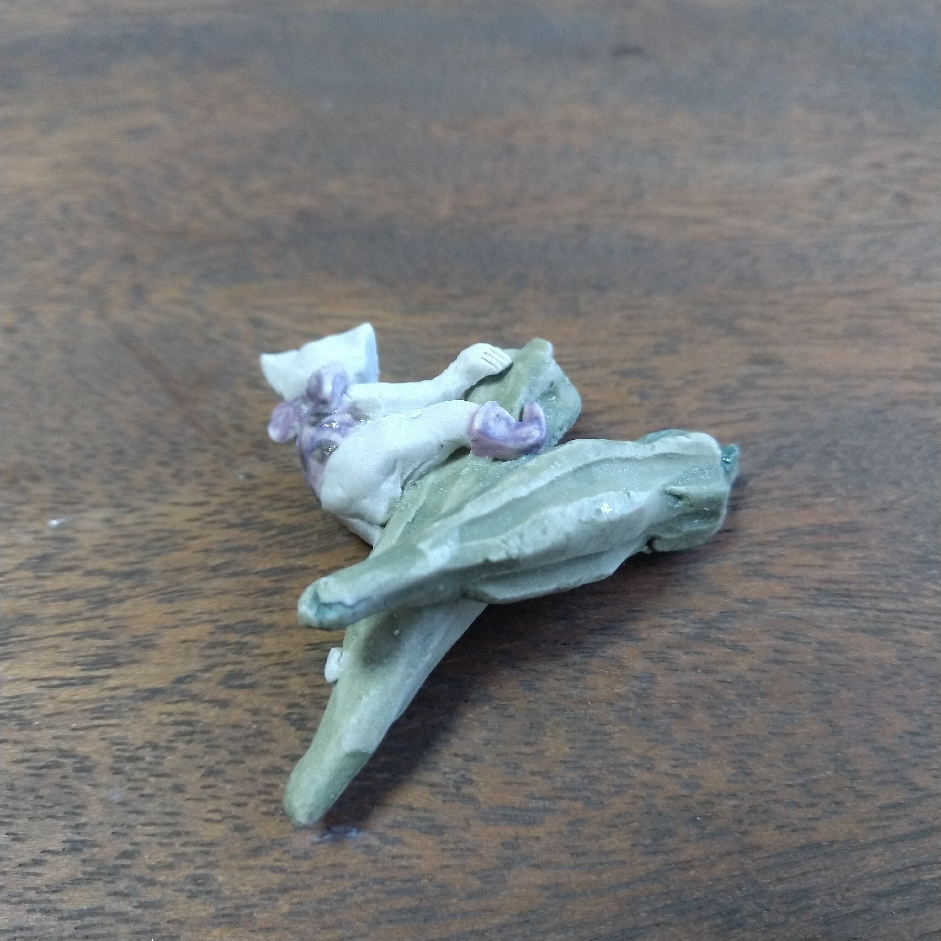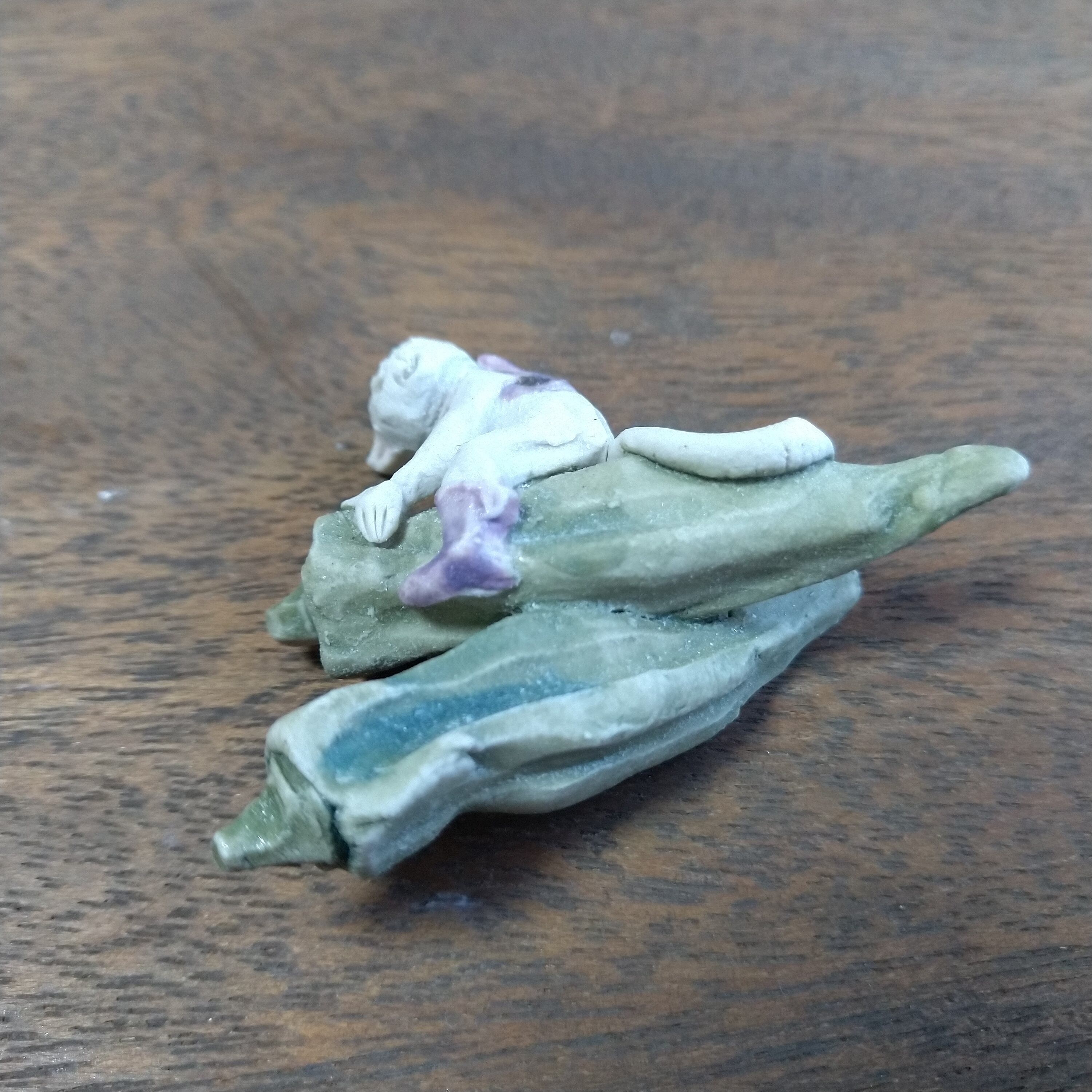 服とオクラの一部分に薄く透明釉を施しているので、その部分は少し光沢があります。