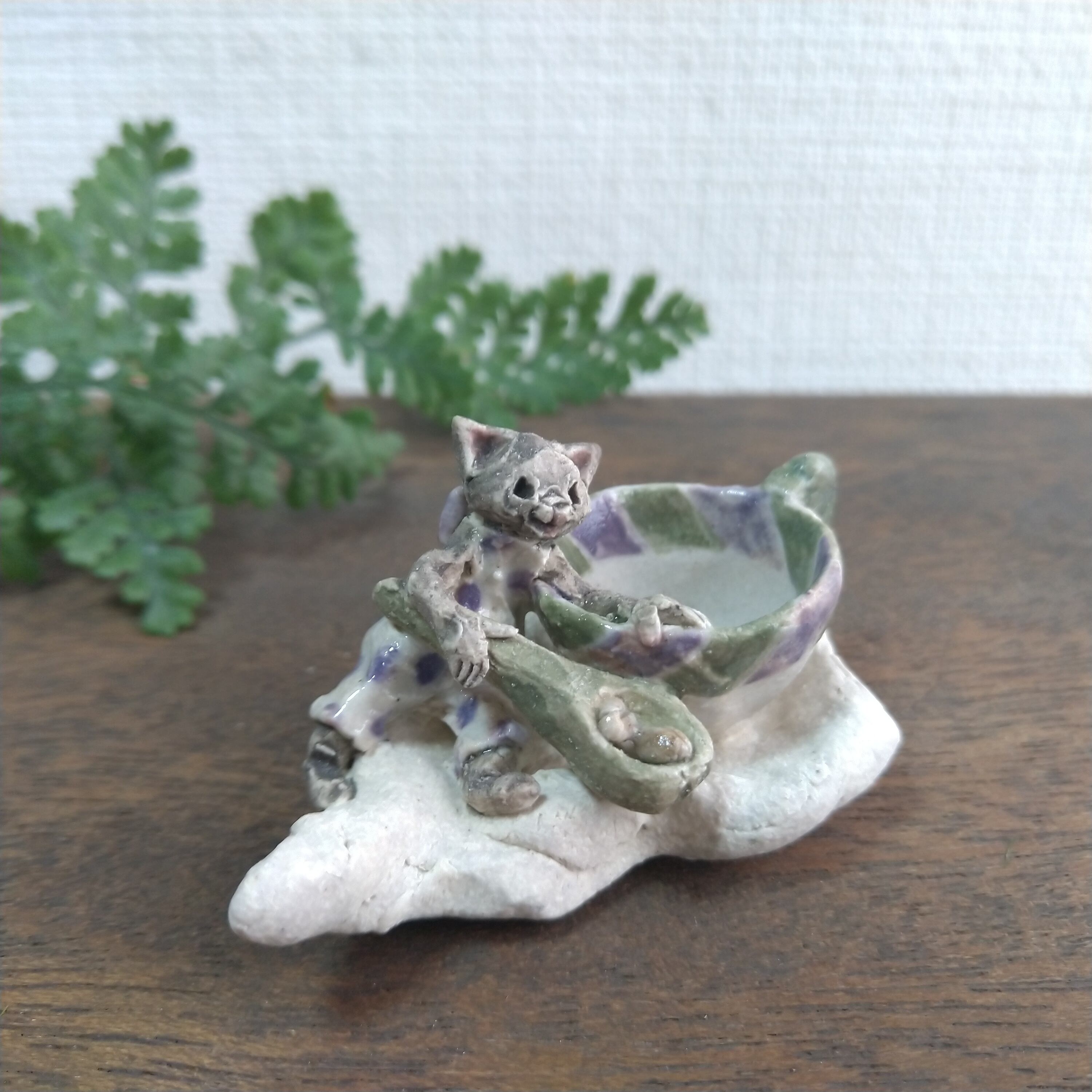 雲形のソーサーに、珈琲豆をのせたスプーンと一緒に黒猫さんがのっかっています。