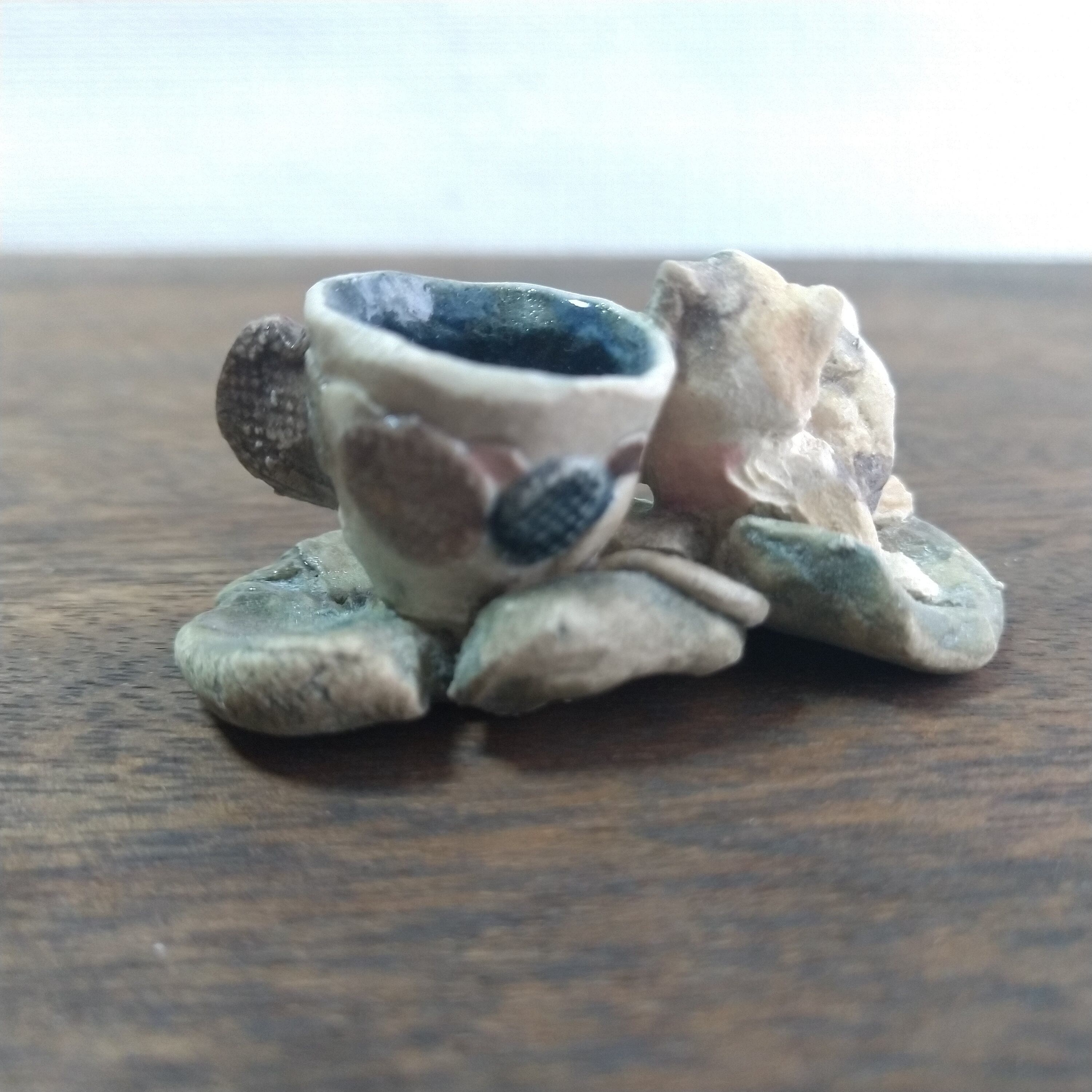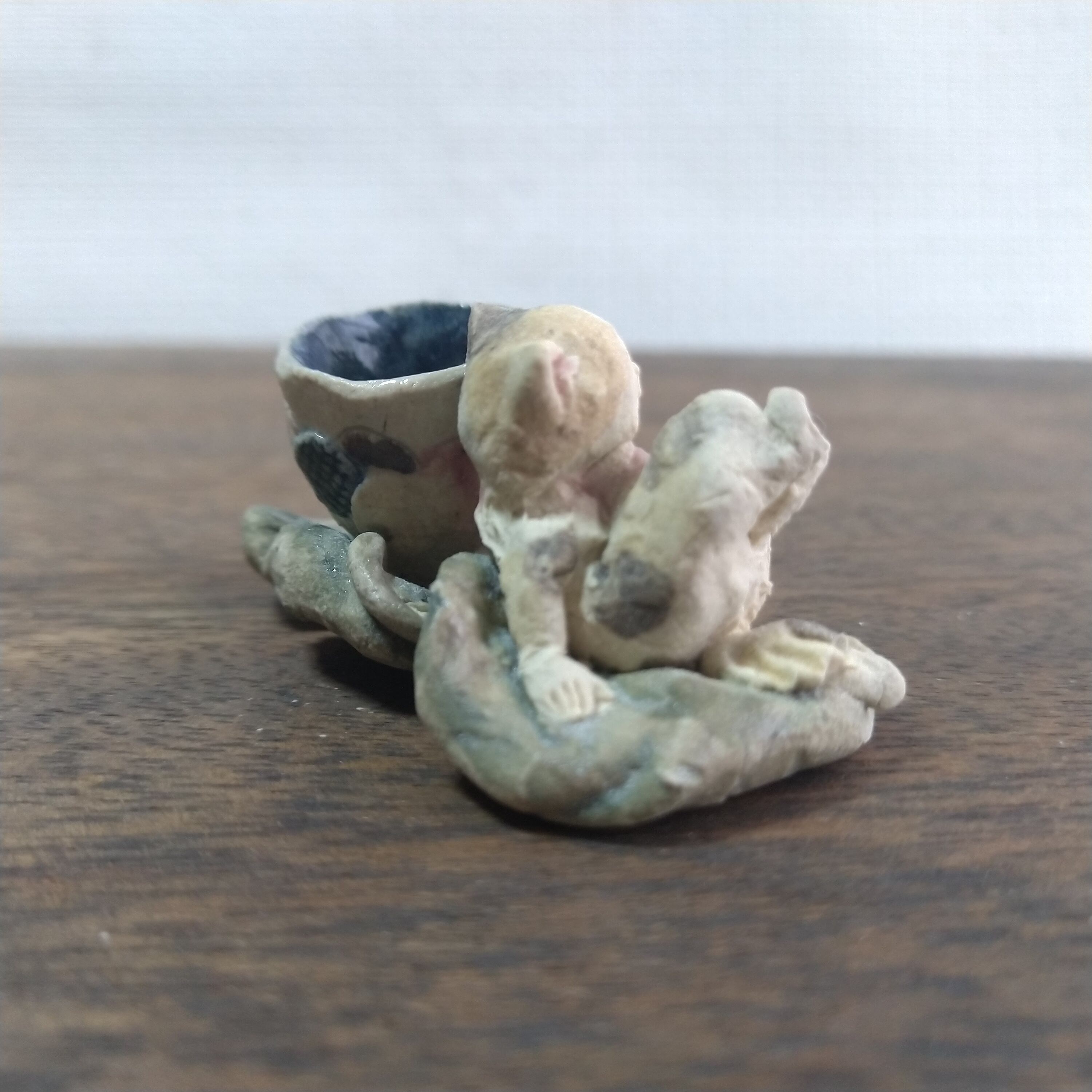 服やカップの一部分に薄く透明釉を施しているので、その部分は少し光沢があります。