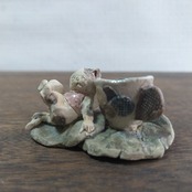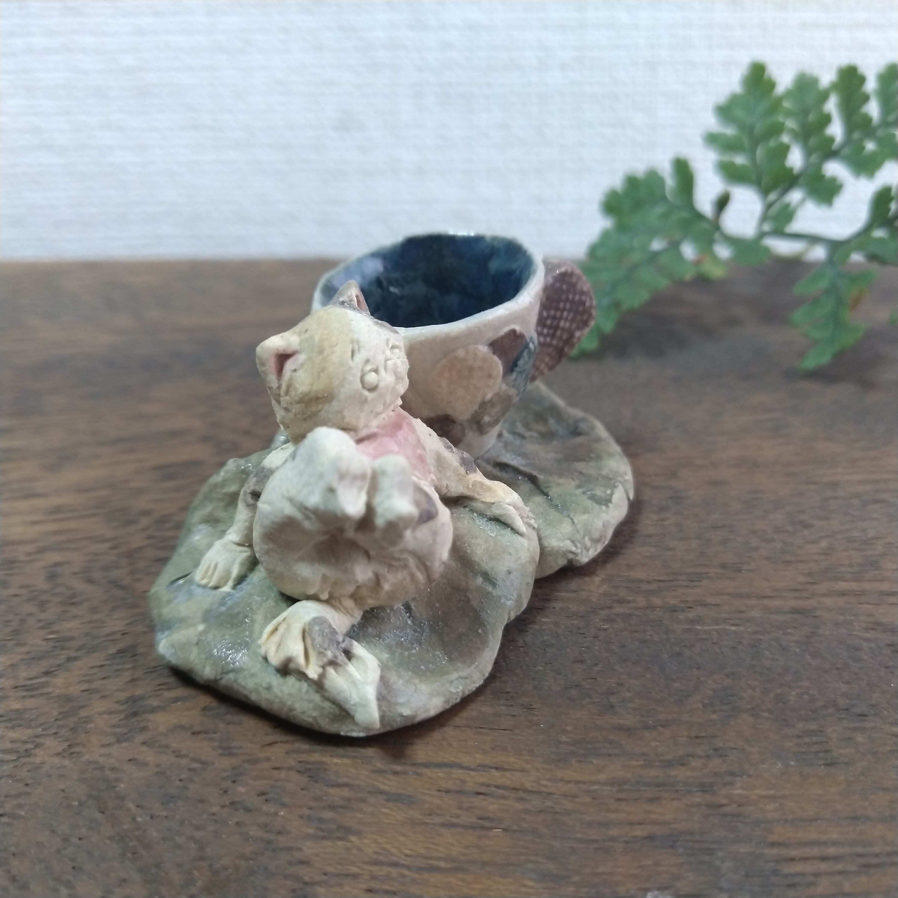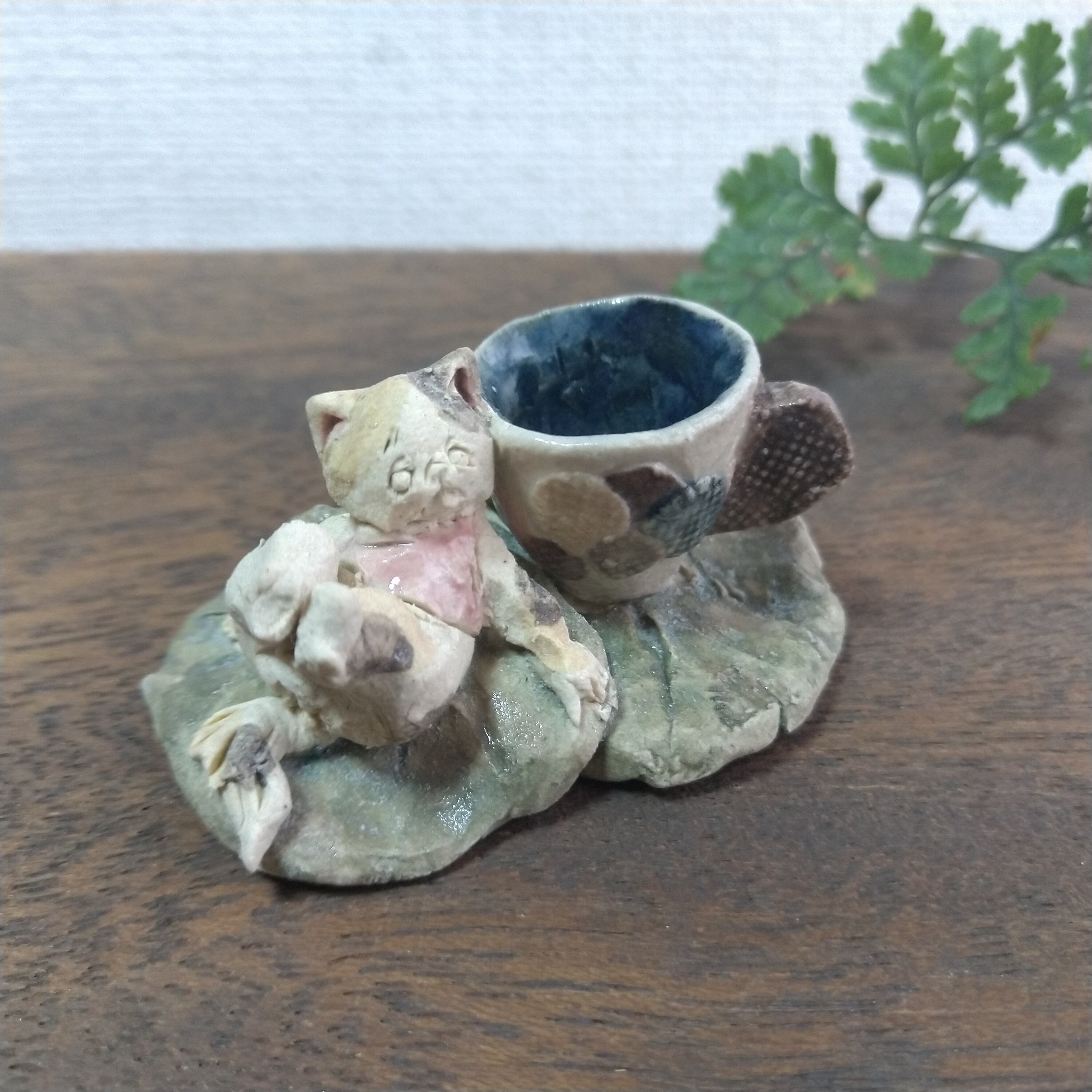 葉っぱ形のソーサーに三毛猫さんがごろりんと寝転んでいます。