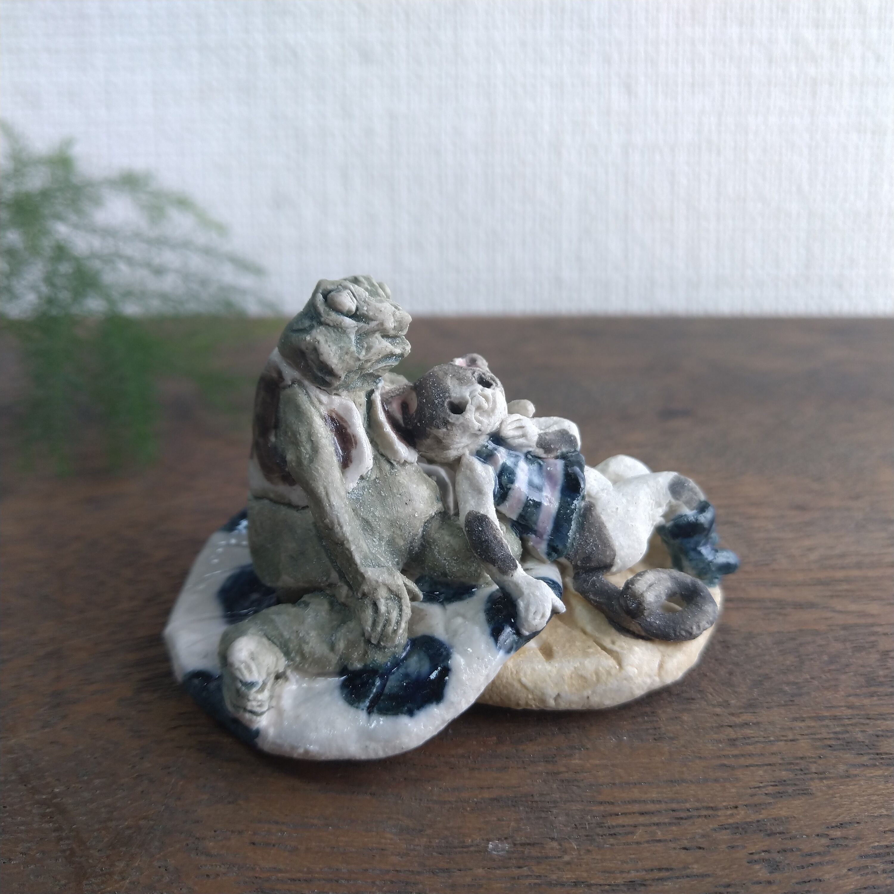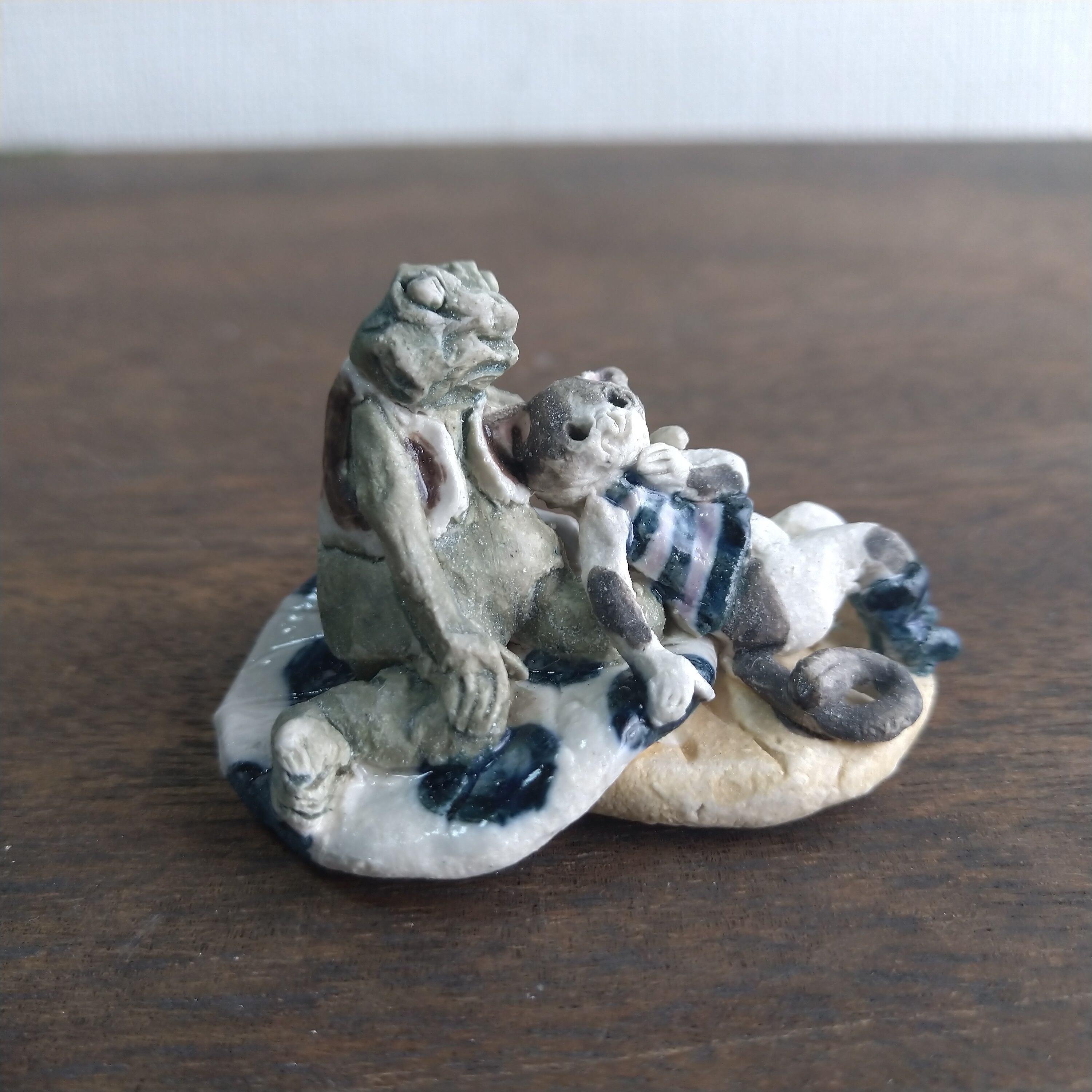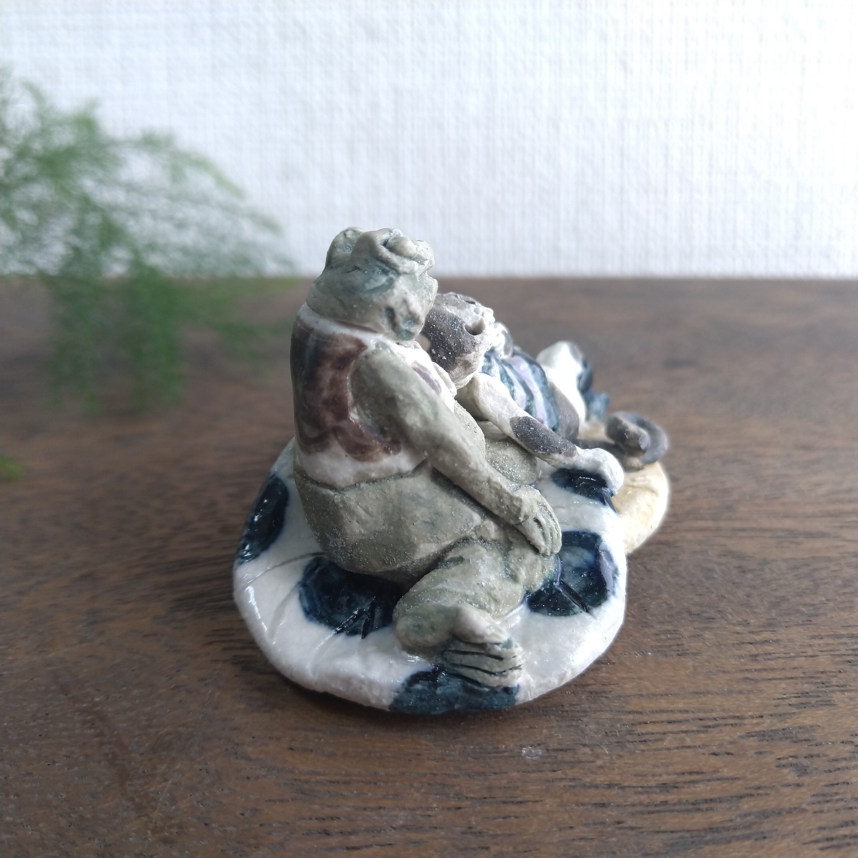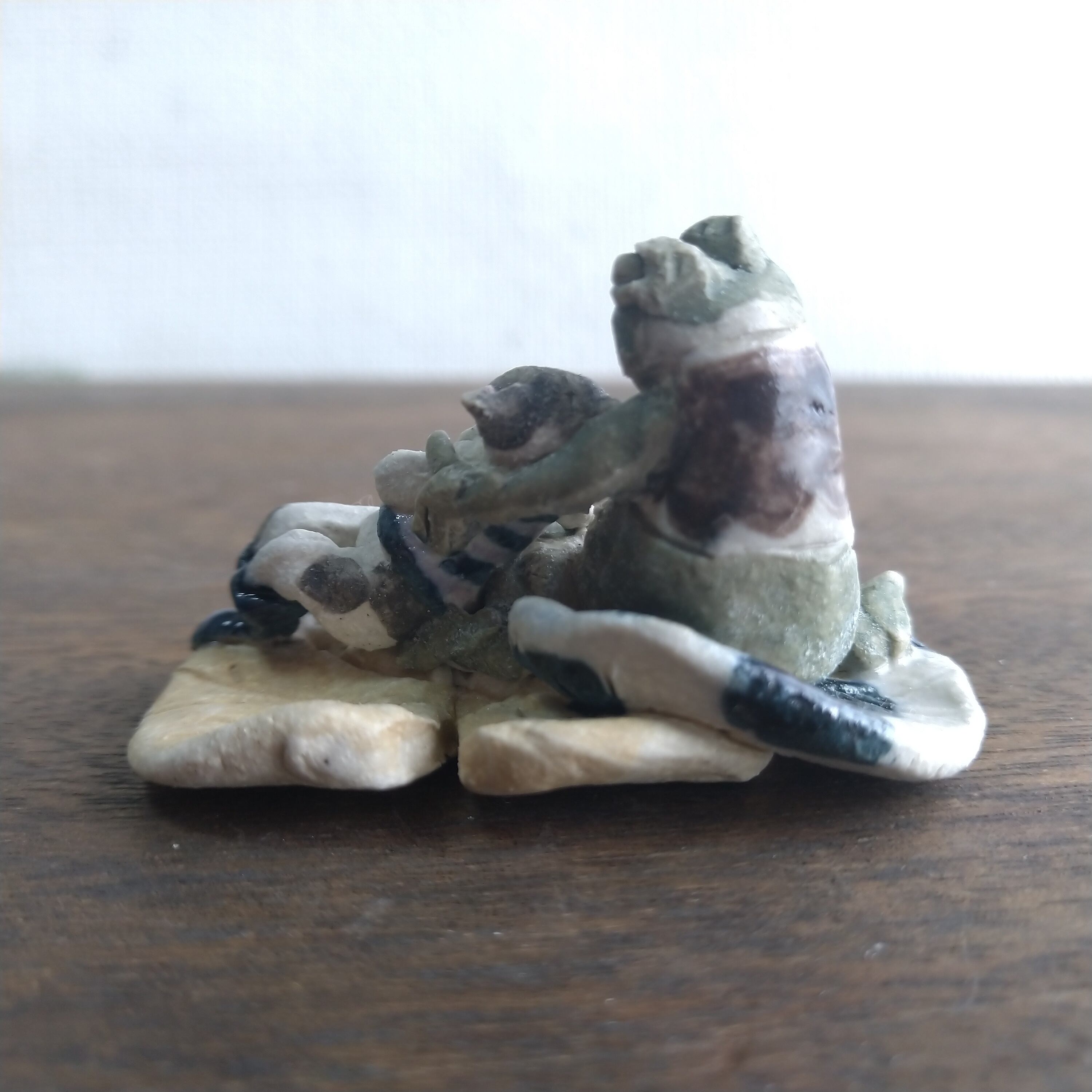 葉っぱや服の一部分に薄く透明釉を施しているので、その部分は少し光沢があります。