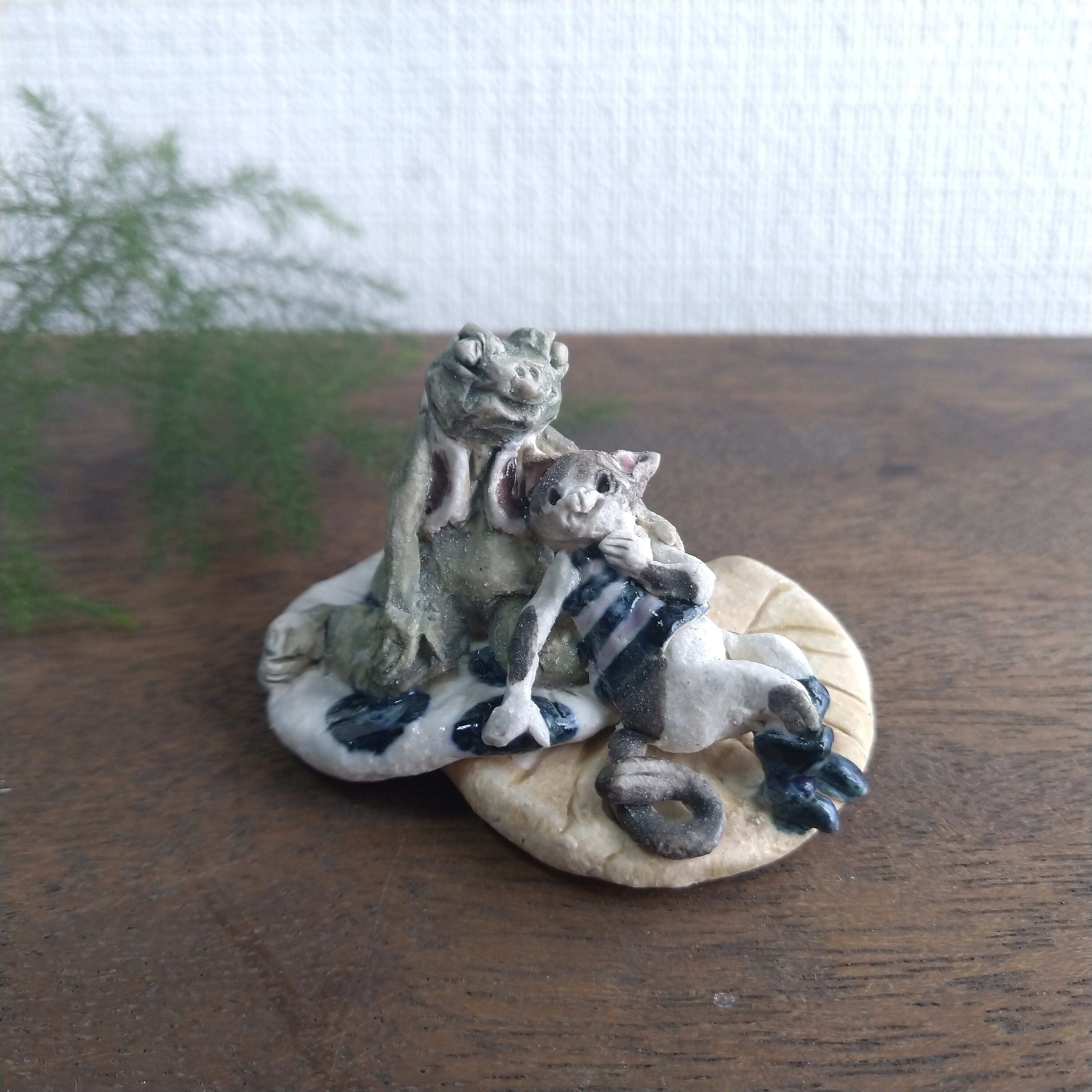 カエルとハチワレ猫さんが仲良く葉っぱの上に座っています。