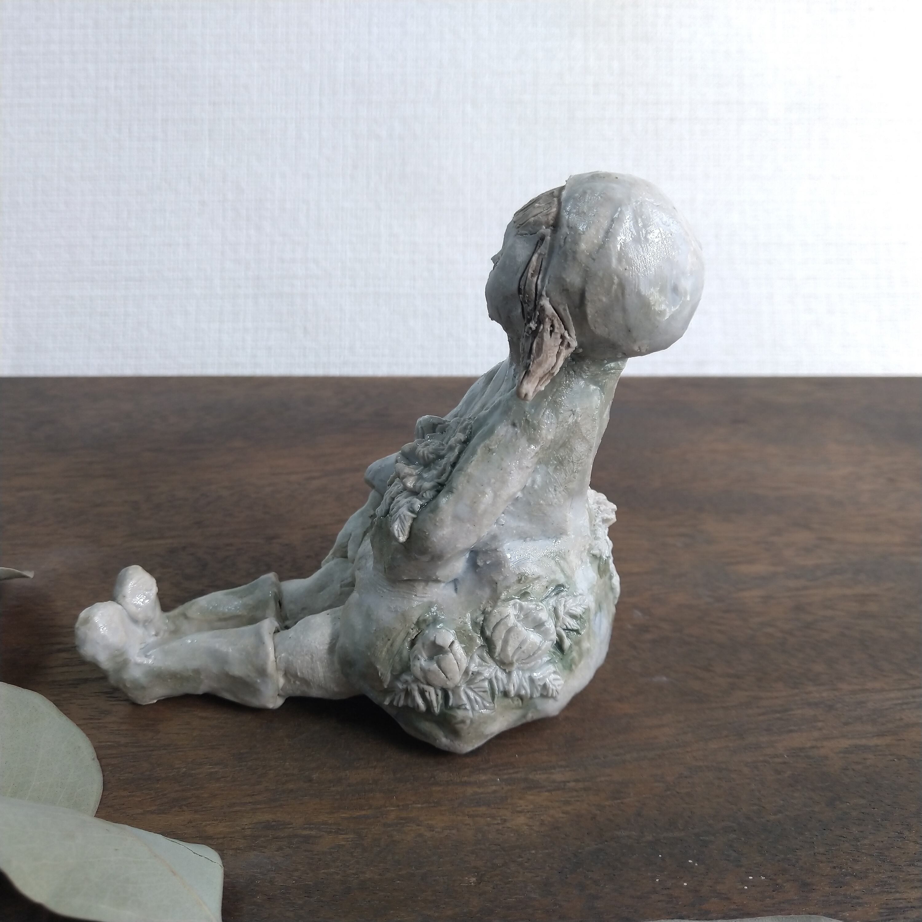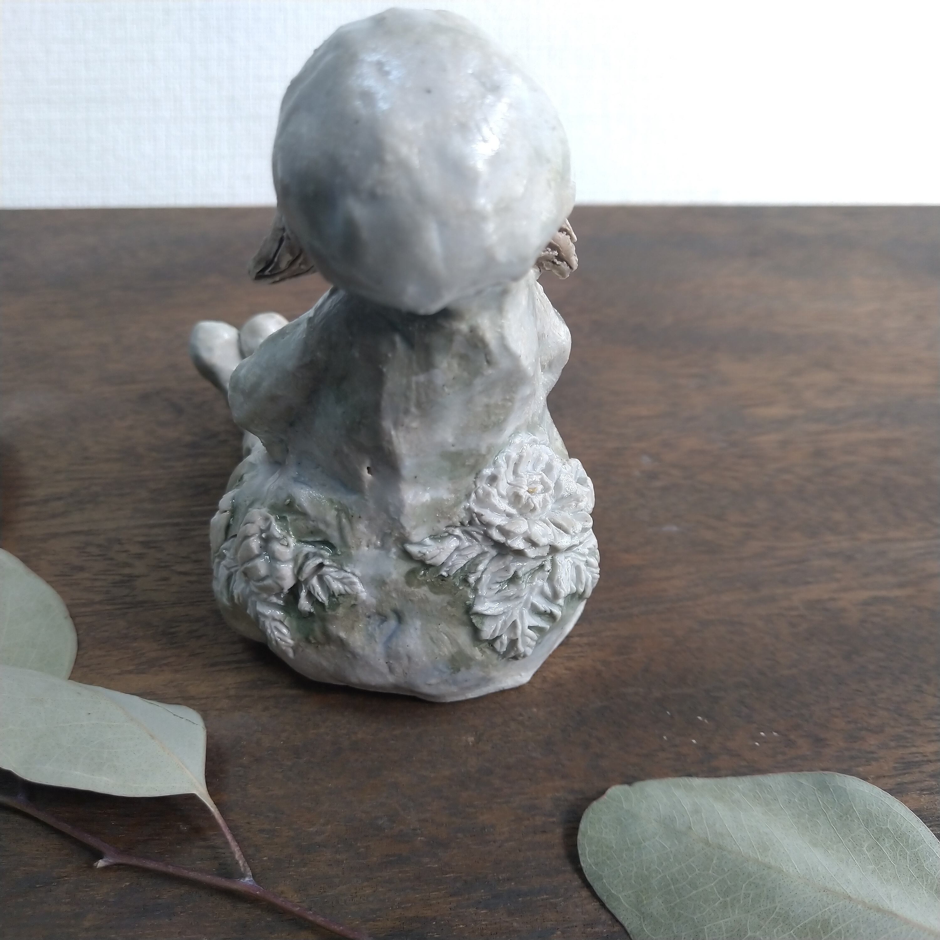 衣装の一部分には薄く透明釉を施しているので、その部分は少し光沢があります。