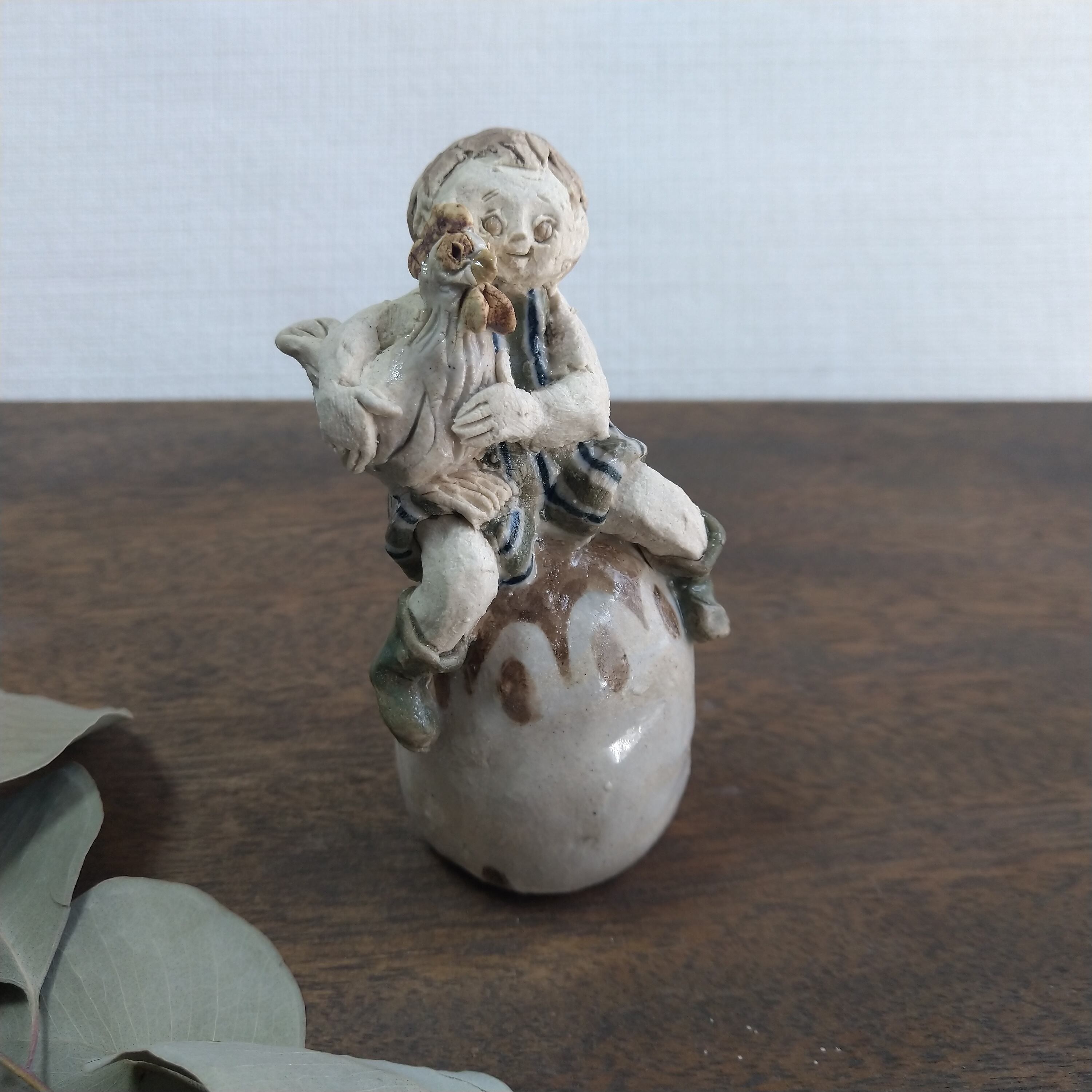 鶏を抱っこしたちびっこが、卵型の土台にお座りしています。
