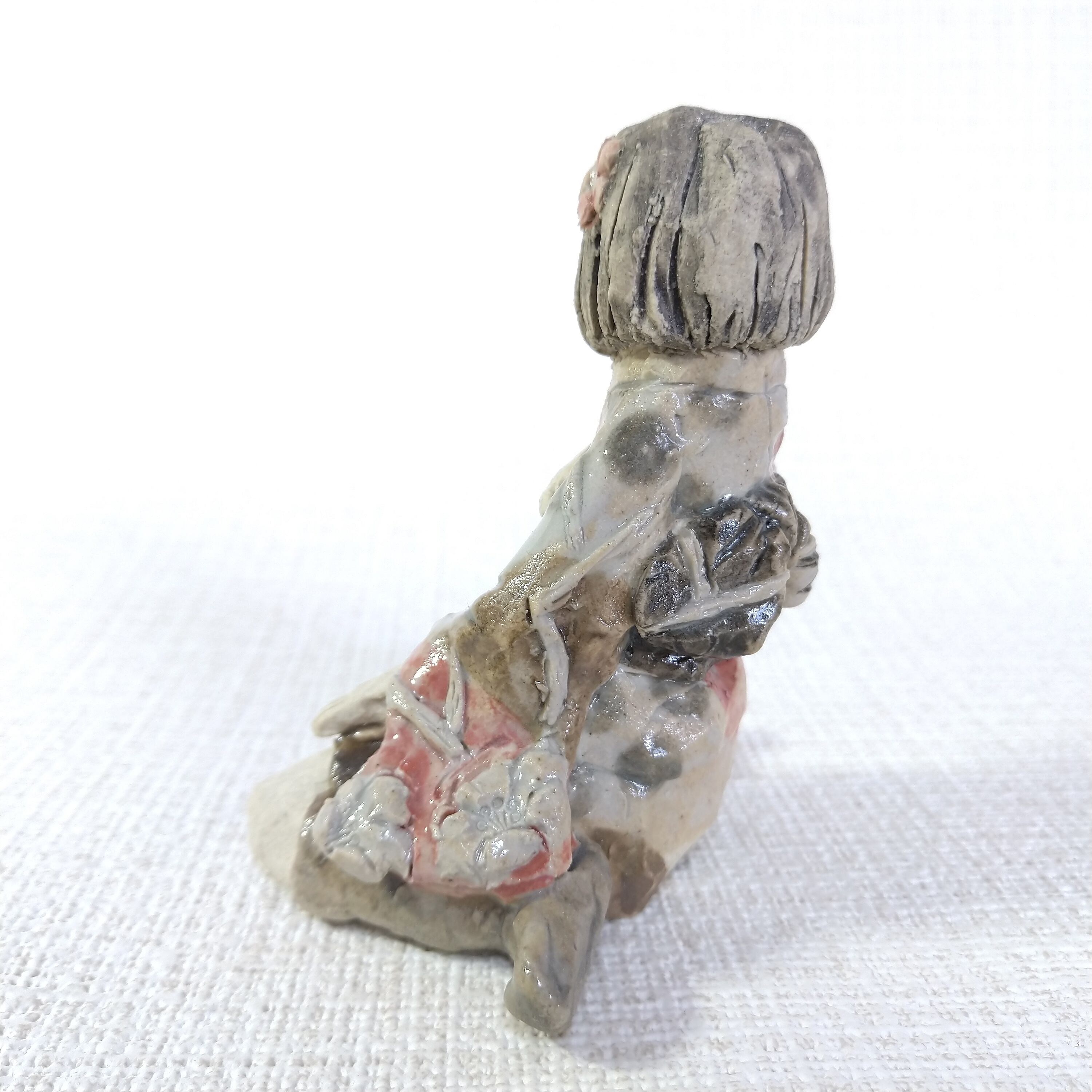 衣装の一部分には薄く透明釉を施しているので、その部分は少し光沢があります。
