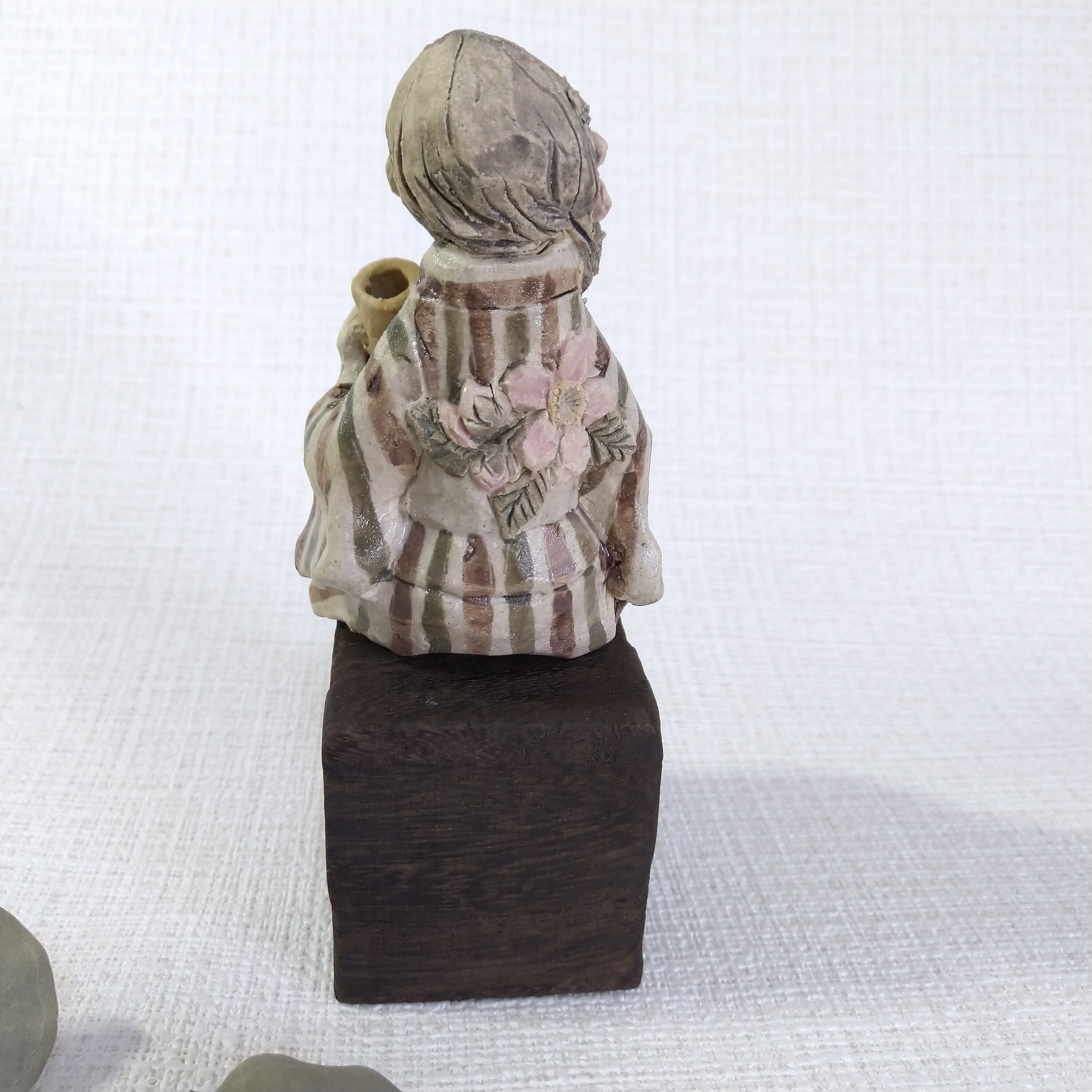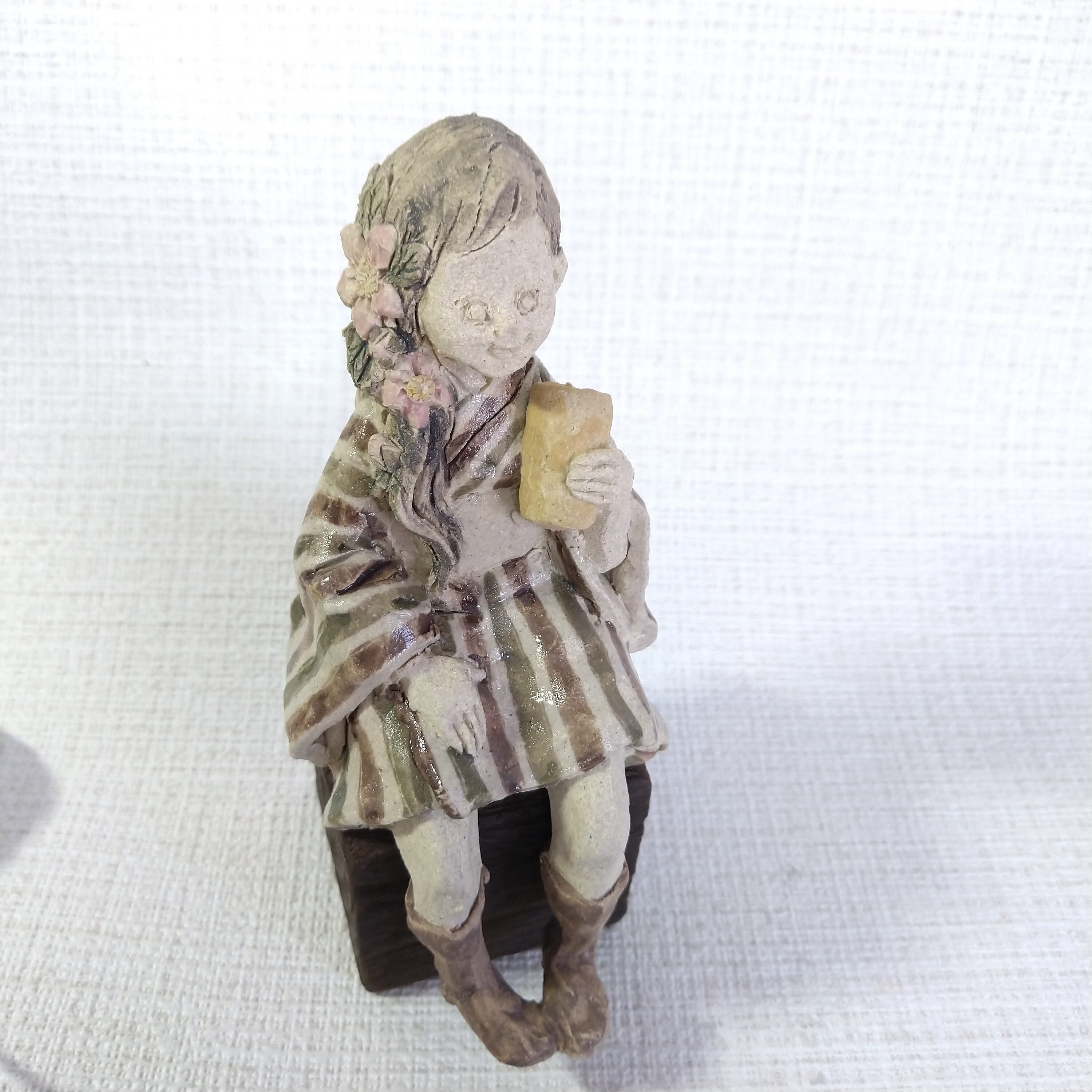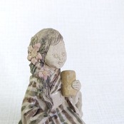 衣装の一部分には薄く透明釉を施しているので、その部分は少し光沢があります。