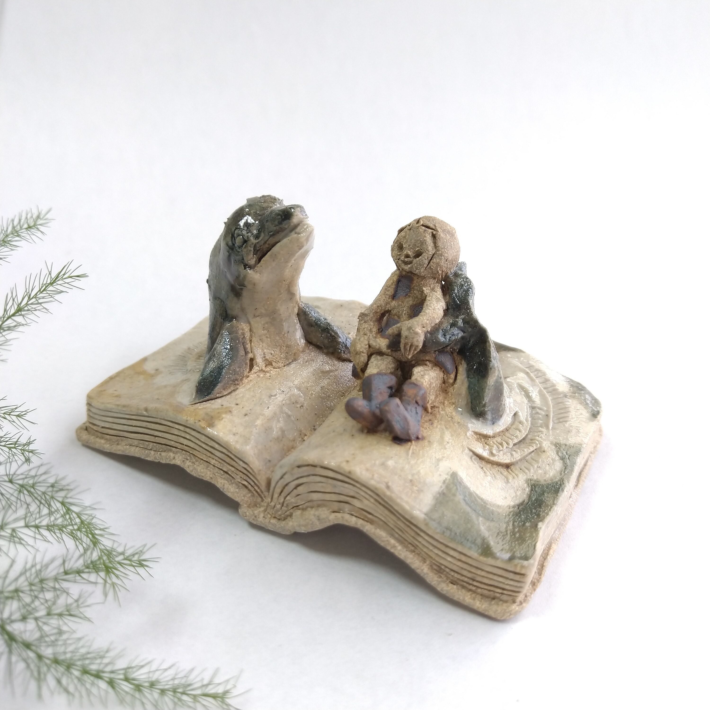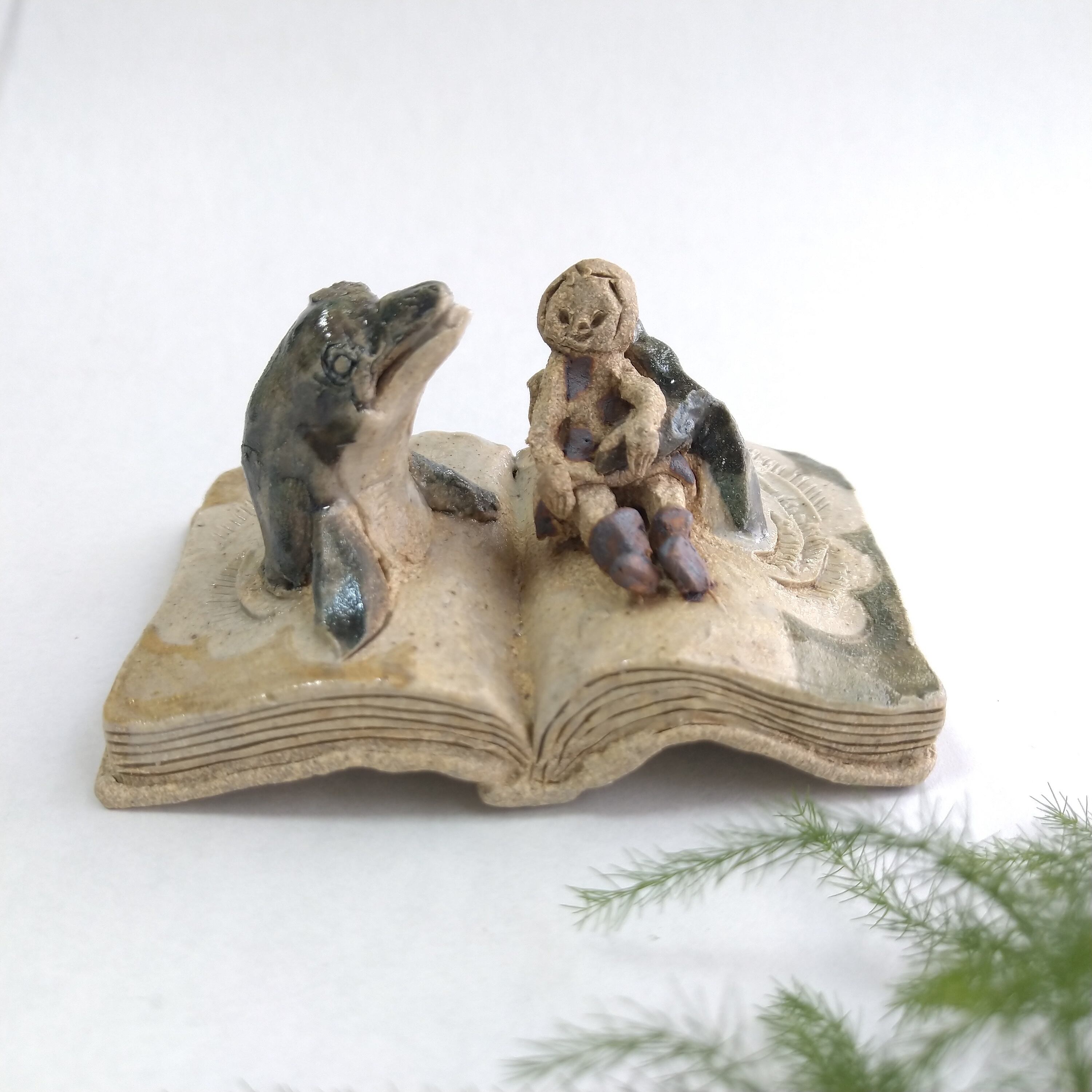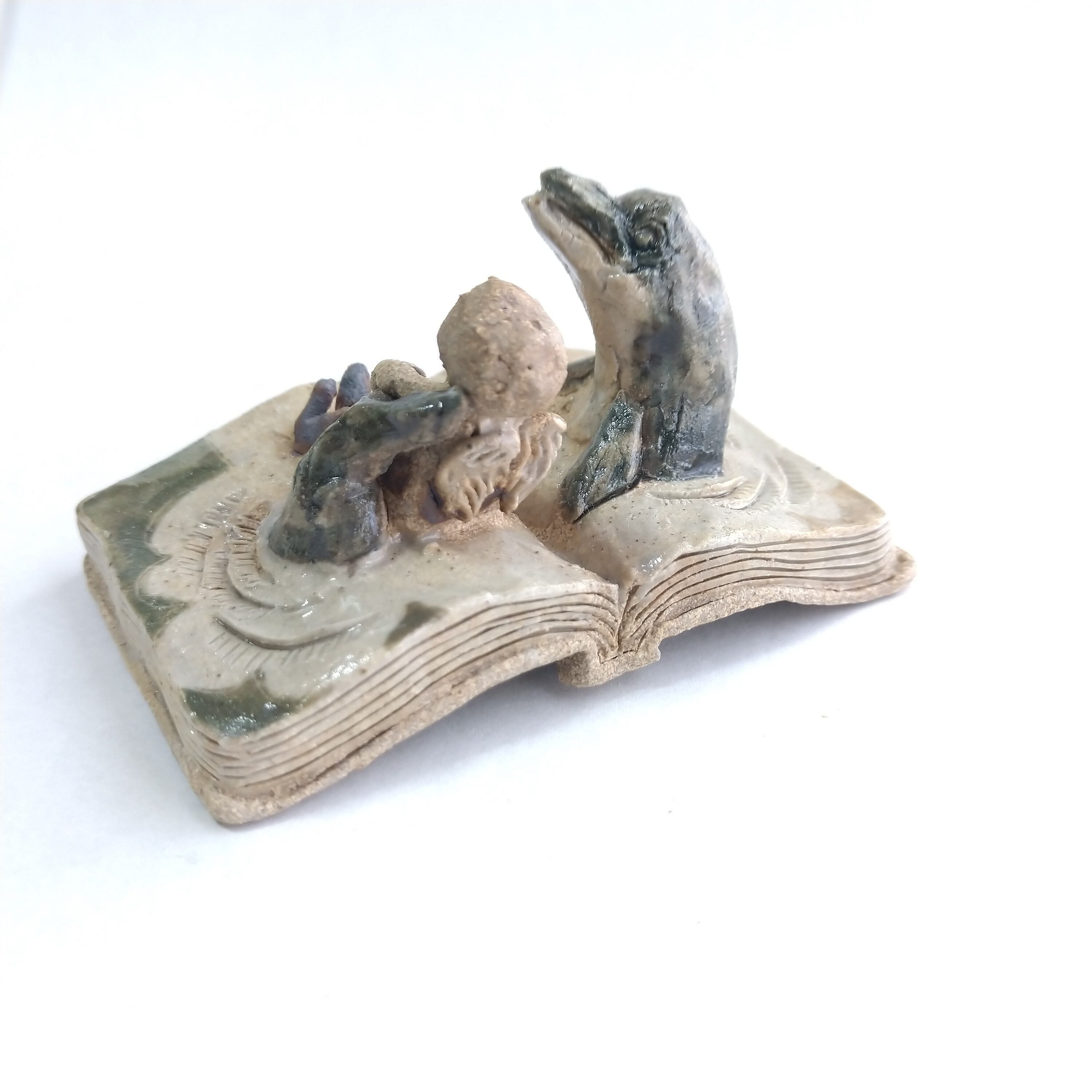 本やイルカの身体、羽根の一部に薄く透明釉を施しているので、その部分は少し光沢があります。
