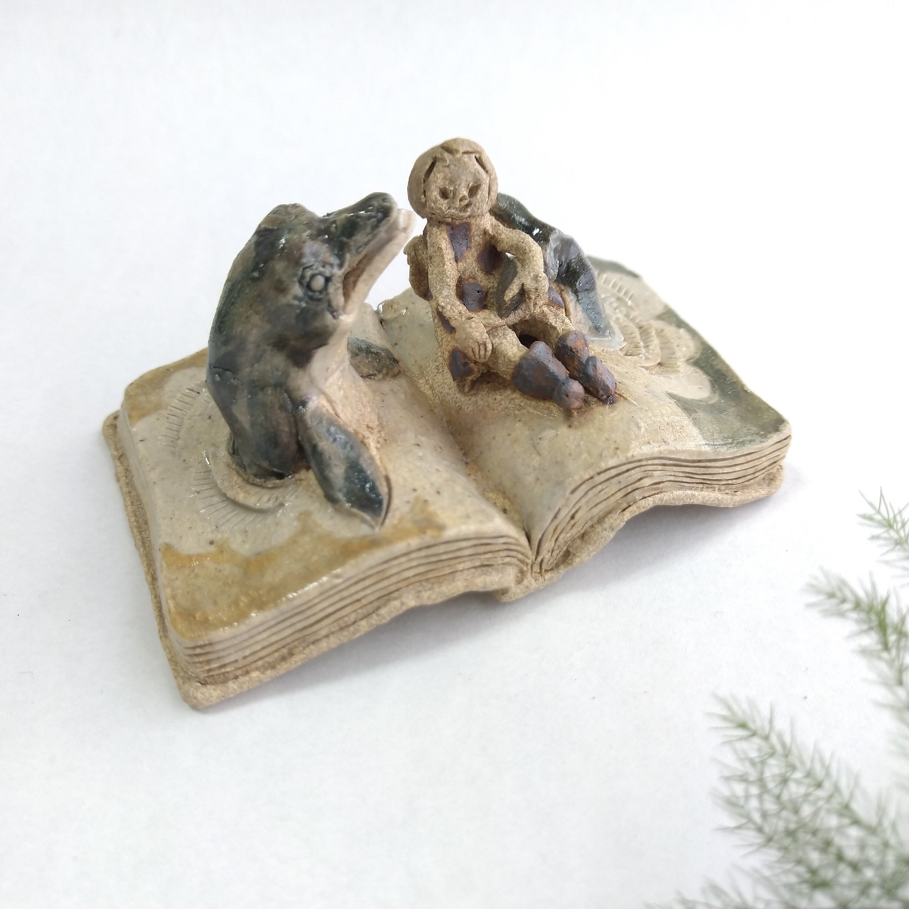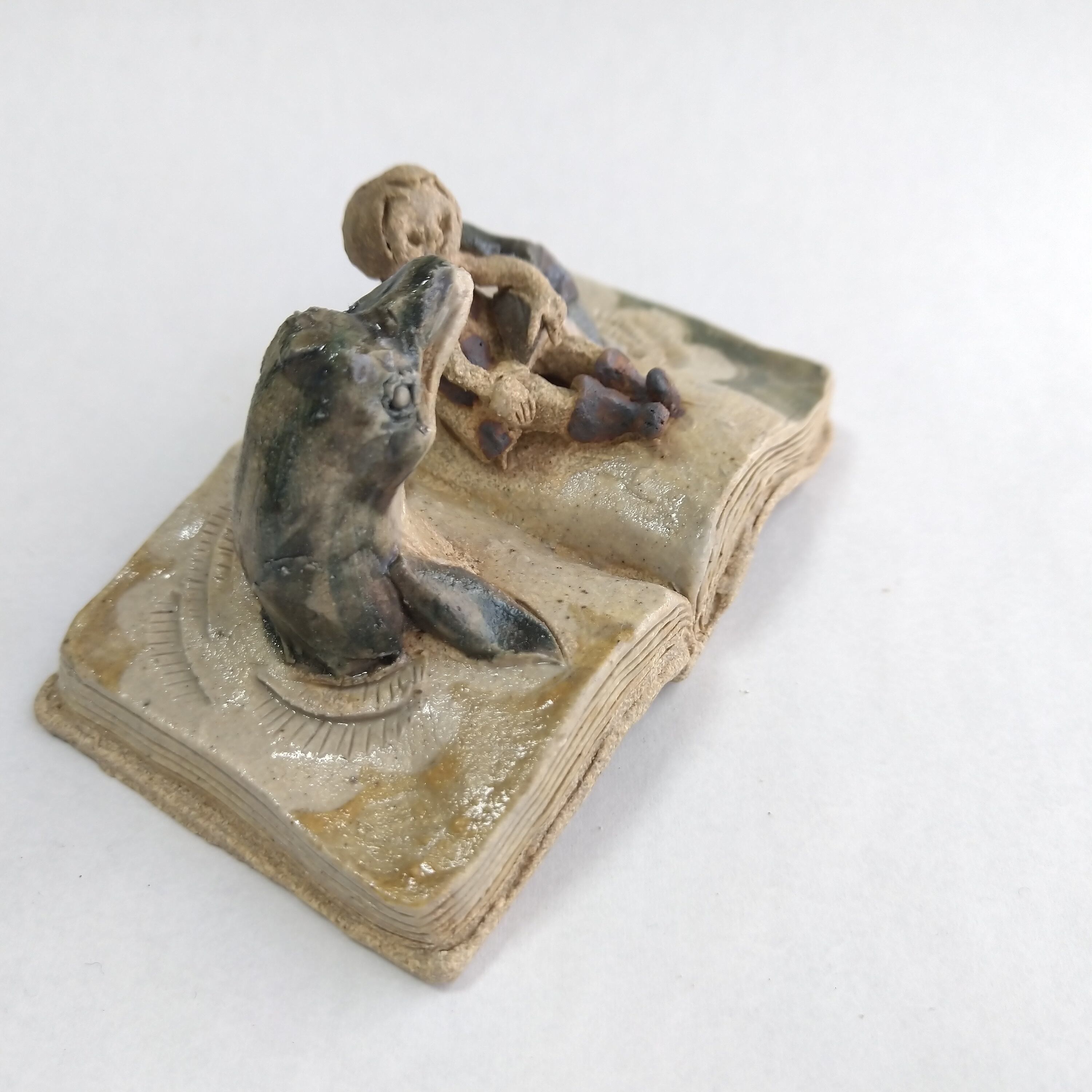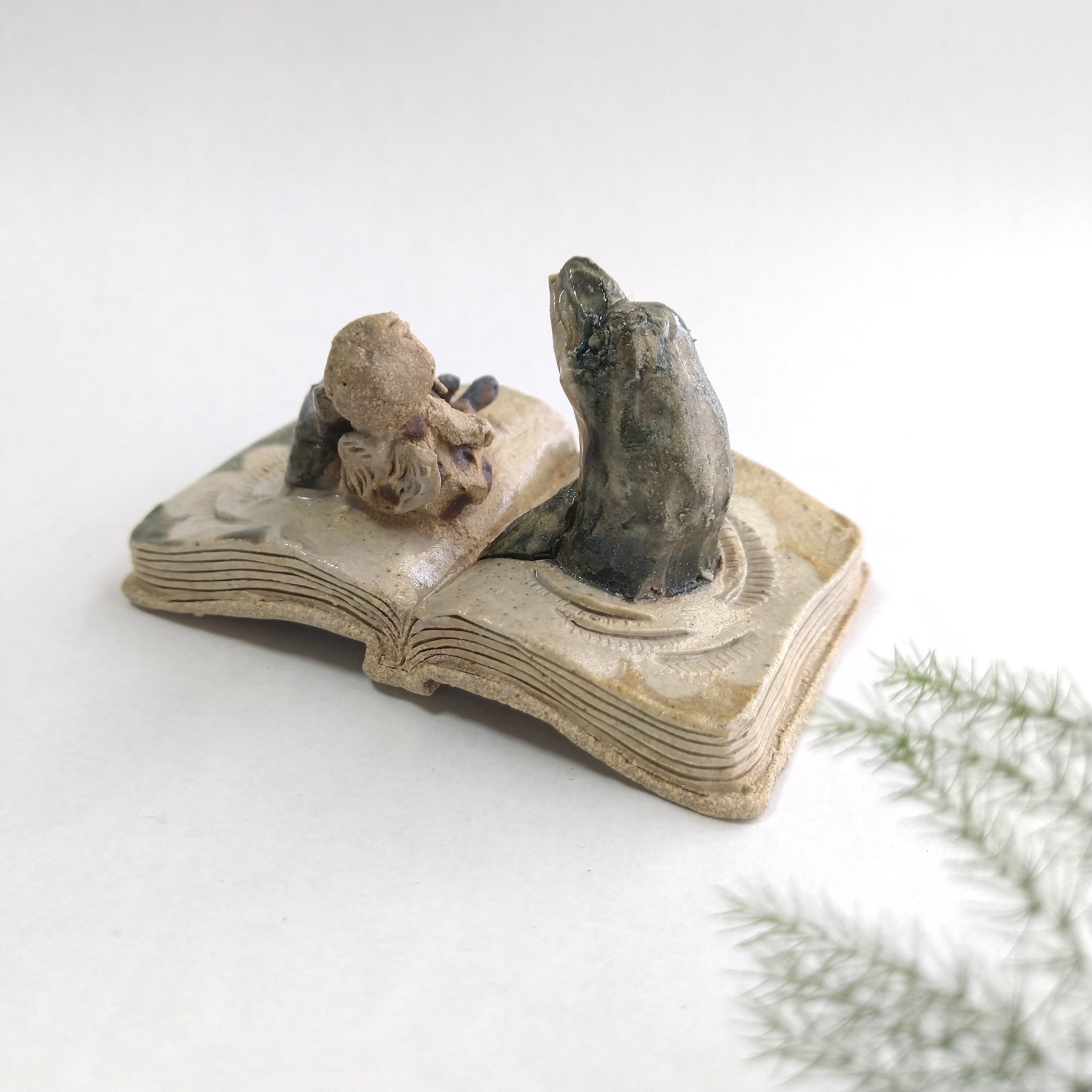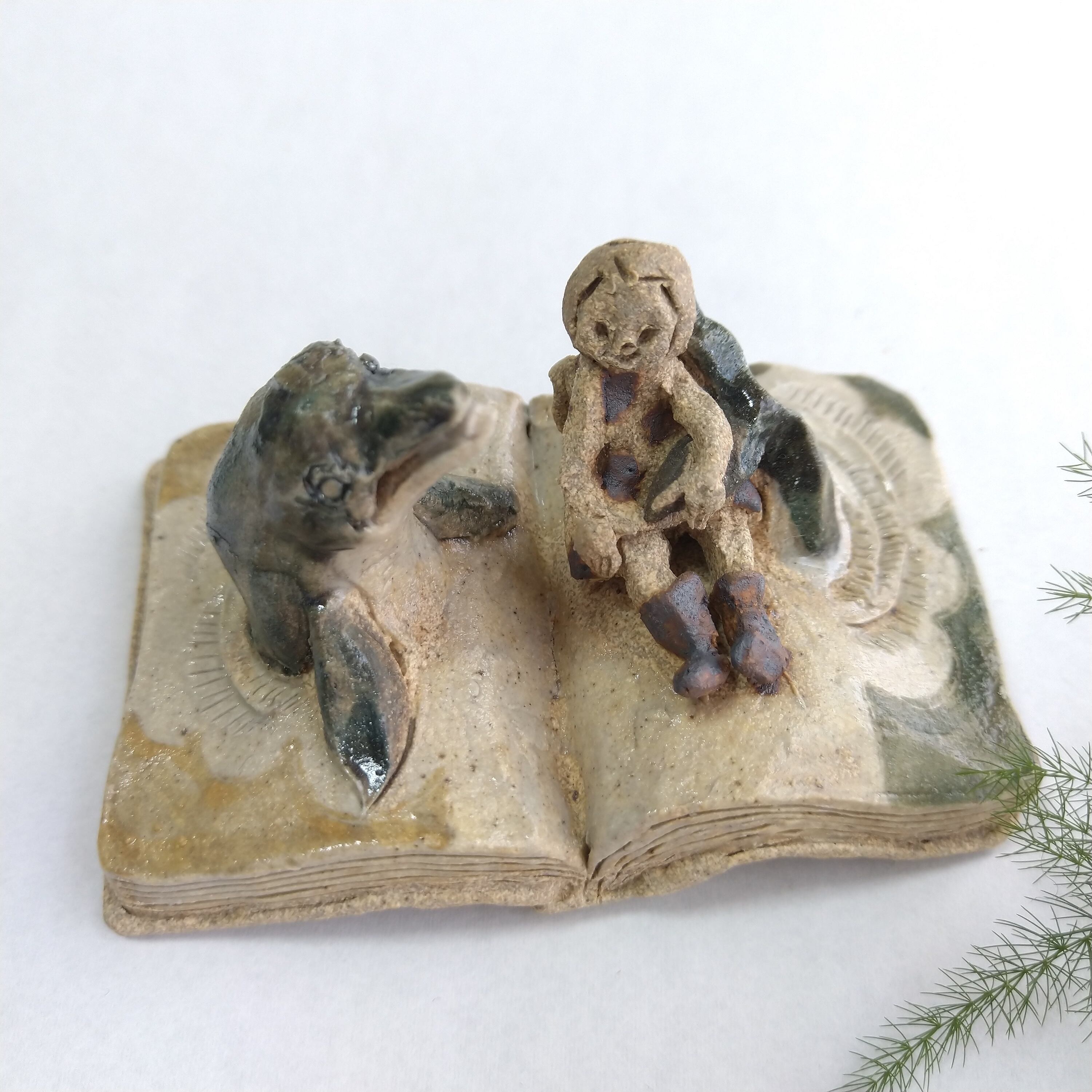 本やイルカの身体、羽根の一部に薄く透明釉を施しているので、その部分は少し光沢があります。