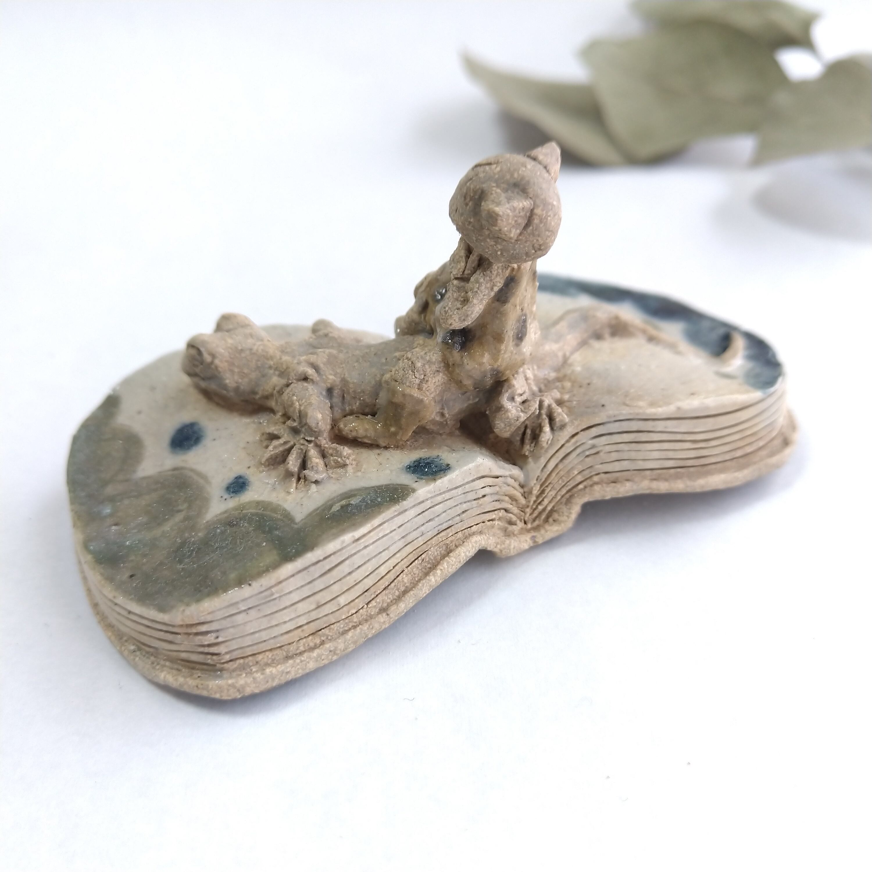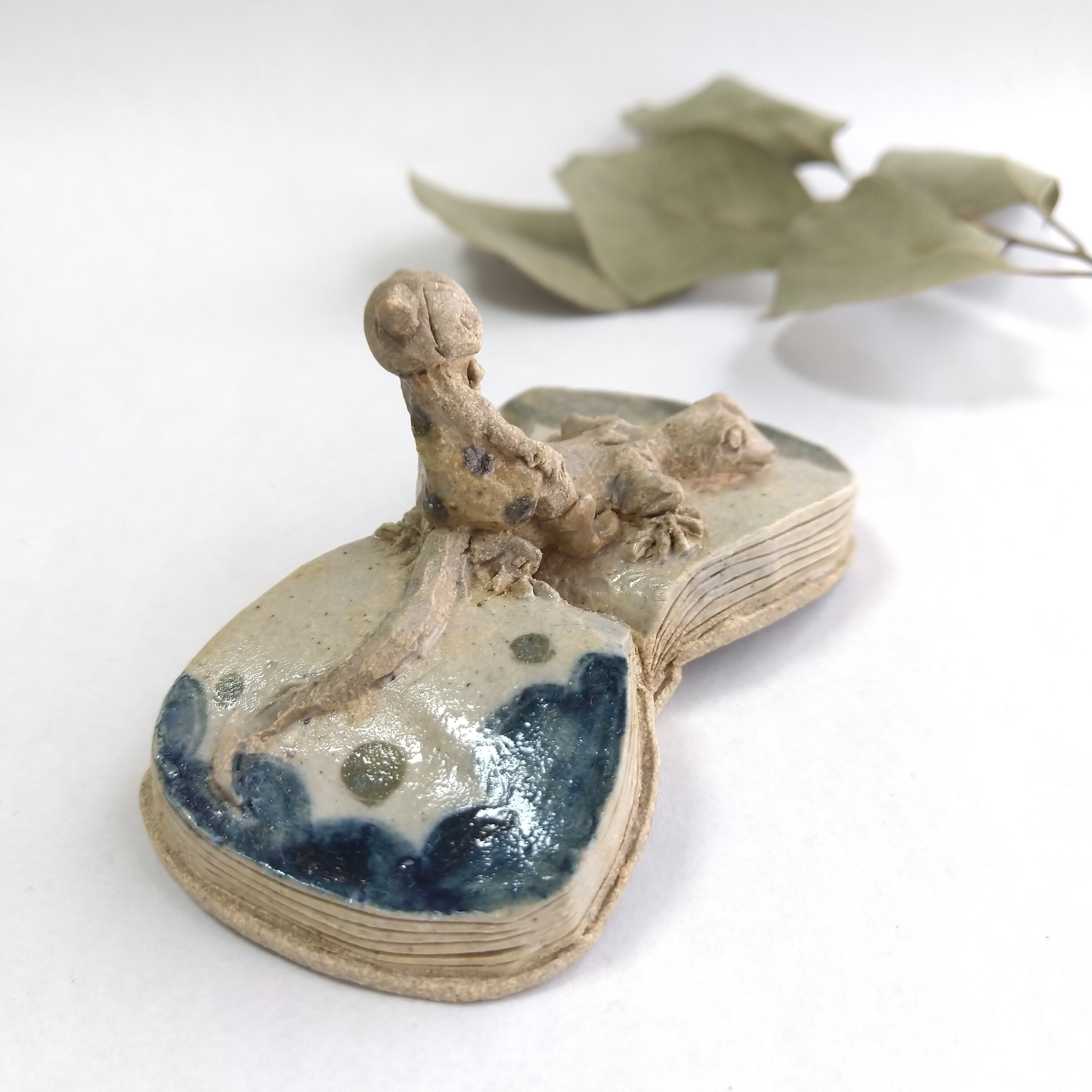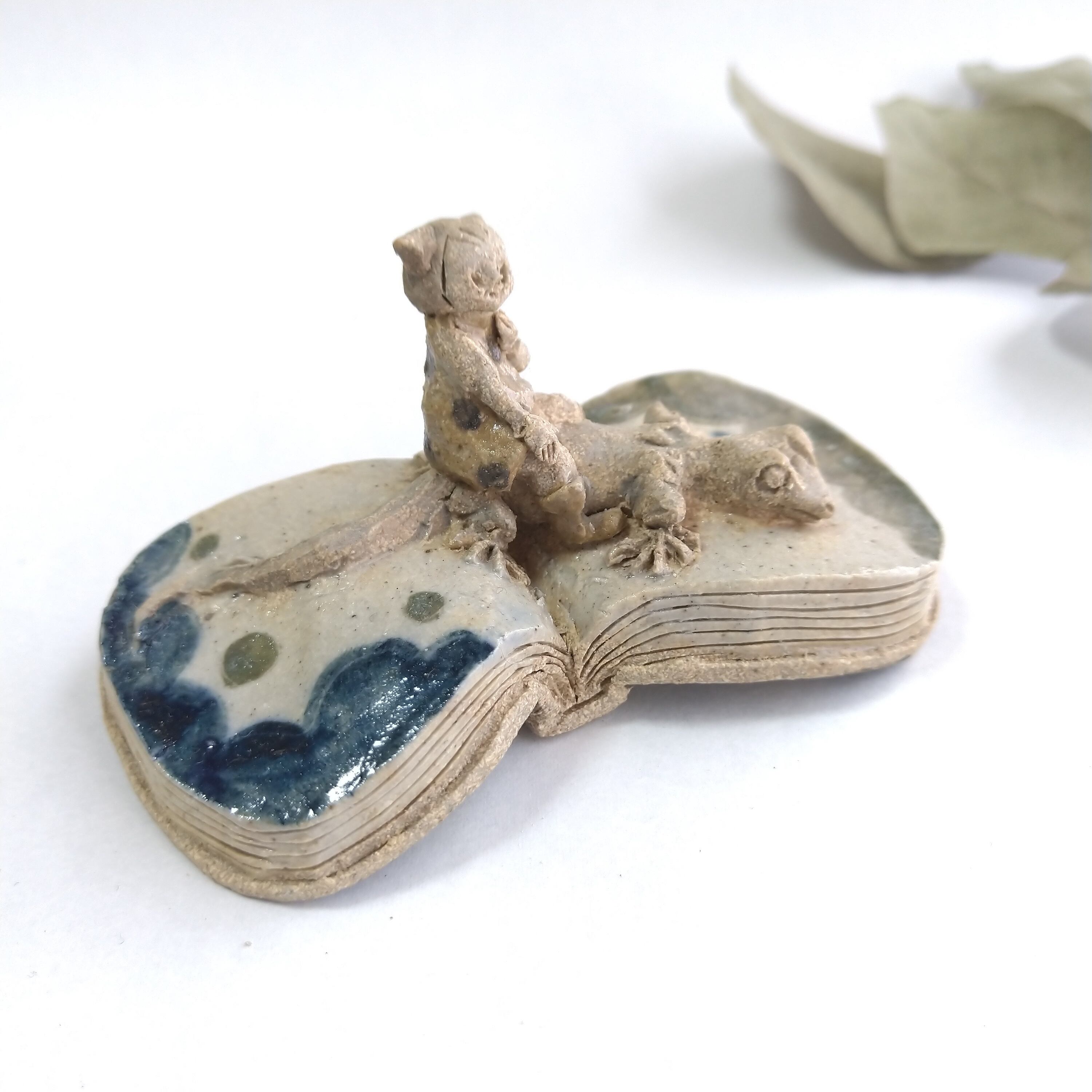 本や衣装の一部に薄く透明釉を施しているので、その部分は少し光沢があります。