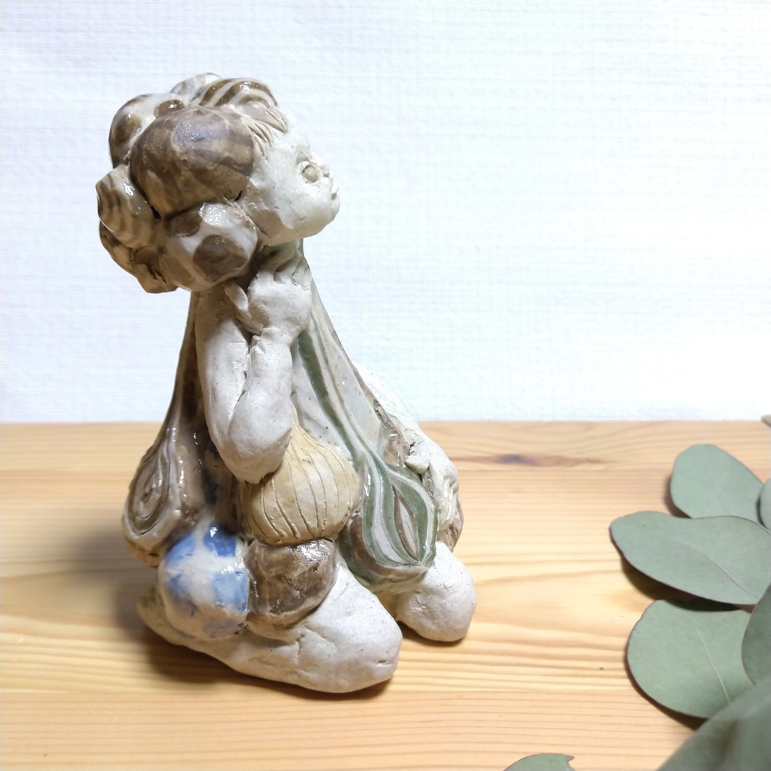 瞳や衣装の一部分にポイントで薄く透明釉をかけているので、その部分は少し光沢があります。