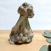 衣服の部分にはレリーフ技法を用いて、陶土での成形中に平面上に形態を盛り上げて起伏を与えたり、平面を彫り込んだりして、立体的な模様をデザインしています。
